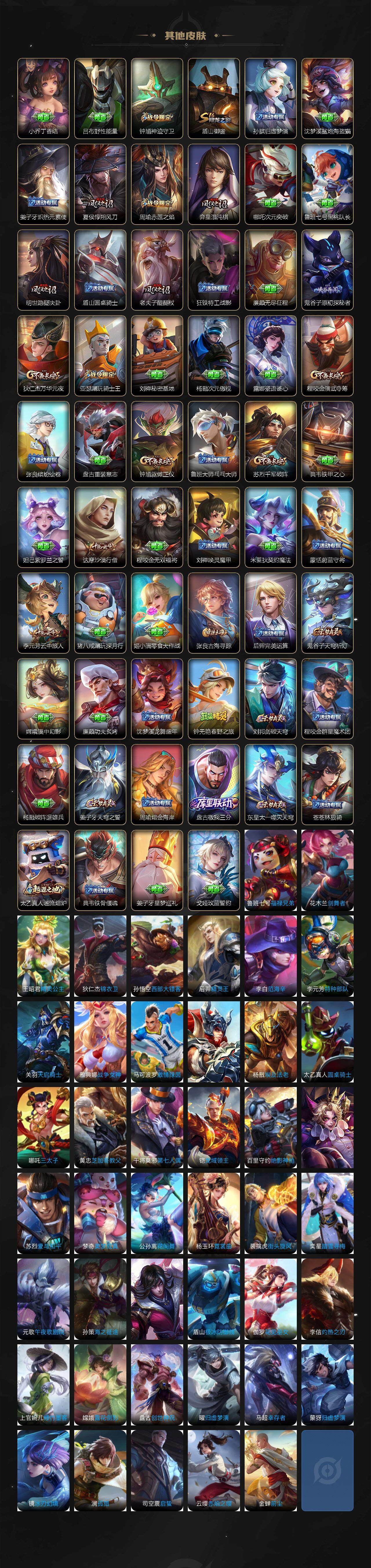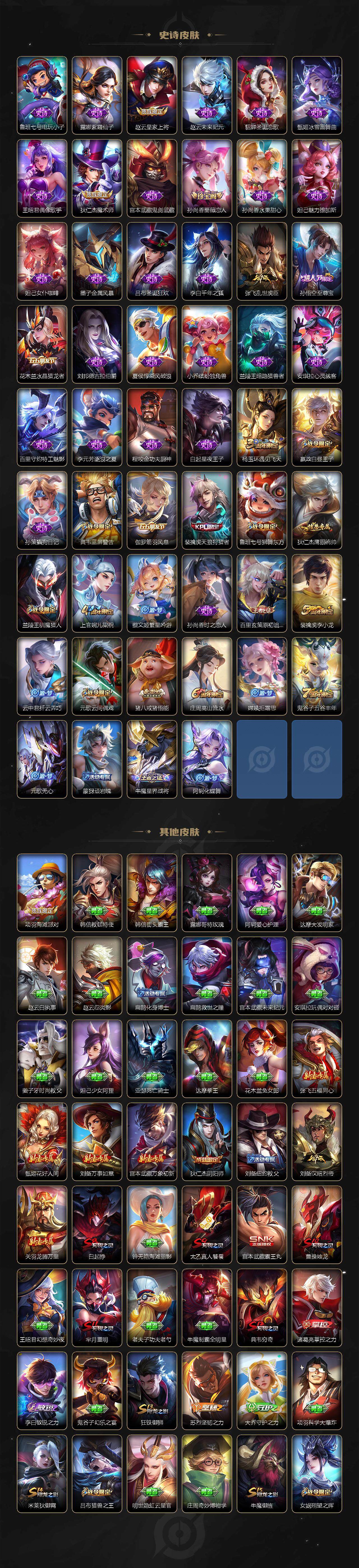 【限定皮肤】:白起狰,蒙犽顽岩魄,姜子牙天穹之誓,杨戬破阵退雄兵,狄仁杰阴阳师,赵云皇家上将,嬴政白昼王子,孙尚香蔷薇恋人,鲁班七号狮舞东方,庄周高山流水,芈月重明,吕布猎兽之王,周瑜赤莲之焰,元歌云间偶戏,元歌无心