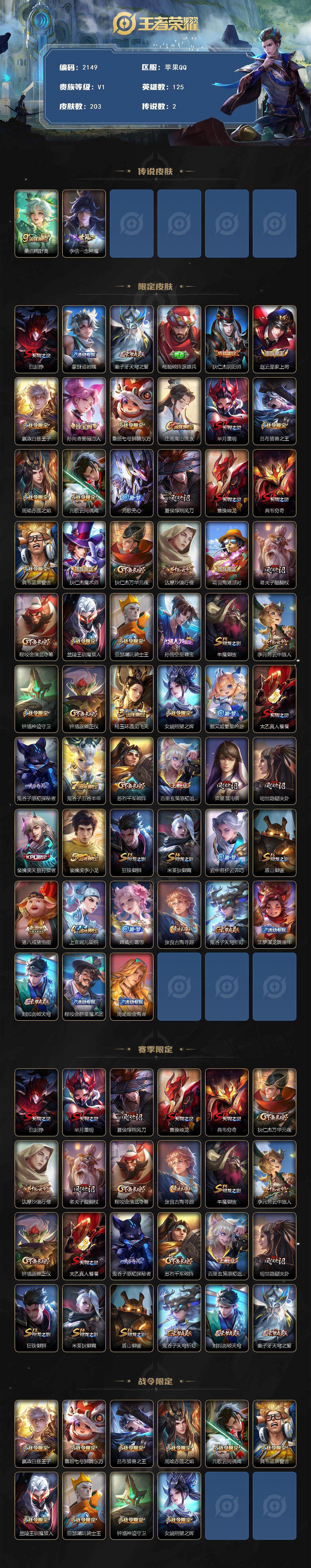王者荣耀【苹果QQ】苹果Q-V1-至尊星耀V段位-125英雄-203皮肤-0典藏-0珍品无双-0无
