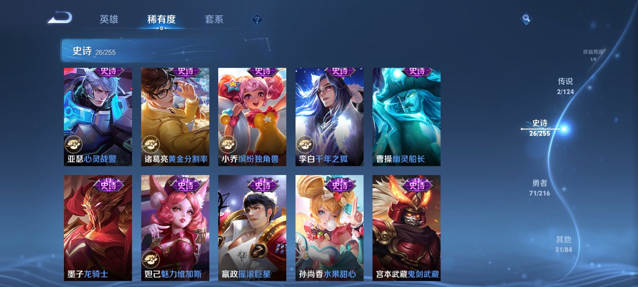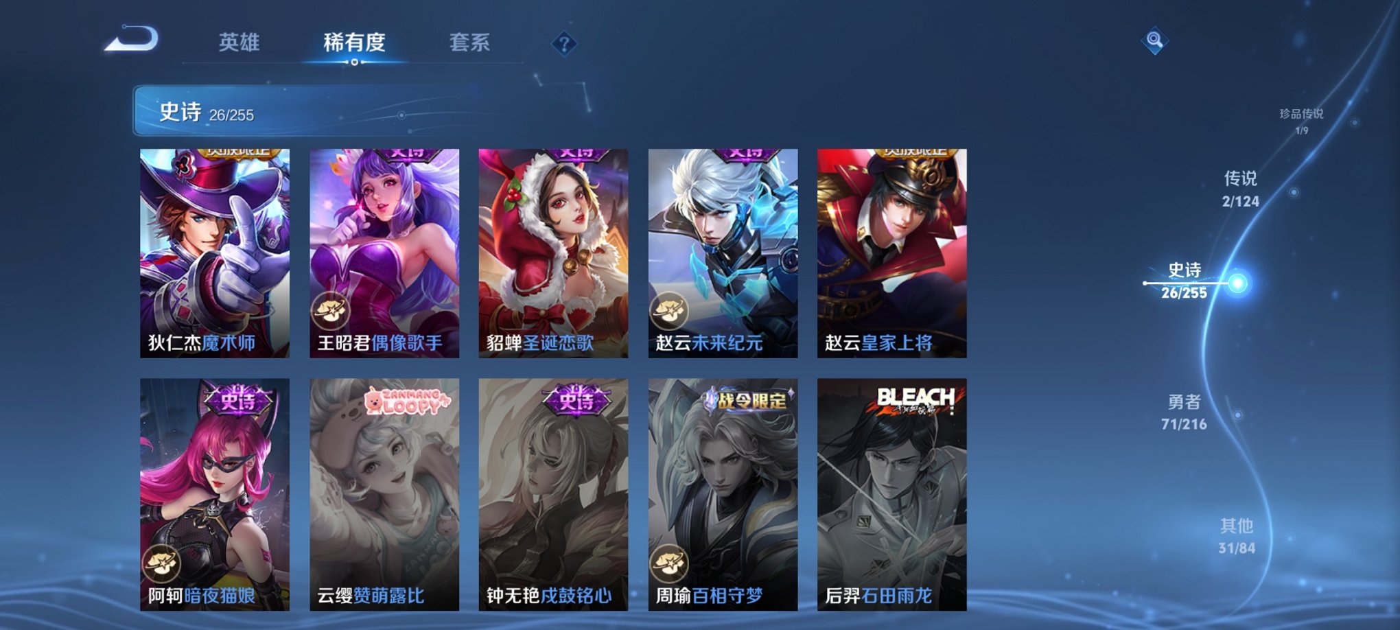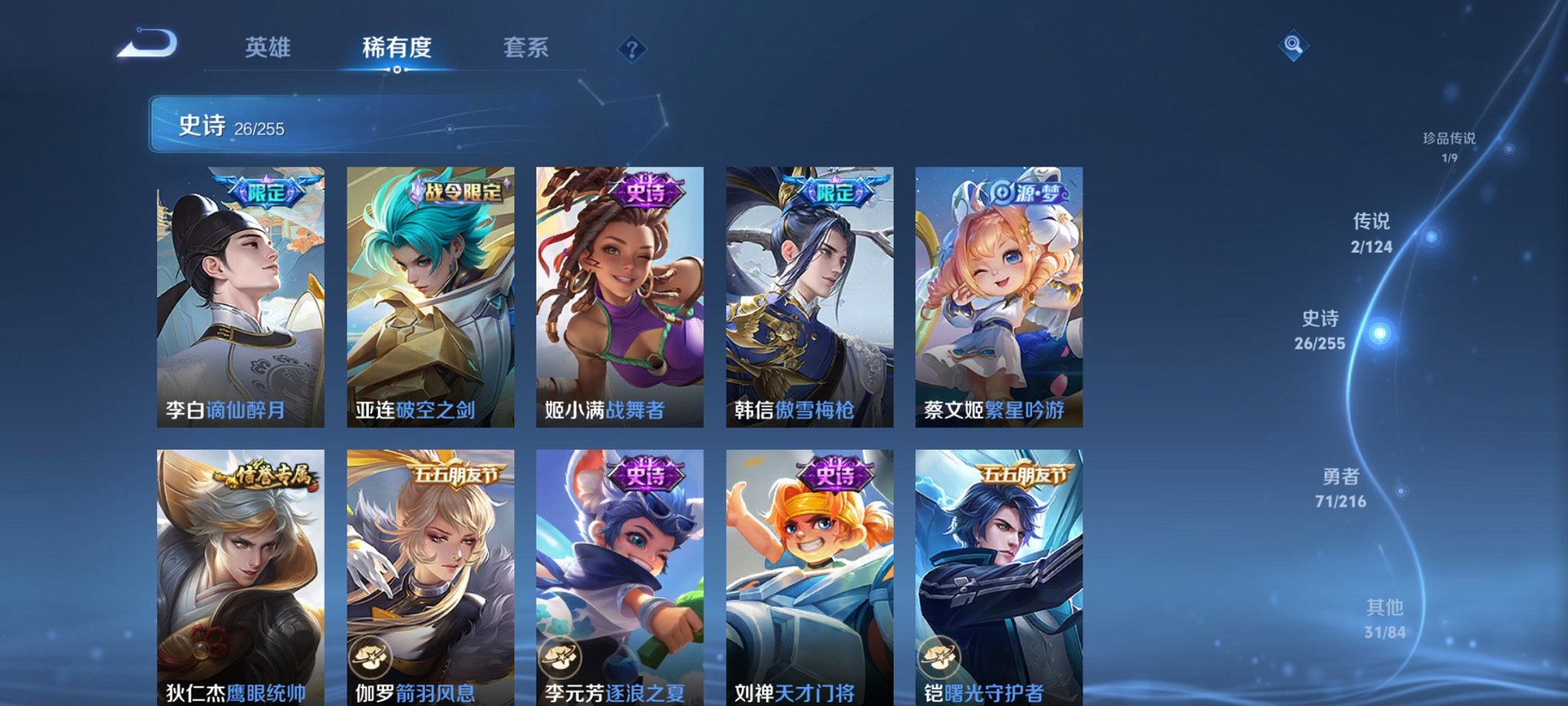 可二次【柯南1珍品2传说】安卓Q-123英雄【2传说】愿照·九州拓、鸣野蒿【1珍宝传说】江户川柯南【31史诗】谪仙醉月、天穹祈灯、天穹之誓、逐霄战戟、逆浪荇歌、破空之剑、战舞者、完美运算、幽灵船长、繁星吟游、魅力维加斯、魔术师、鹰眼统帅、圣诞恋歌、箭羽风息、鬼剑武藏、傲雪梅枪、曙光守护者、千年之狐、逐浪之夏、天才门将、龙骑士、水果甜心、偶像歌手、缤纷独角兽、心灵战警、摇滚巨星、皇家上将、黄金分割率、未来纪元、暗夜猫娘【62勇者】劲辣红锅、古海寻踪、狰、剑破天穹、探海日志、龙舞盛年、群星魔术团、金