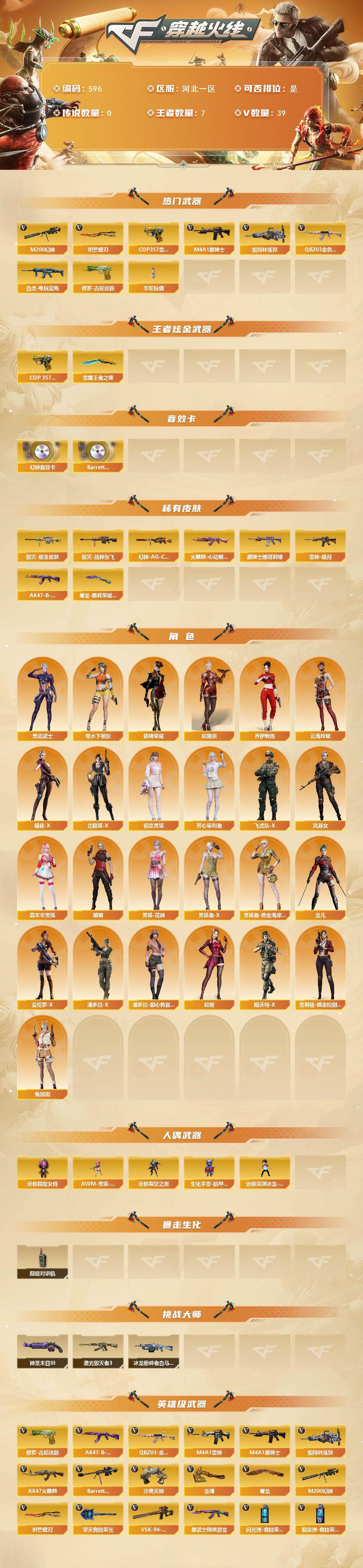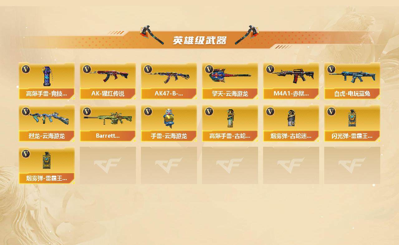 【热门武器】:QBZ03-金色蔷薇,M200-幻神*2,修罗-古蛇迷踪,白虎-电玩蓝兔,M4A1-黑骑士,加特林-炼狱,羊驼玩偶,COP 357-雷霆王者,炽芒蝶刃