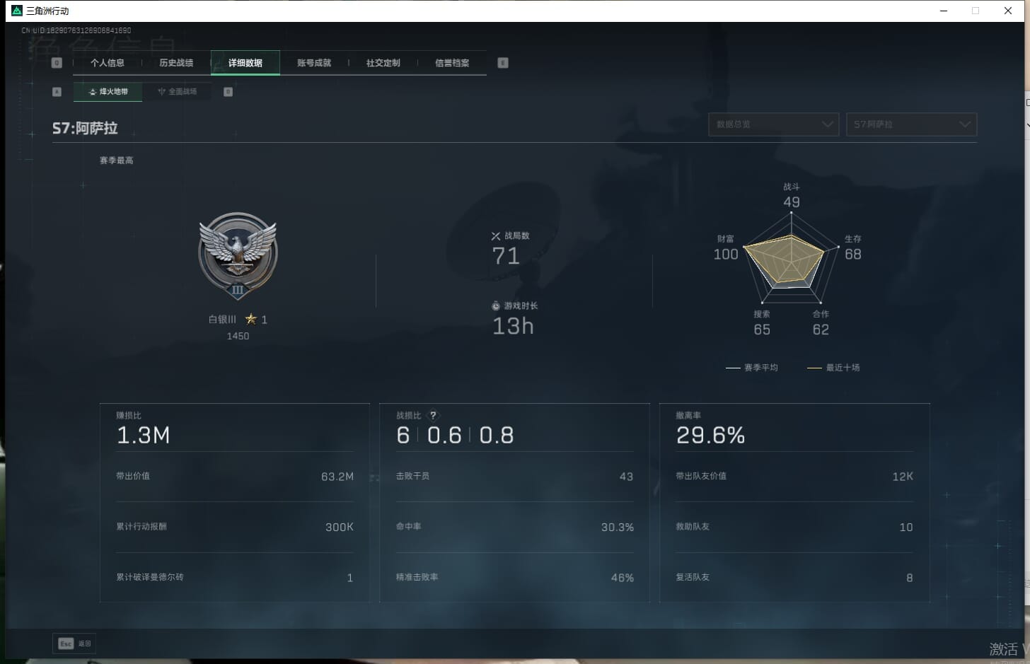 SSXH8747/QQ/哈夫币84W/总资产35.3M/行动等级44/战场等级7/【特战干员】/红狼