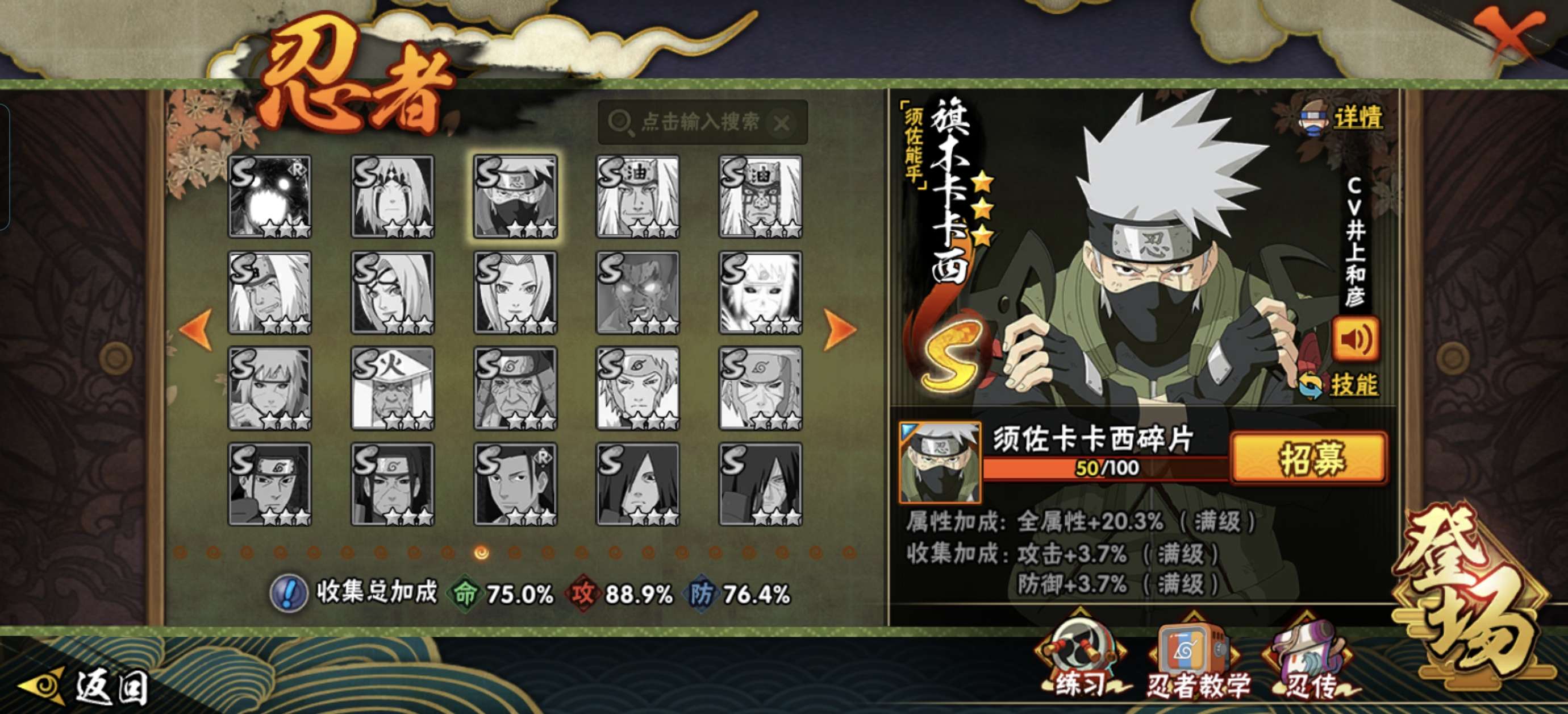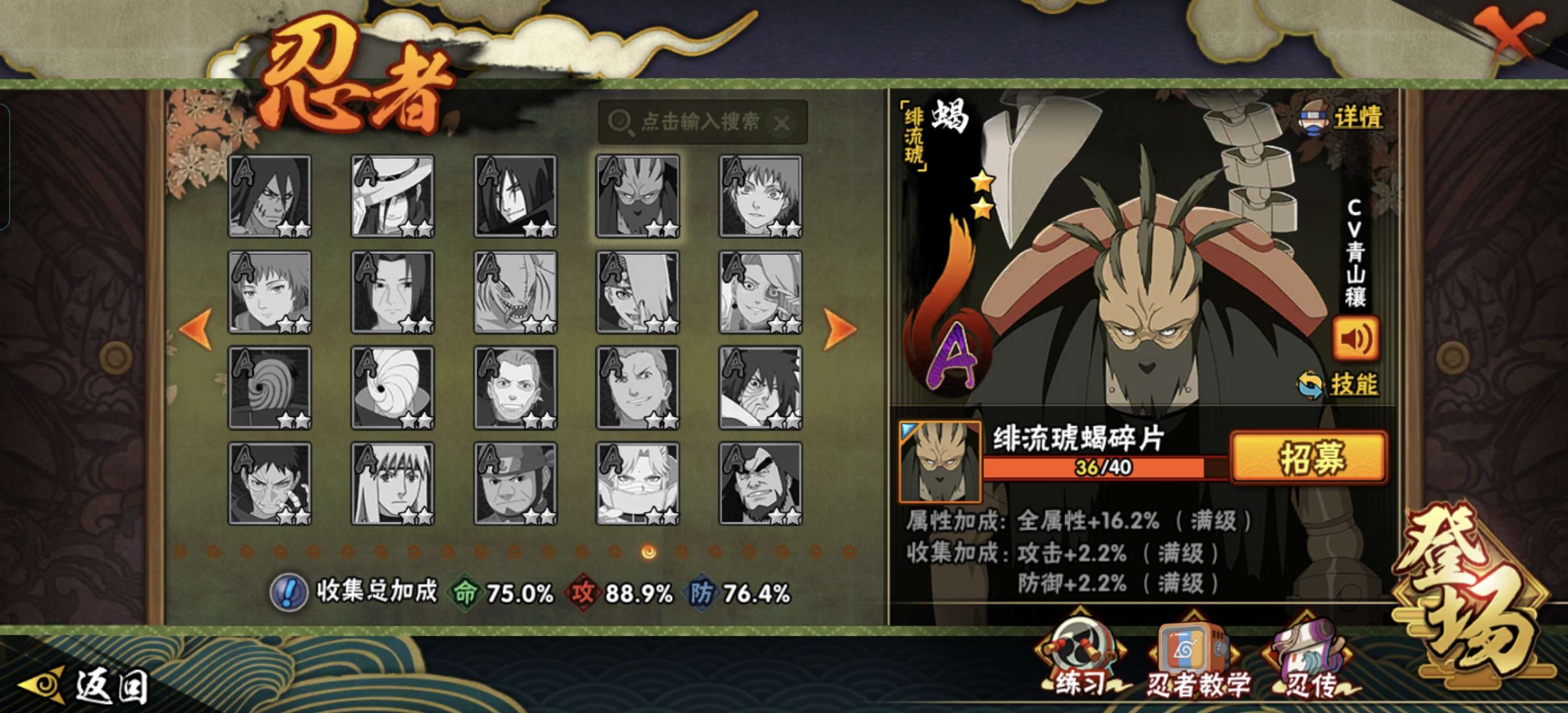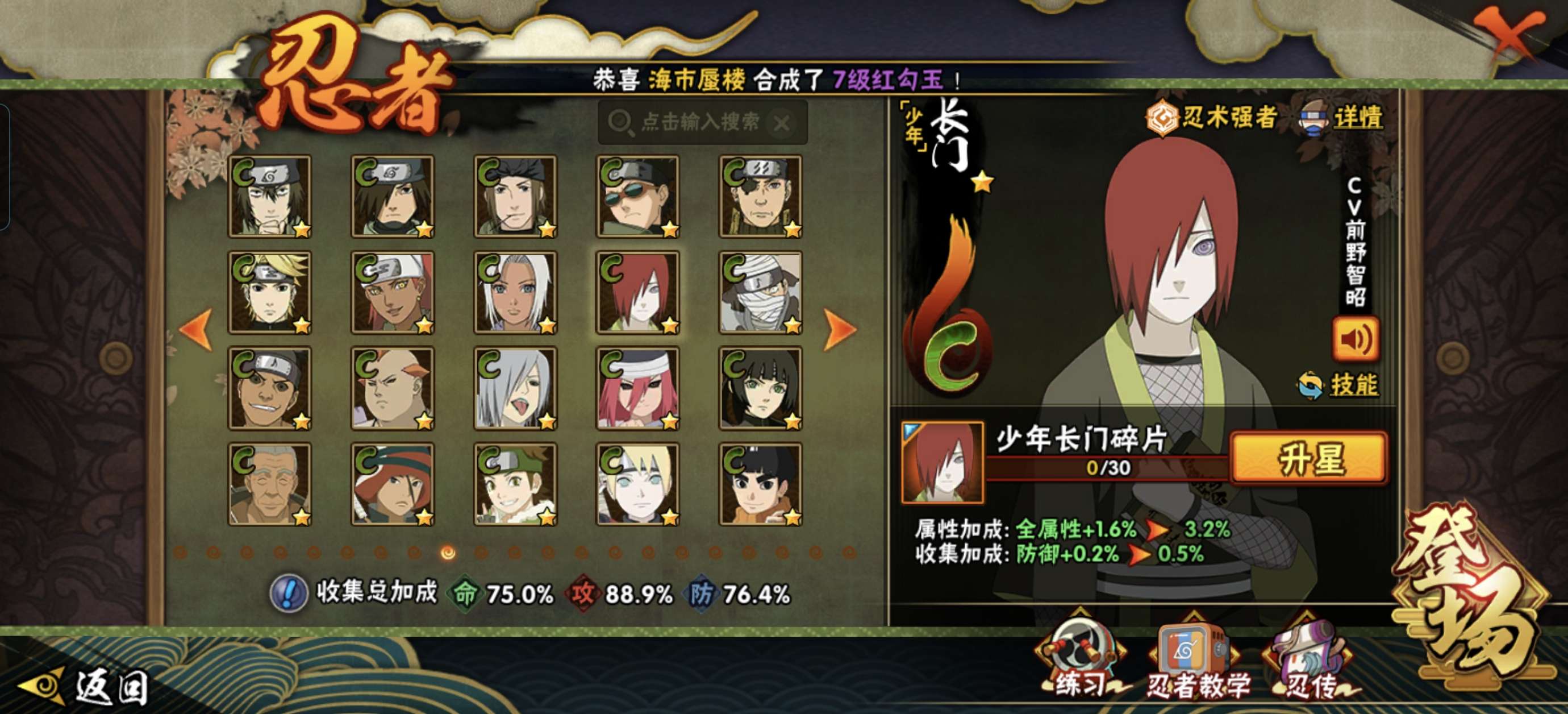 可二次 V7 绯流琥36/40死门凯77 解斑65秽土柱间60 须佐卡卡西50 小纲手小柱间小长门
