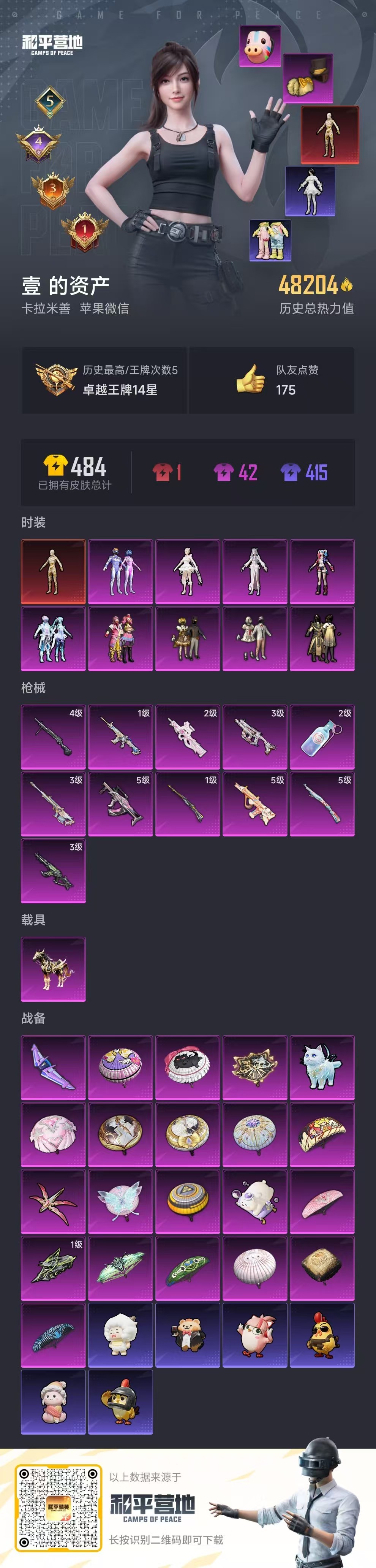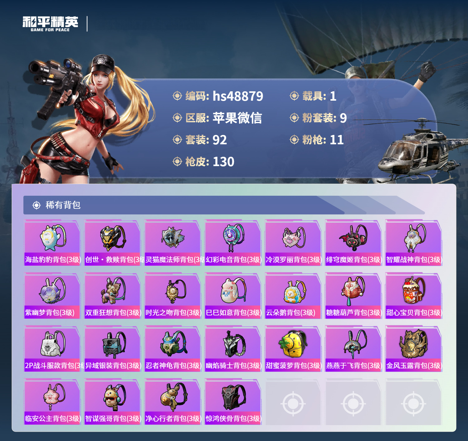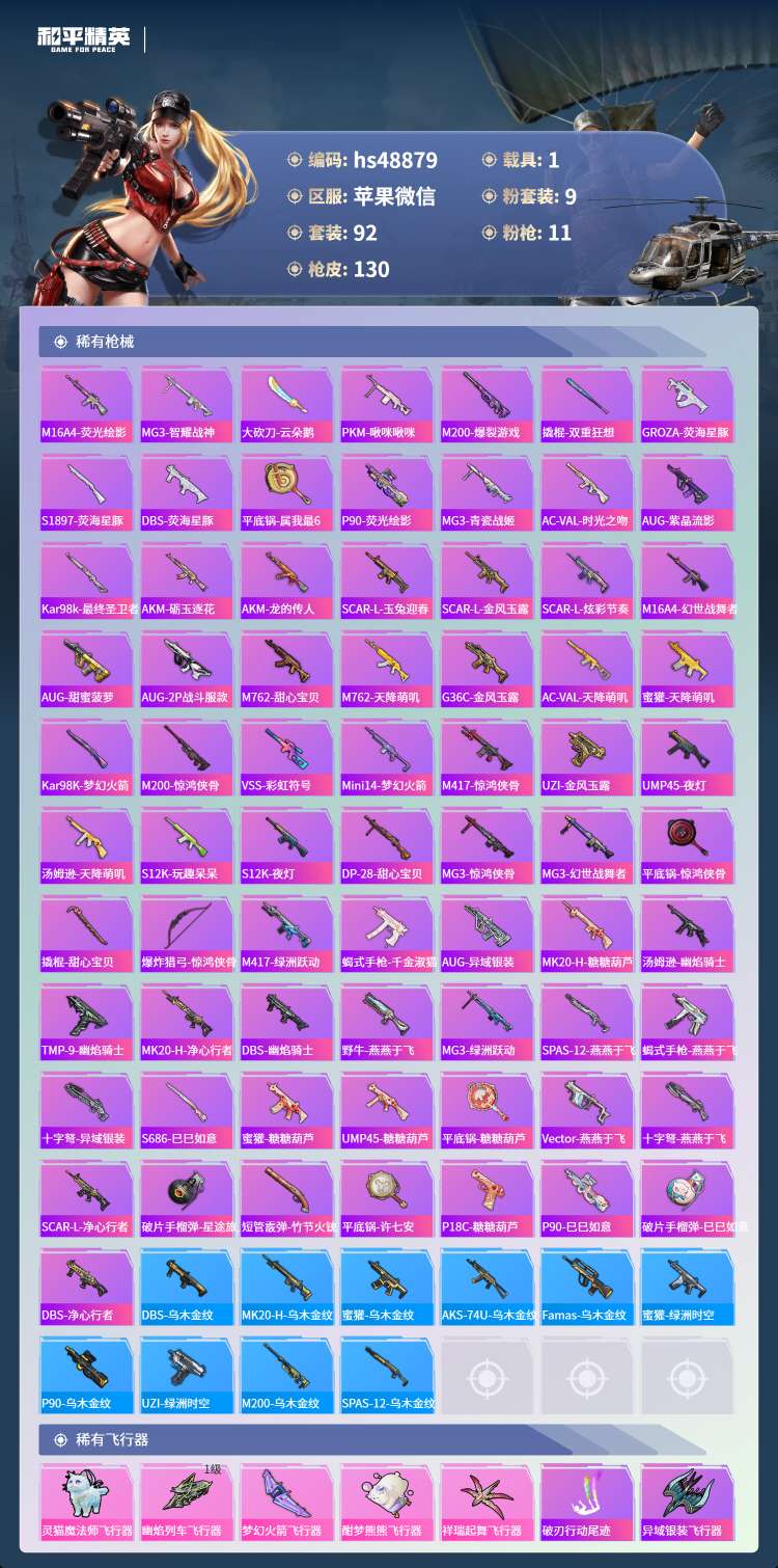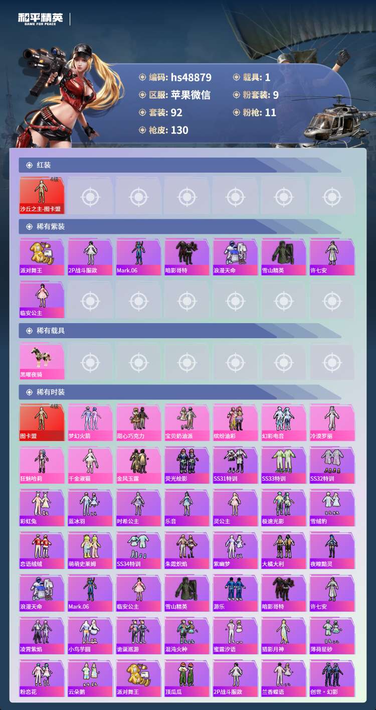 hs48879 苹果v-5王牌印记-1红装-9粉装-11特效枪-1载具-48264热力值-92套装