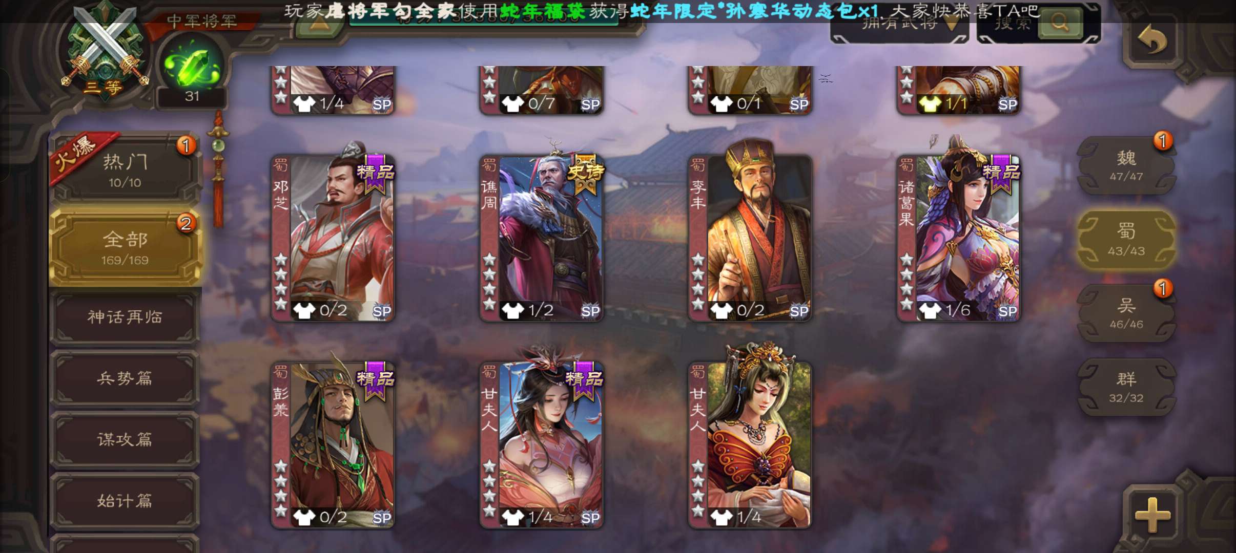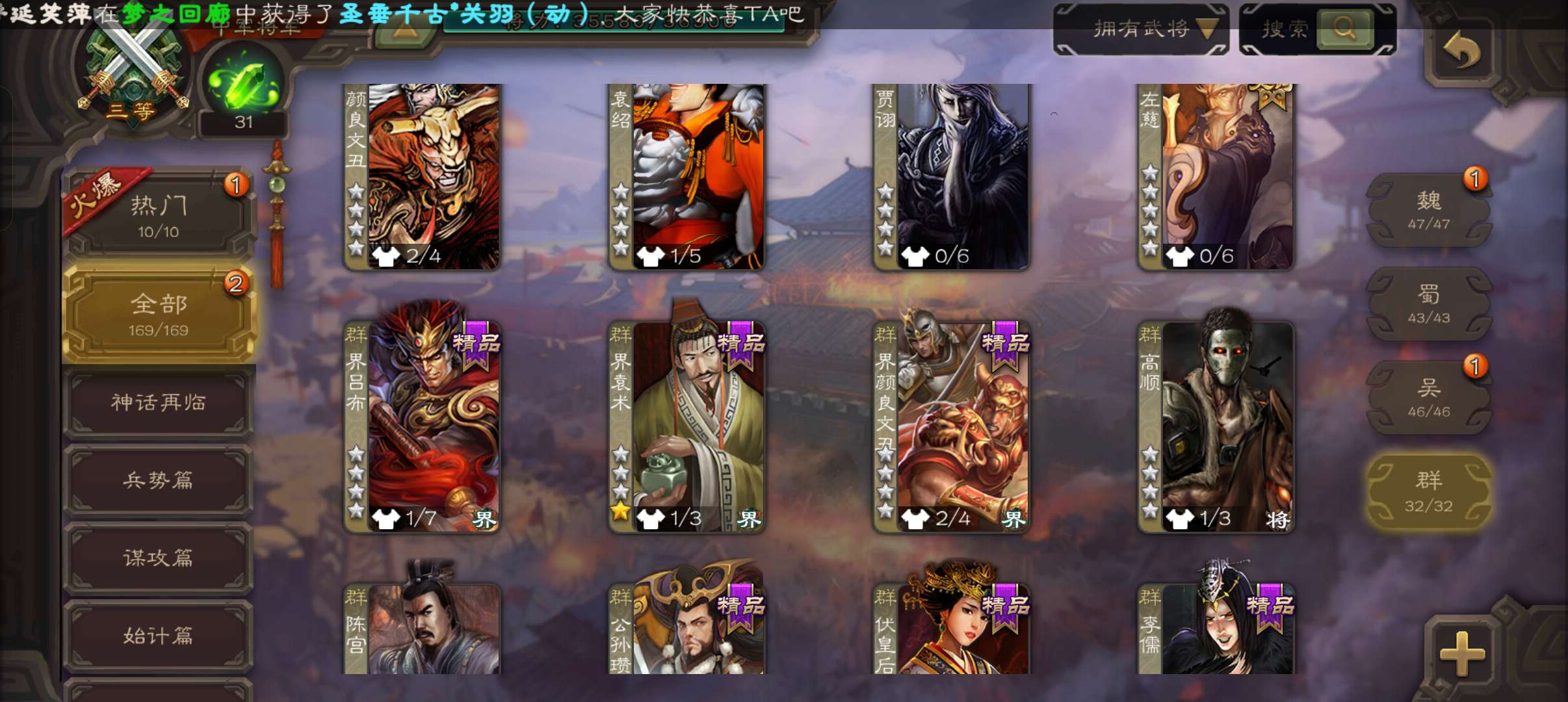 10史诗3神中军,带皮骆统神吕布张让谋马超谯周嵇康杨修贺齐左慈程昱,神周神吕蒙动界郭嘉动张春华蔡贞姬