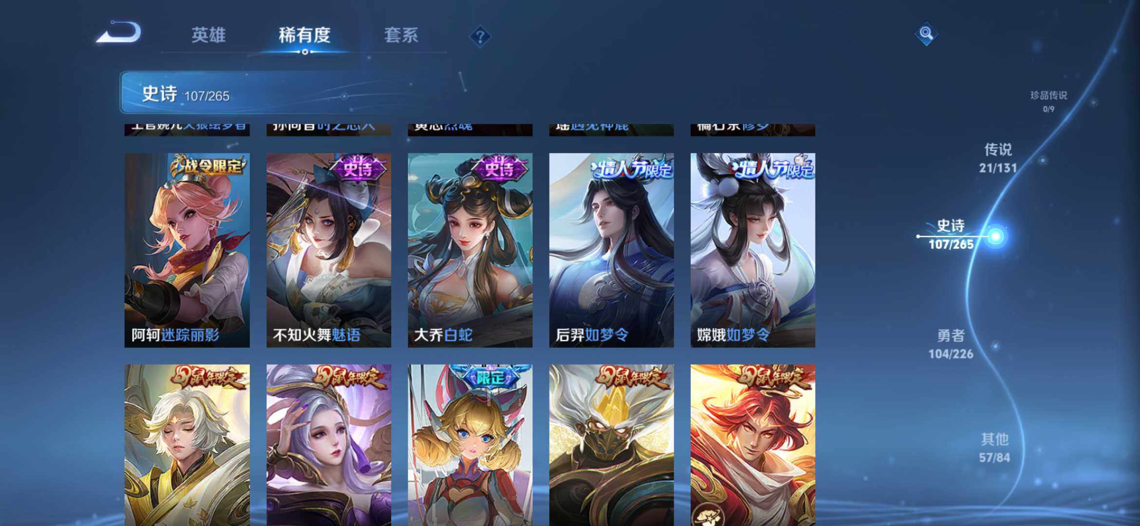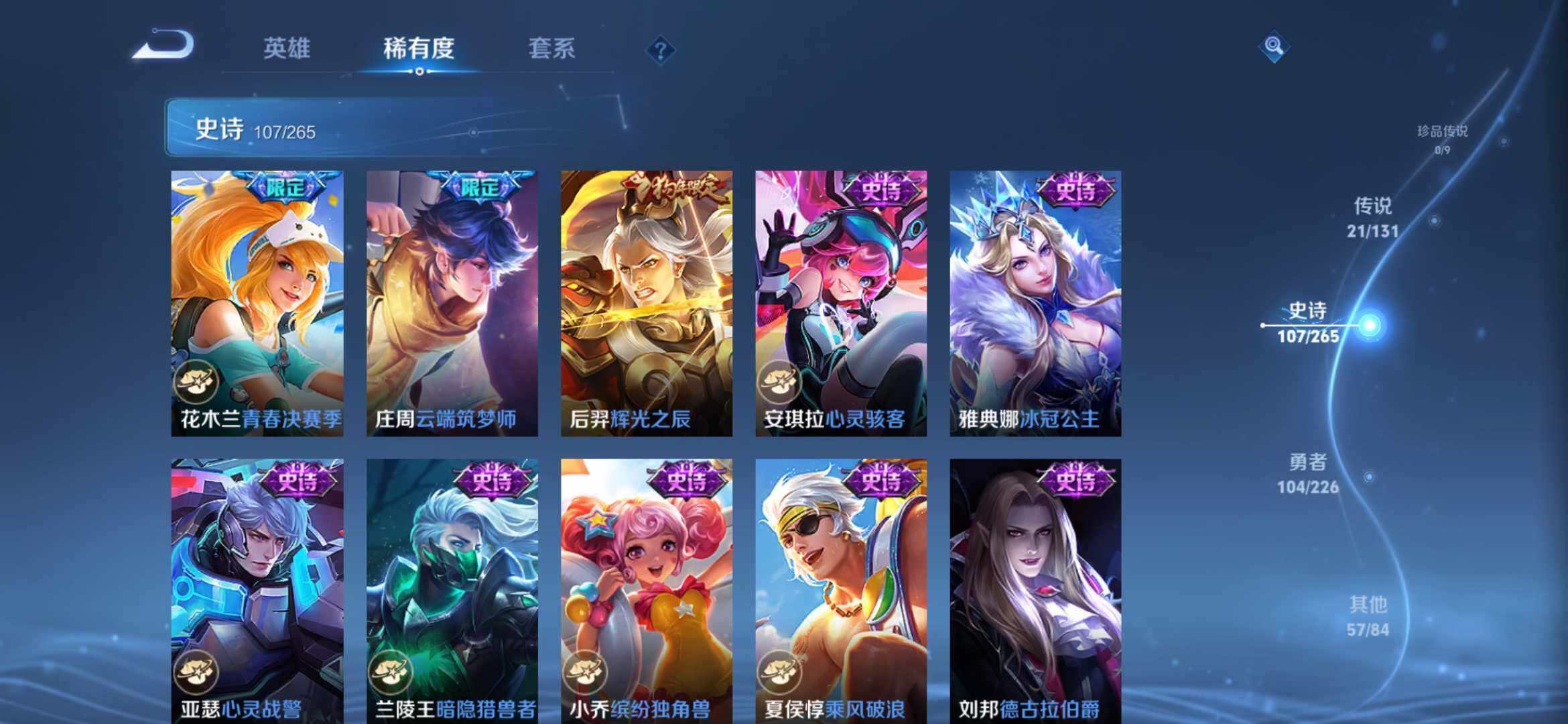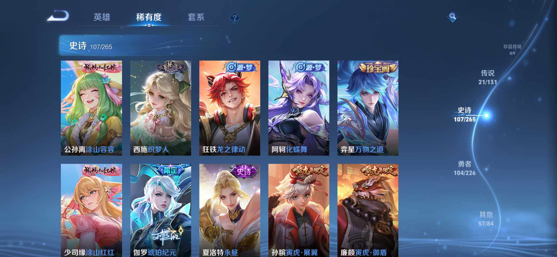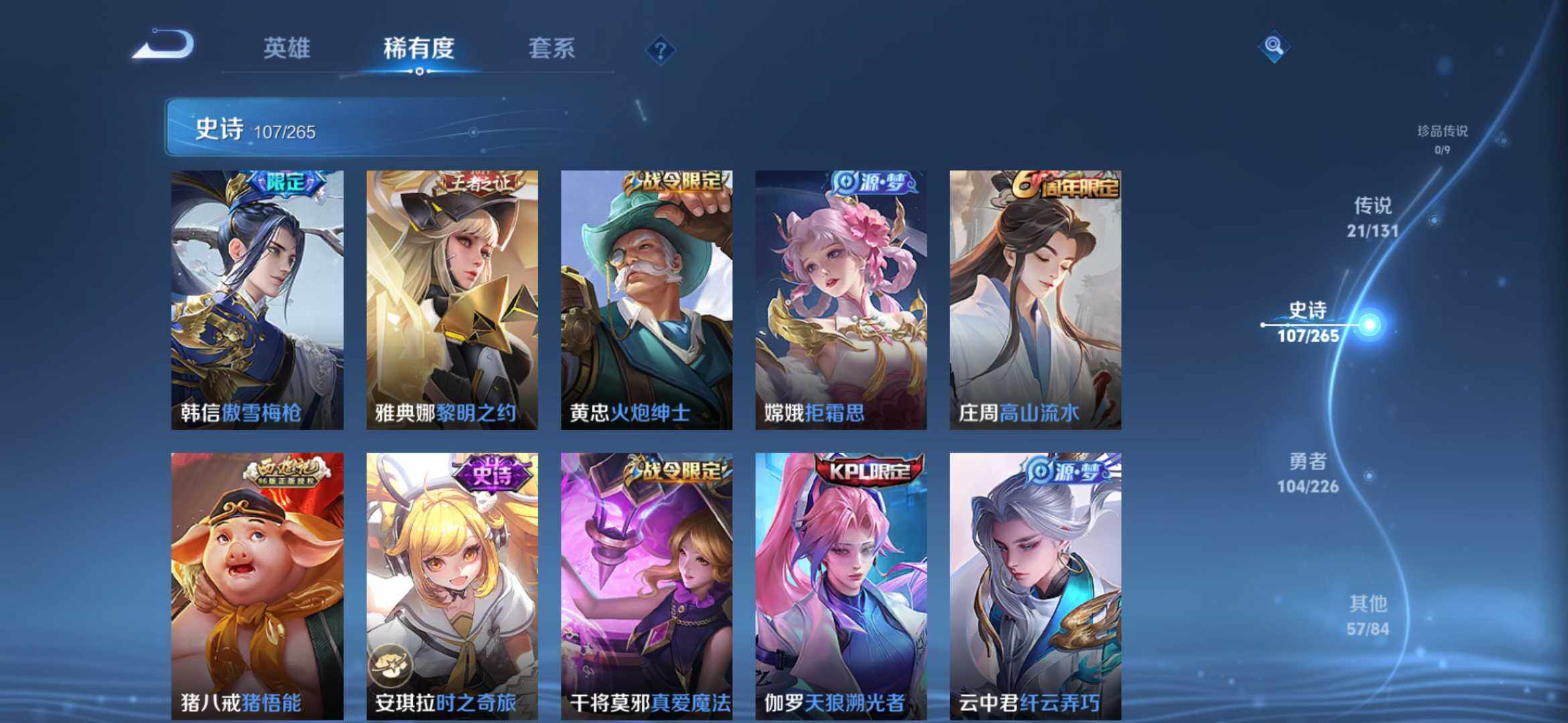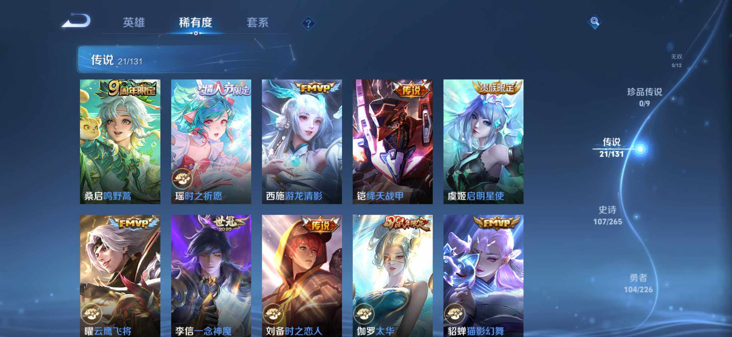 【传说皮肤】:桑启鸣野蒿,瑶时之祈愿,西施游龙清影,铠绛天战甲,虞姬启明星使,曜云鹰飞将,李信一念神魔,刘备时之恋人,