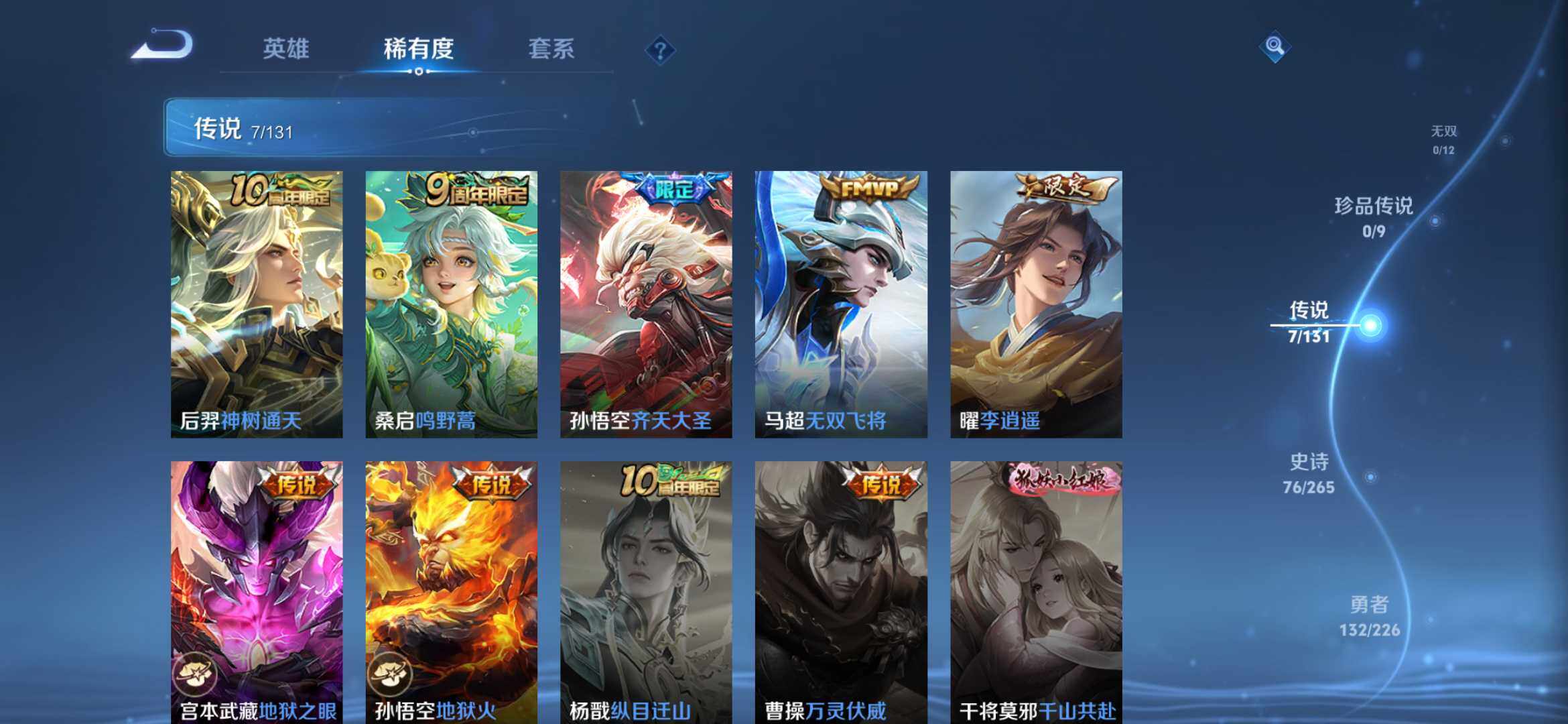 【传说皮肤】:后羿神树通天,桑启鸣野蒿,孙悟空齐天大圣,马超无双飞将,曜李逍遥 ,宫本武藏地狱之眼,孙悟空地狱火
