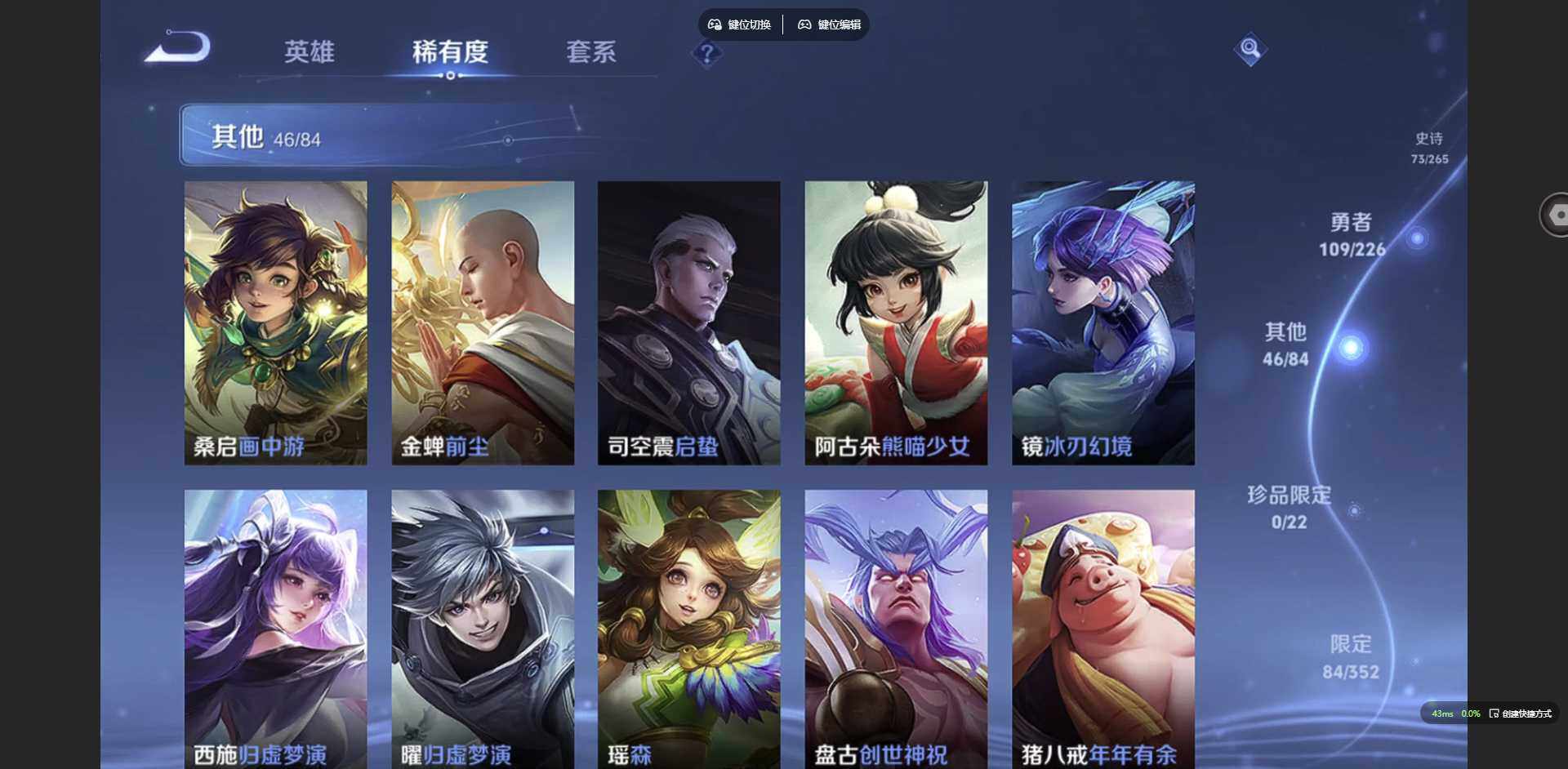 贵族等级: V8 英雄数: 127 皮肤数: 243 荣耀水晶: 武则天 星传