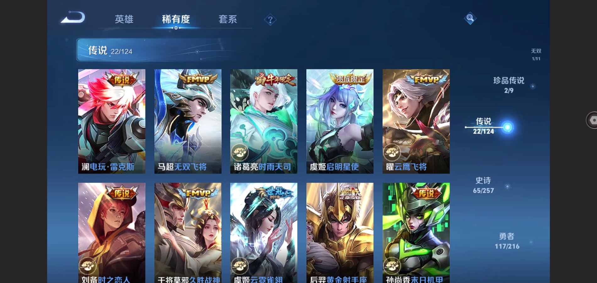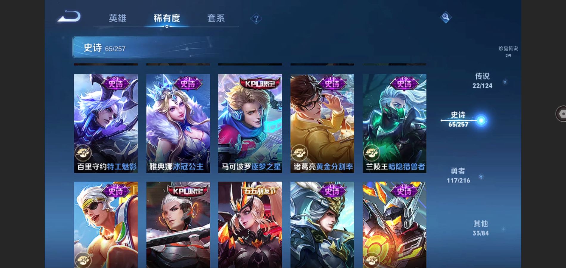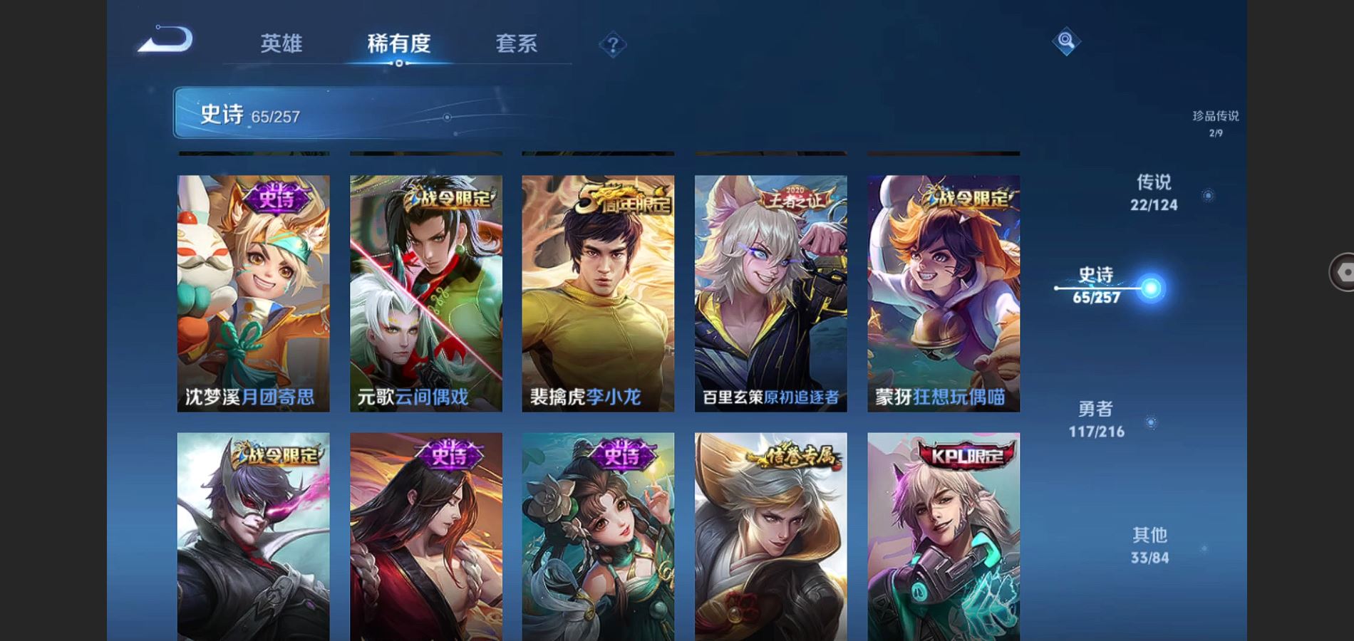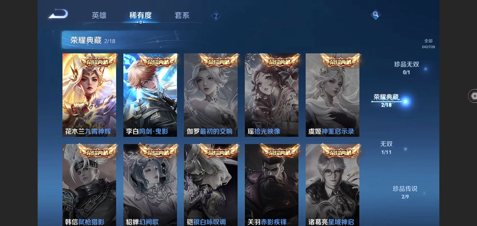 V8-242皮肤-2典藏 2珍品 1无双 22传说 2星传说 幽冥之眼 未来机甲 打野36段 金标李