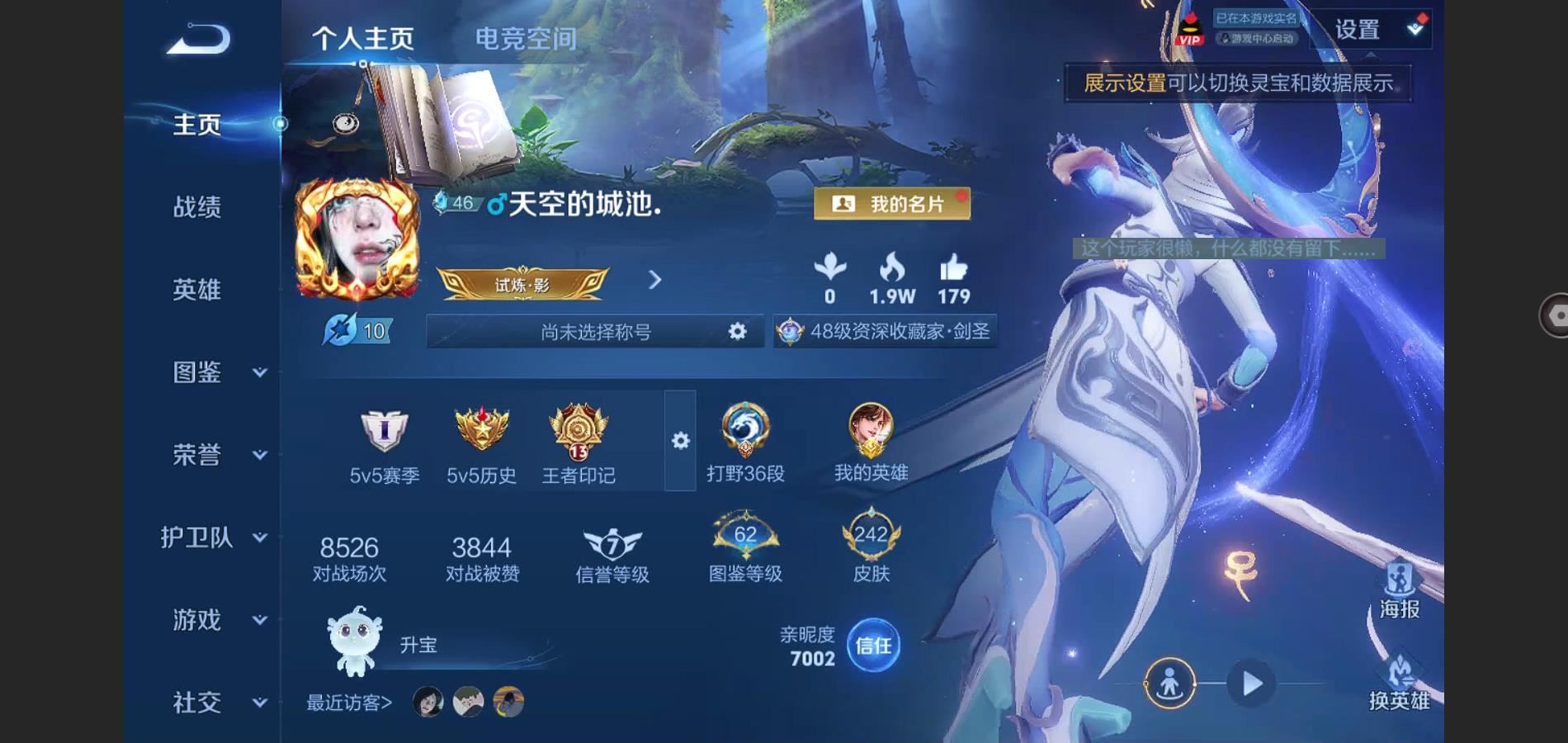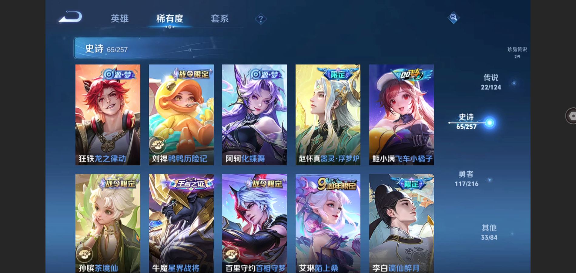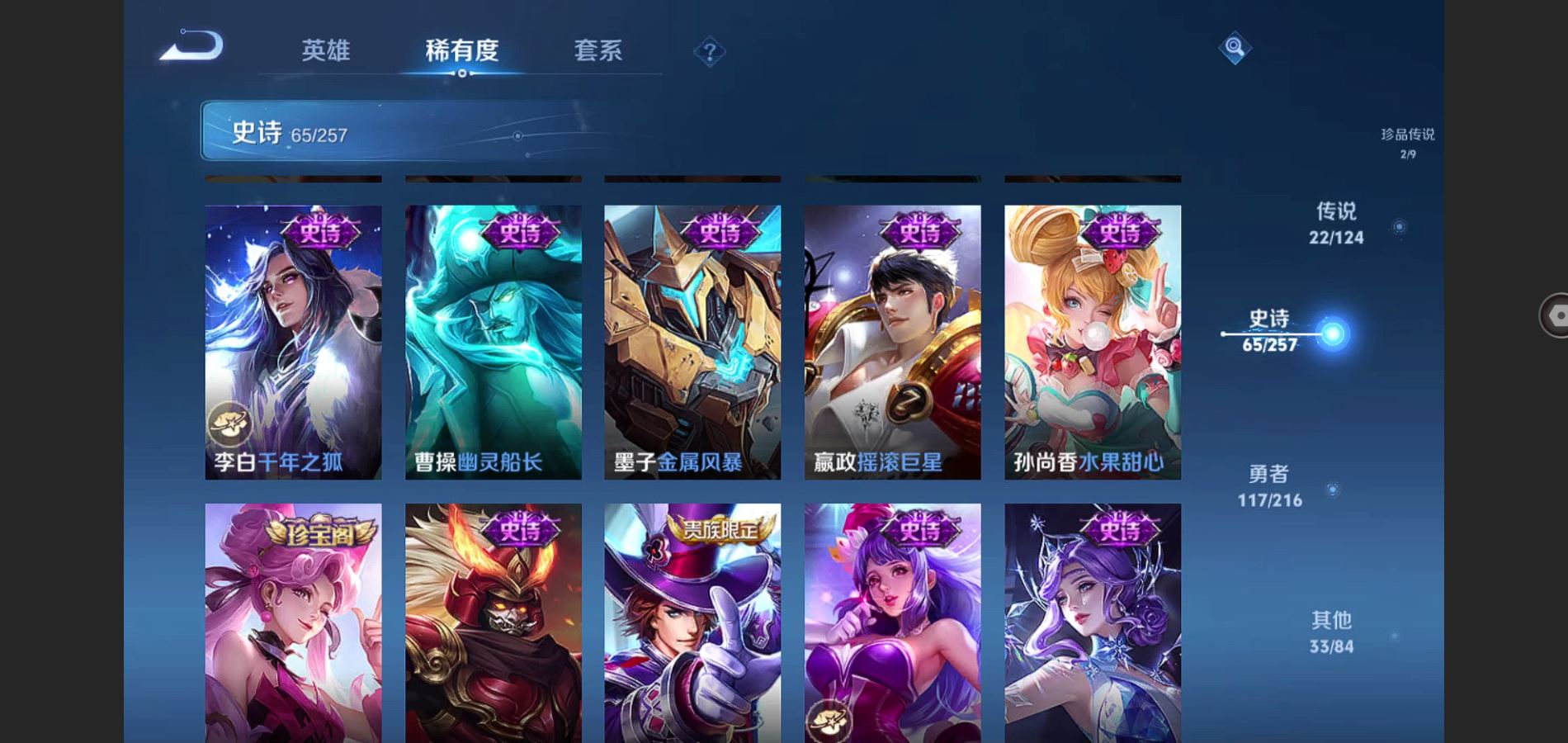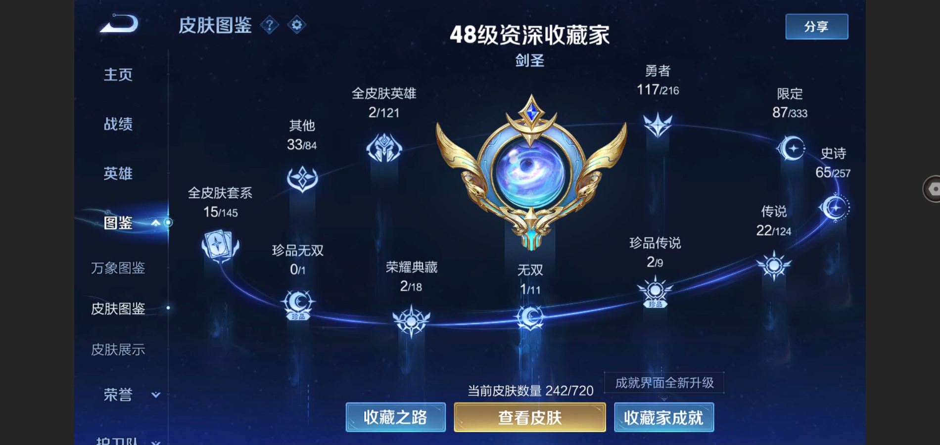 V8-242皮肤-2典藏 2珍品 1无双 22传说 2星传说 幽冥之眼 未来机甲 打野36段 金标李