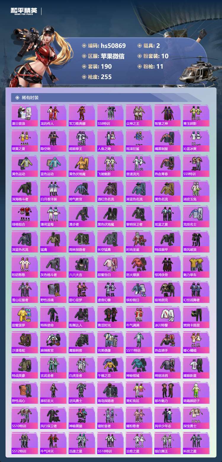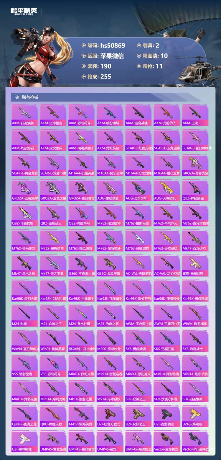 hs50869 苹果v-17王牌印记-10粉装-11特效枪-2载具-89336热力值-190套装-