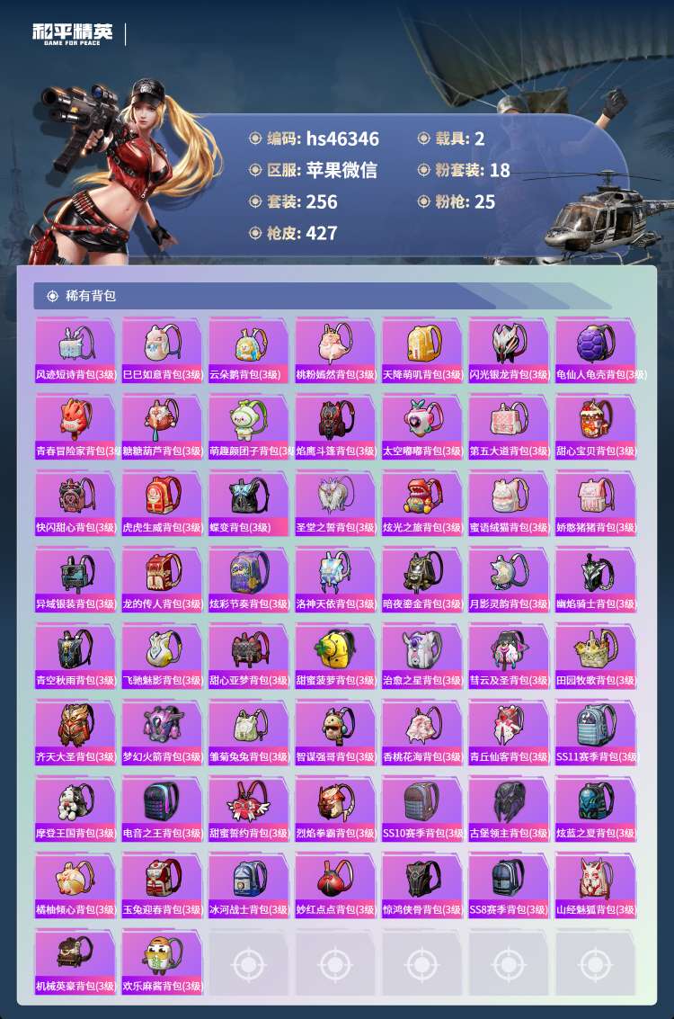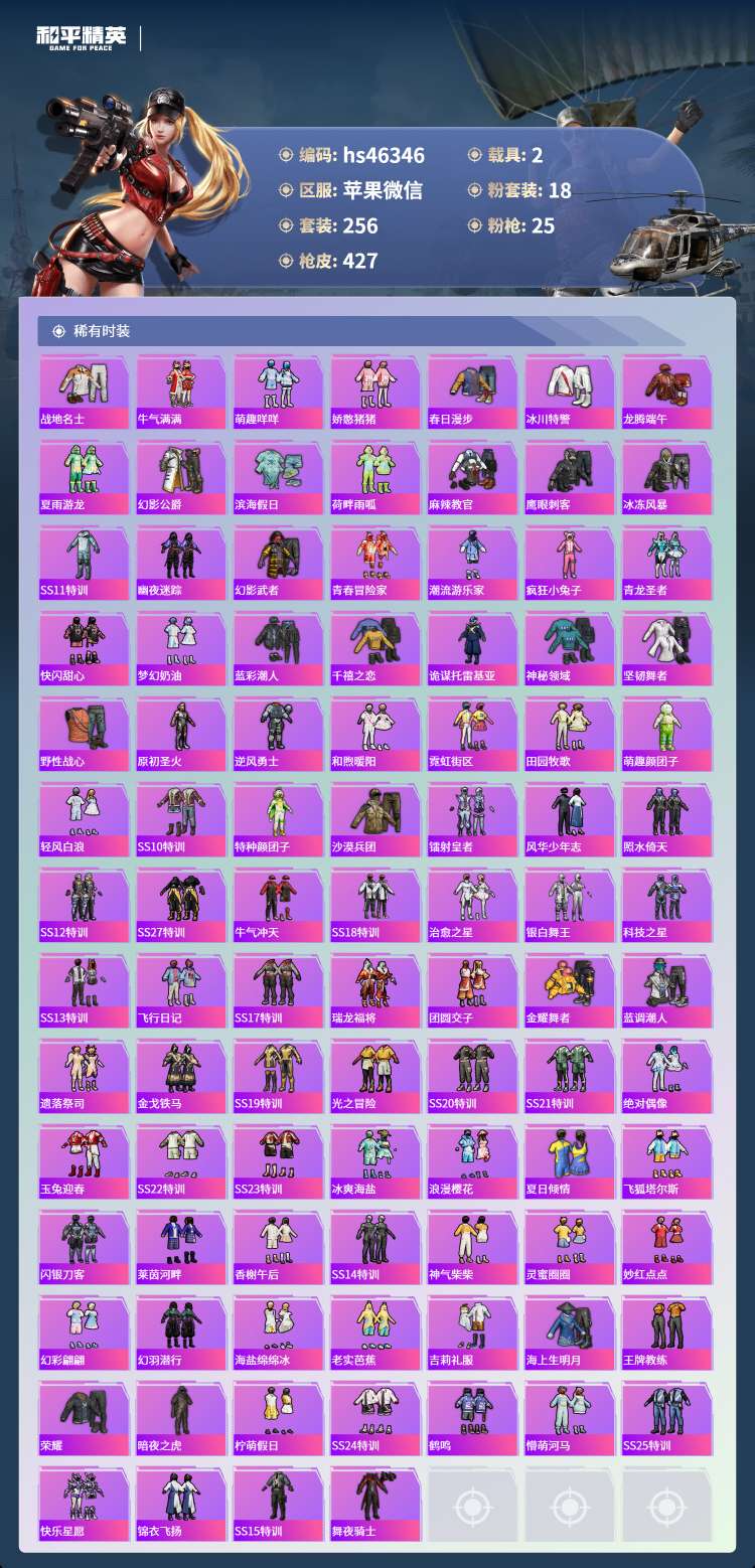 hs46346 苹果微-19王牌印记-有战神框-18粉装-25特效枪-2载具-143963热力值-