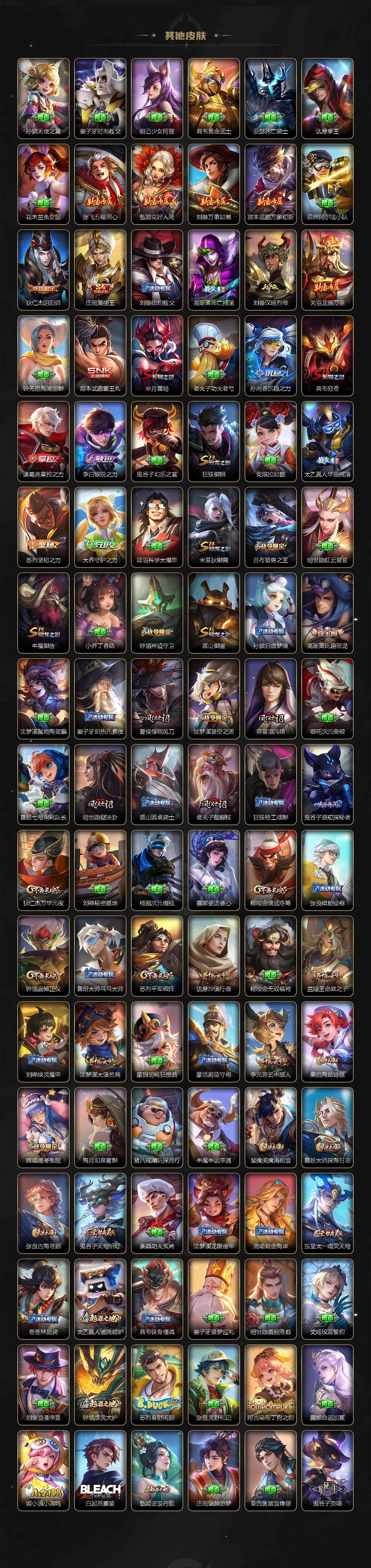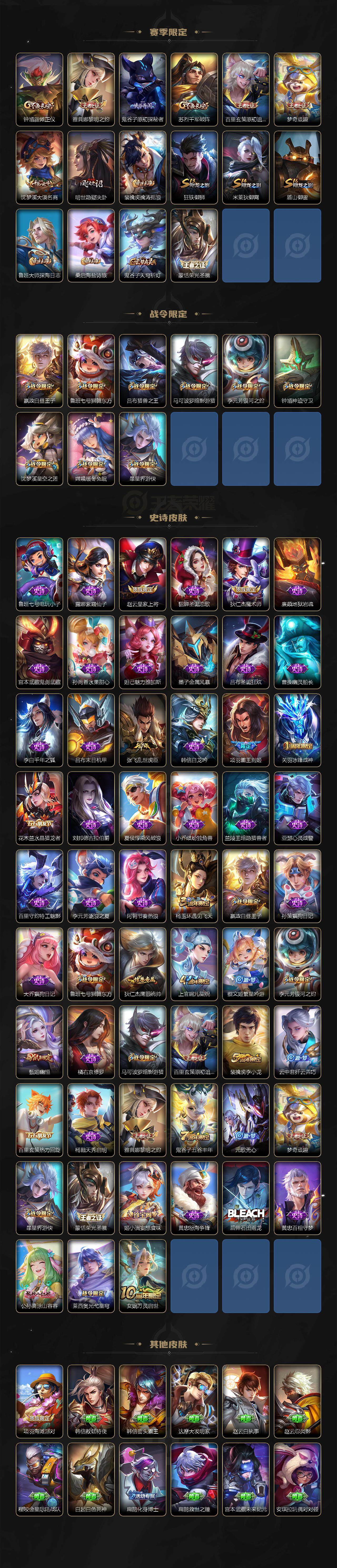 【限定皮肤】:狄仁杰阴阳师,赵云皇家上将,嬴政白昼王子,鲁班七号狮舞东方,庄周蜃楼王,高渐离死亡摇滚,高渐离玩趣恶龙,芈月重明,吕布猎兽之王,元歌无心,夏侯