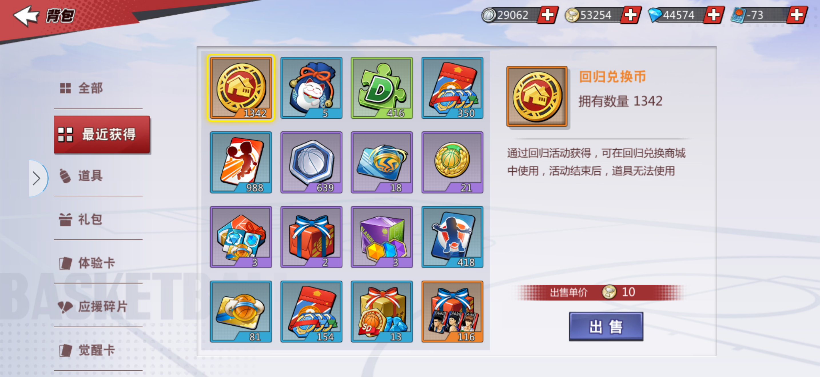 内线小号,不玩了退游,回归可换水晶或球员,包里有1荣耀水晶+120多张集训球员卡。