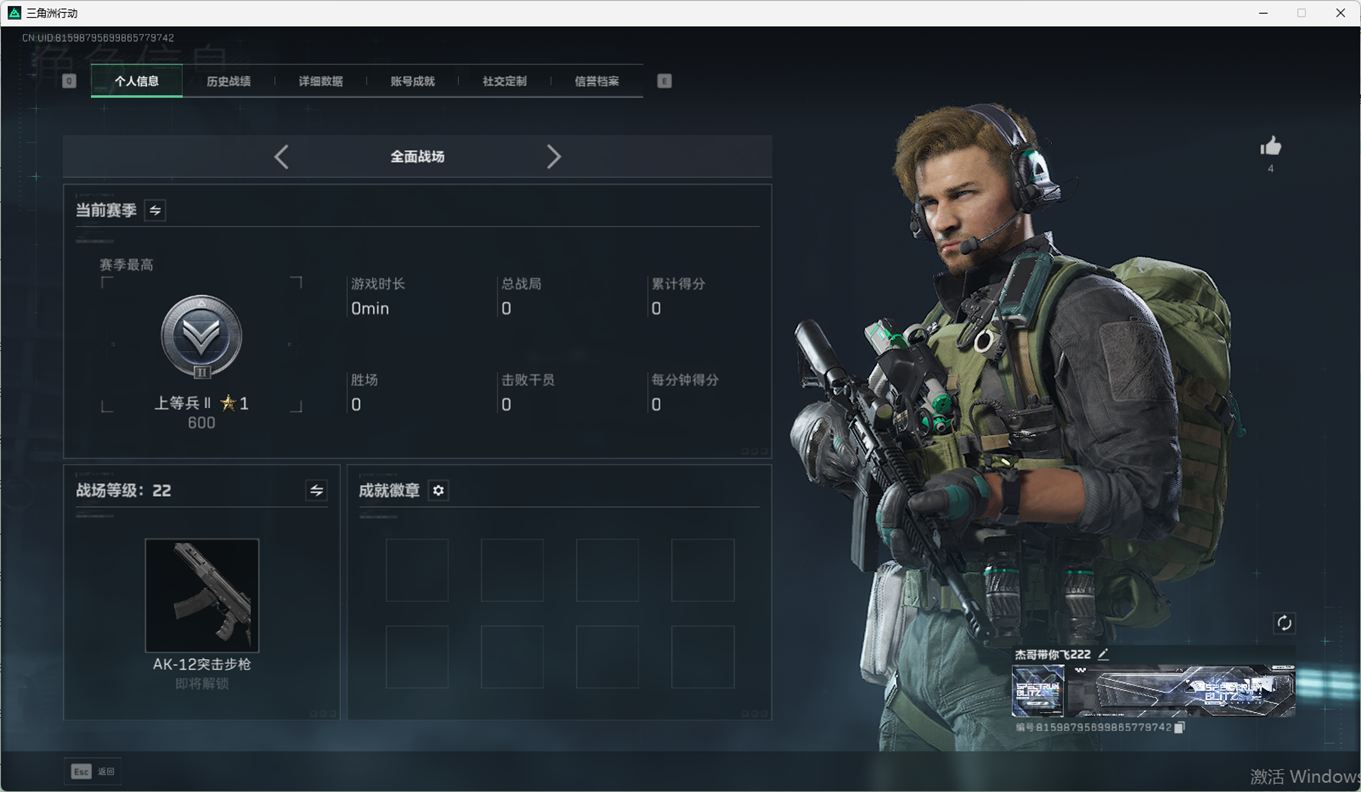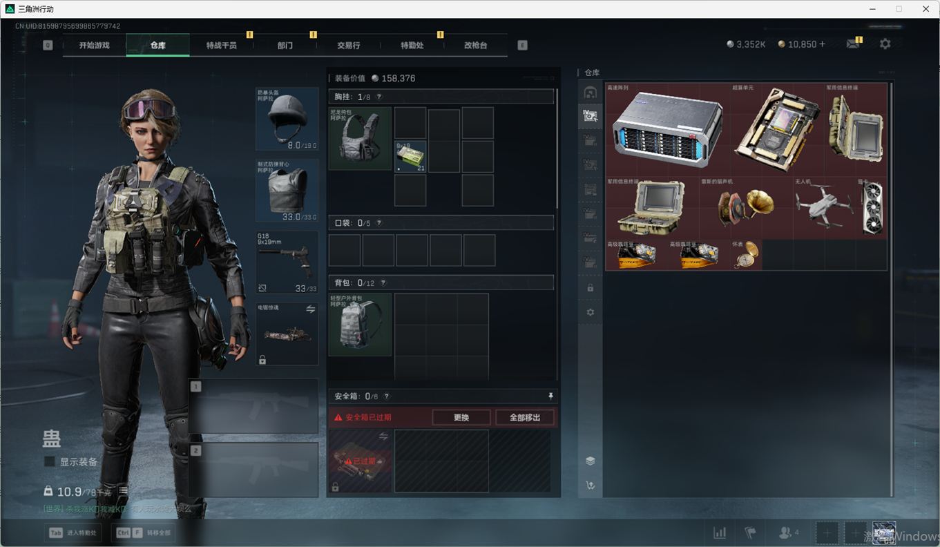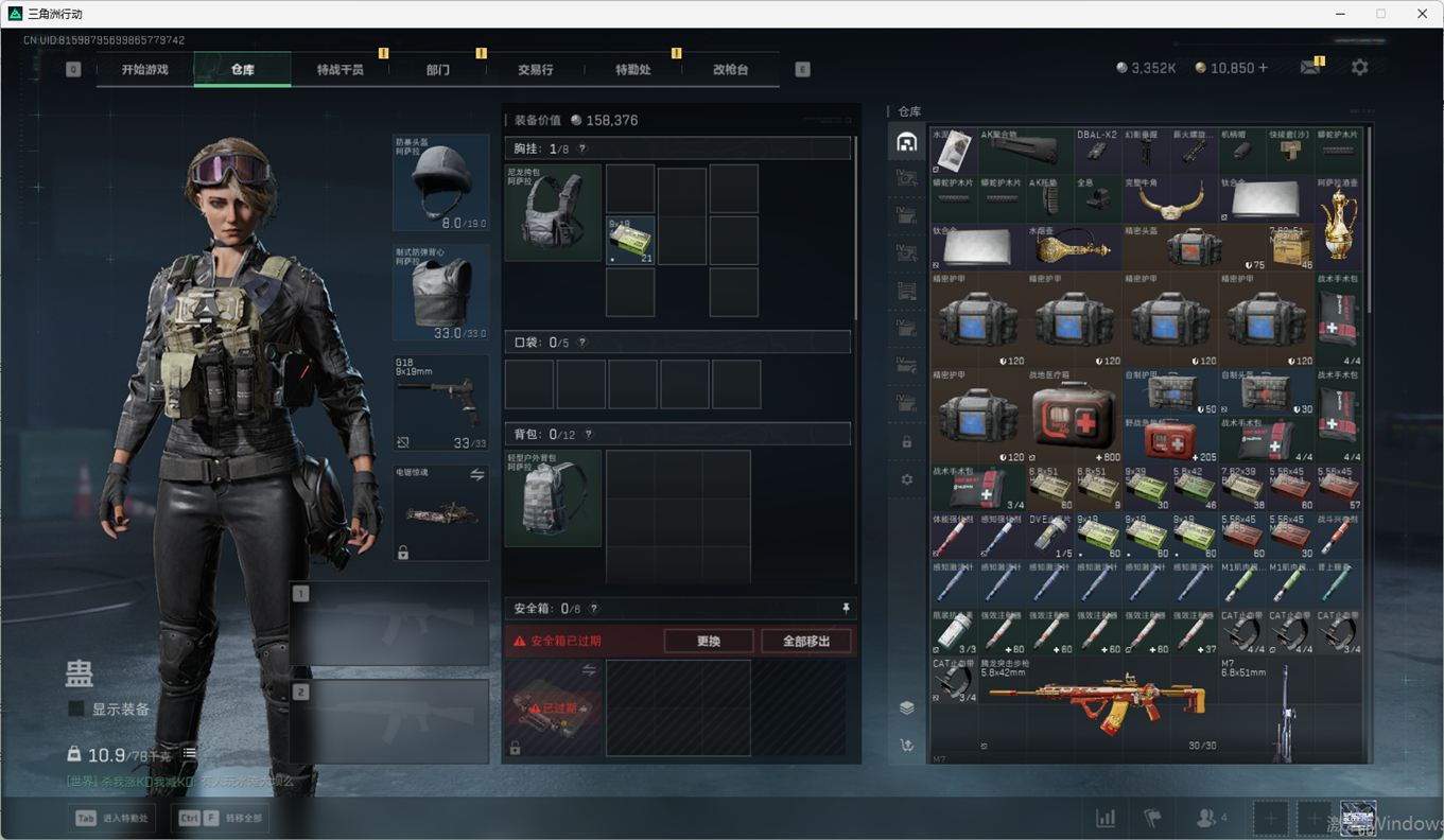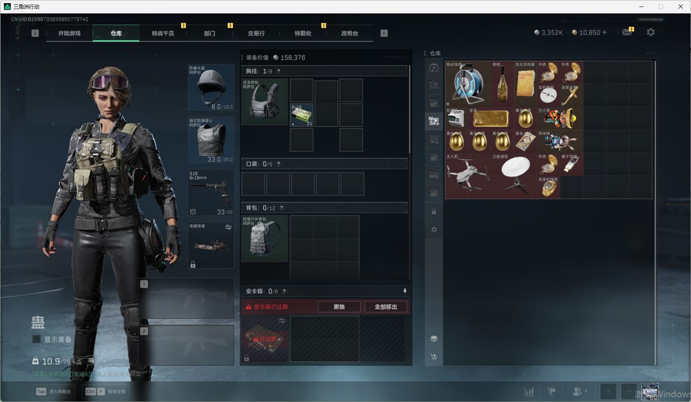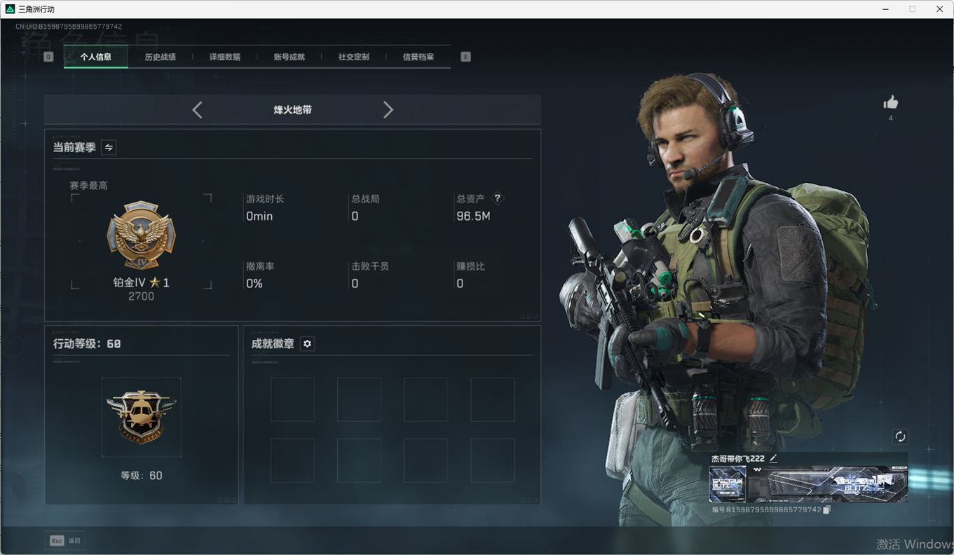 SSN6270/QQ区/哈夫币335W/三角券10763/总资产96.5M/行动等级60/战场等级2