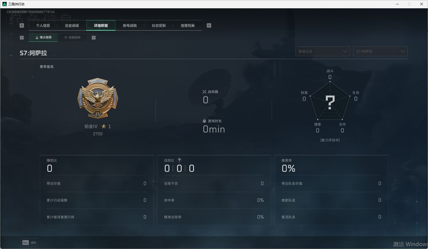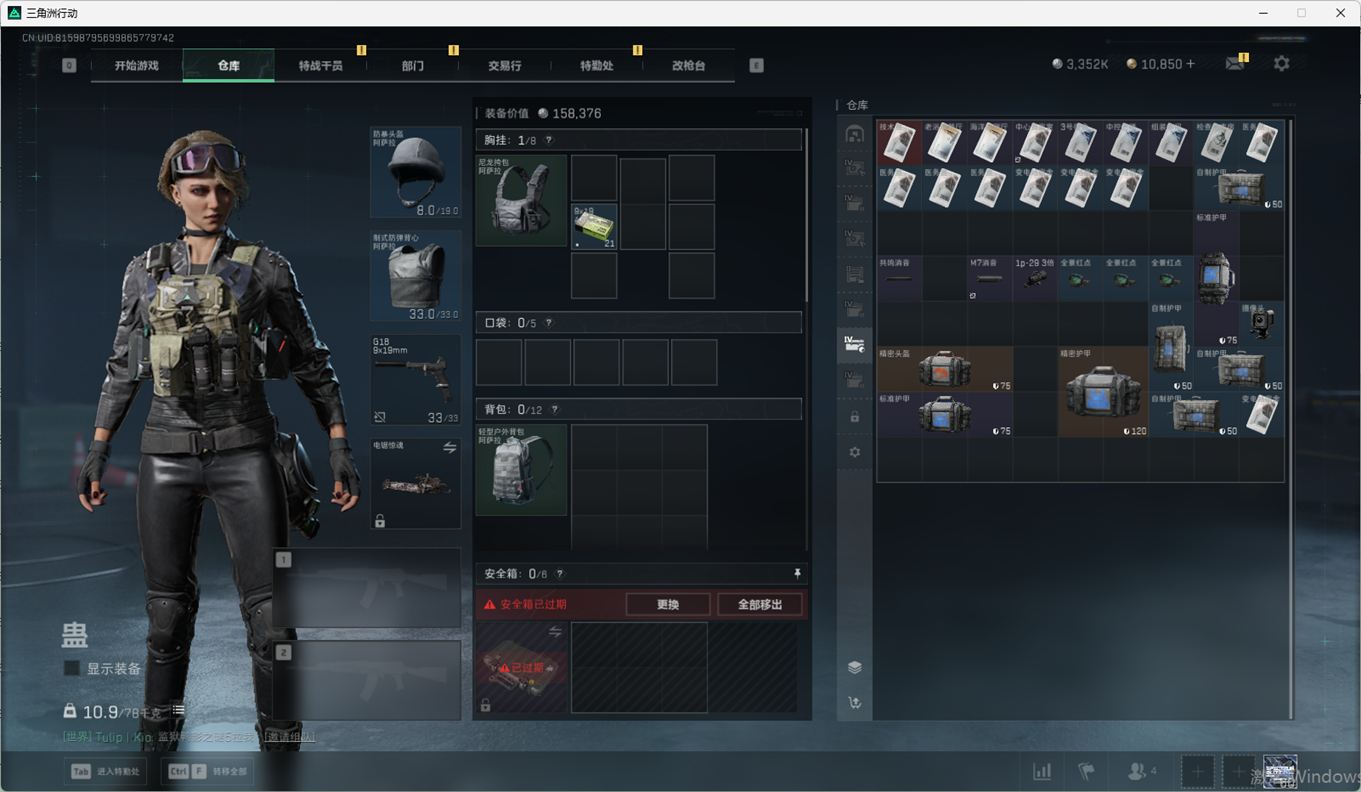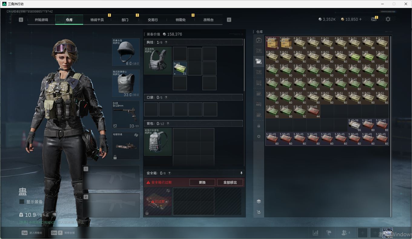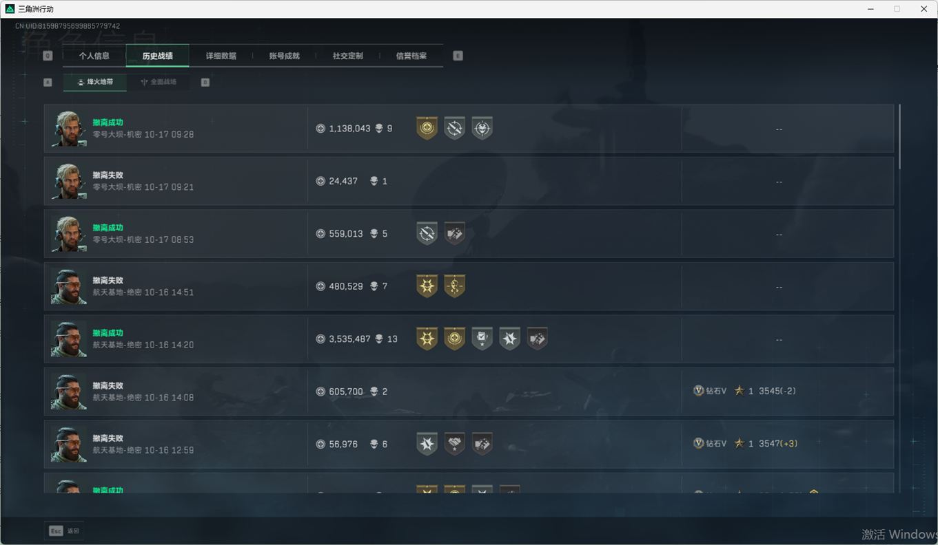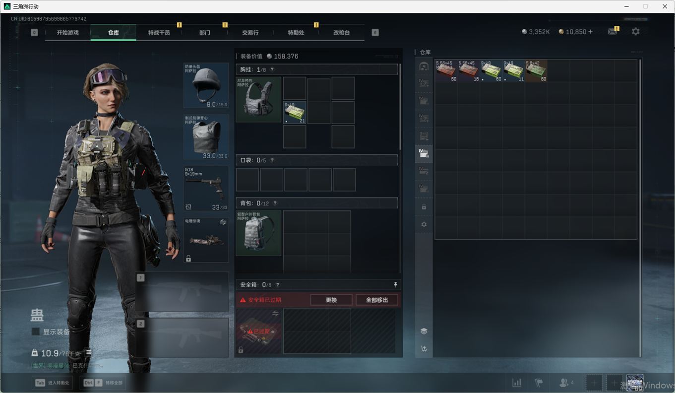 SSN6270/QQ区/哈夫币335W/三角券10763/总资产96.5M/行动等级60/战场等级2