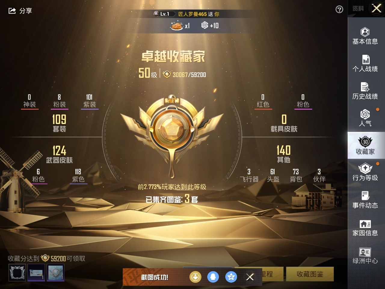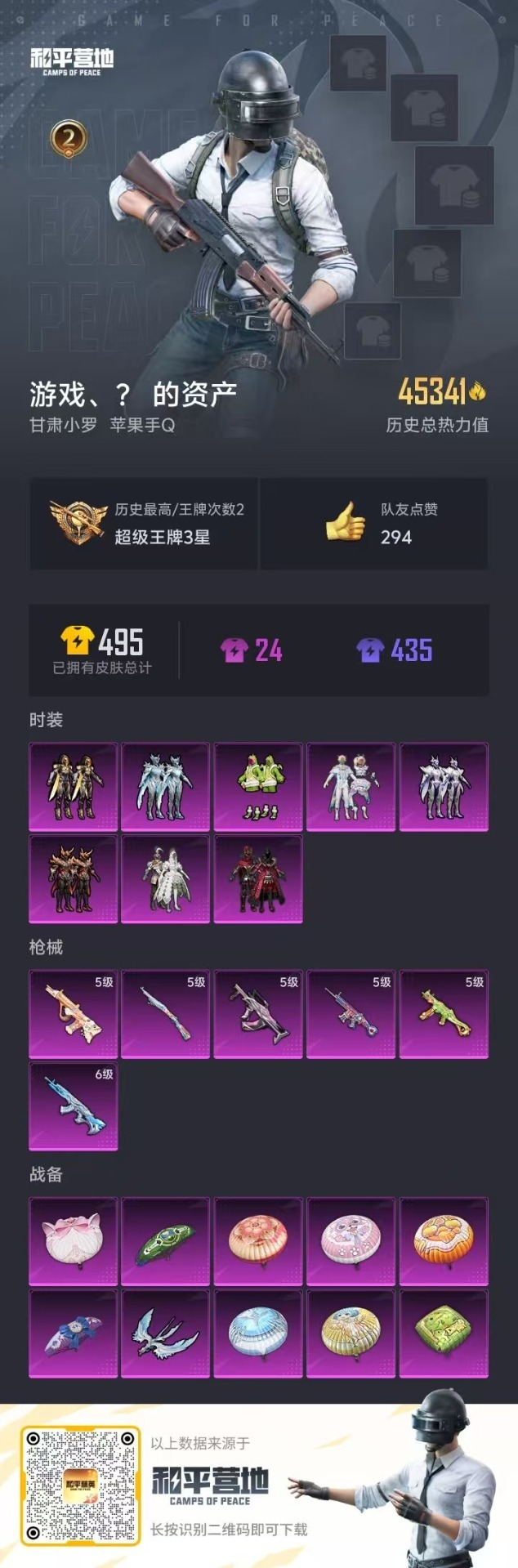 载具 2印记 可二次 可修改实名 时装数:426 枪械数:124 战备数:0 热门装扮:炙焰红王,冰霜白皇,彩虹鹿灵,恐龙拽拽,紫电风暴,赤焰黑爵,冷魅冰骑,创世·救赎,鹰眼刺客,深海小丑鱼 稀有枪皮:GROZA-镜光银凌,Kar98K-巳巳如意,AUG-暖羊咩咩,SCAR-L童
