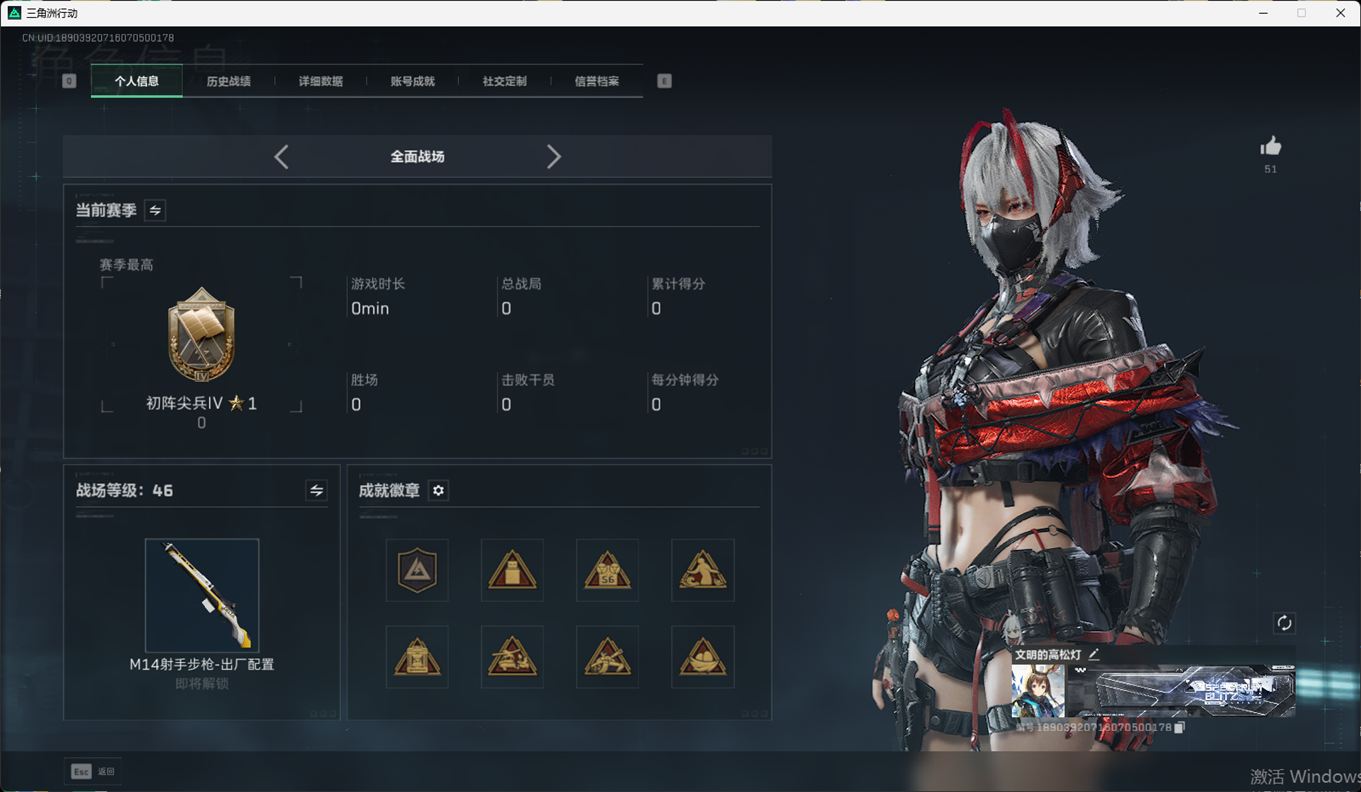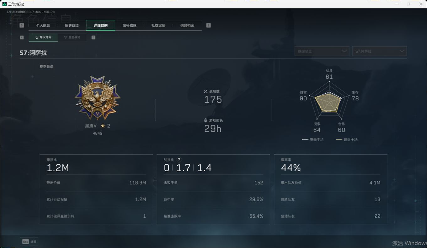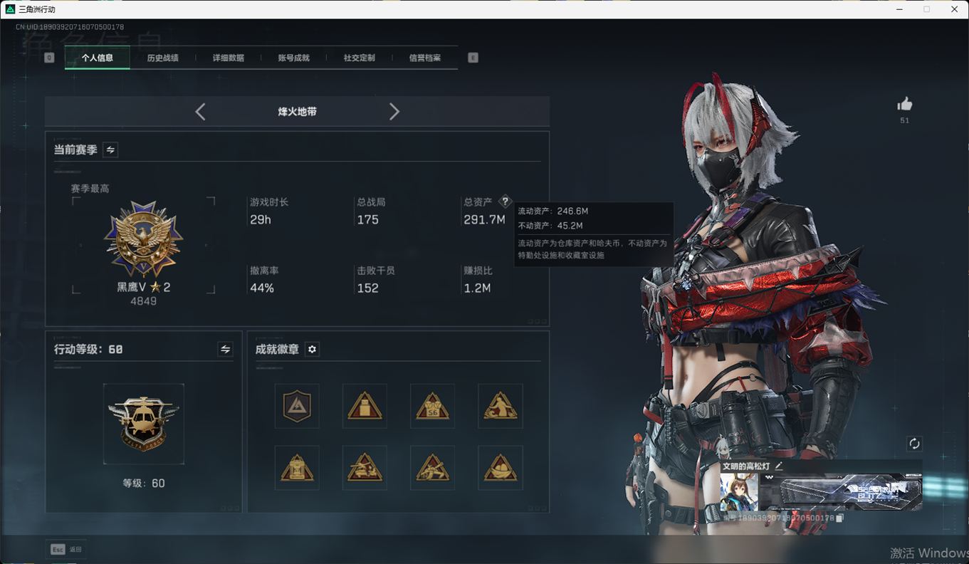 SSN6366/QQ区/哈夫币179W/总资产291.7M/行动等级60/战场等级46/阿萨拉赛季顶