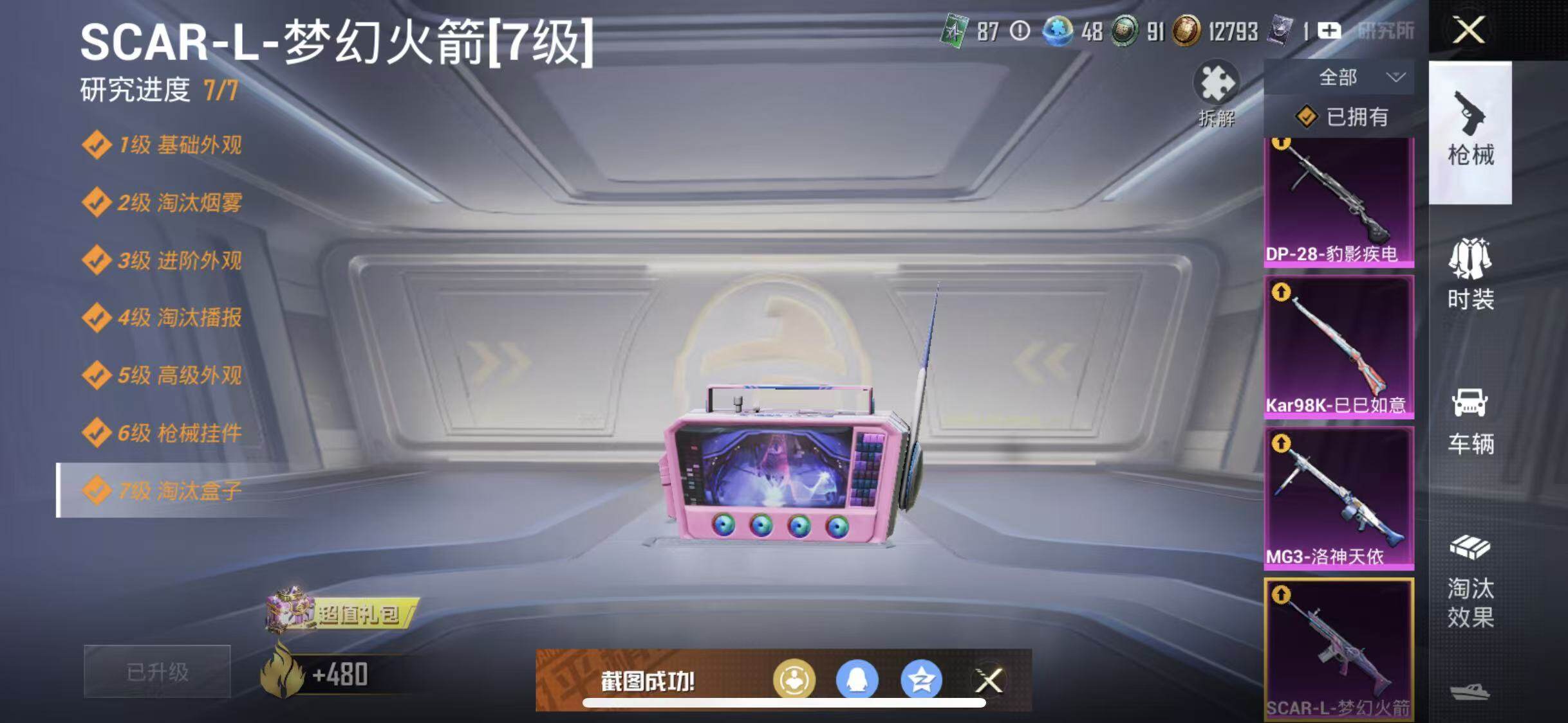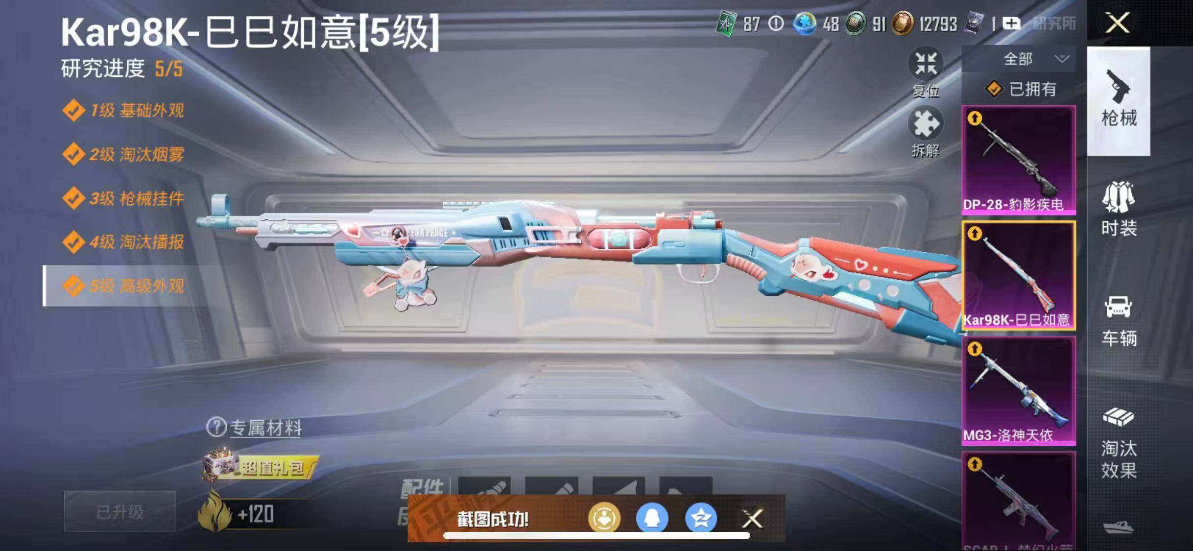 苹果 手Q-11粉装-4特效枪-3载具-2粉色飞行器-67364热力值-5王牌