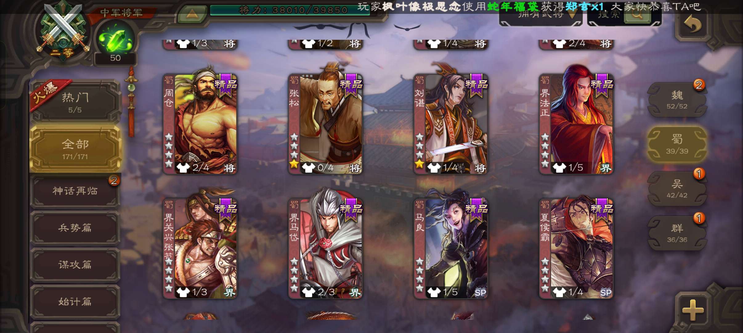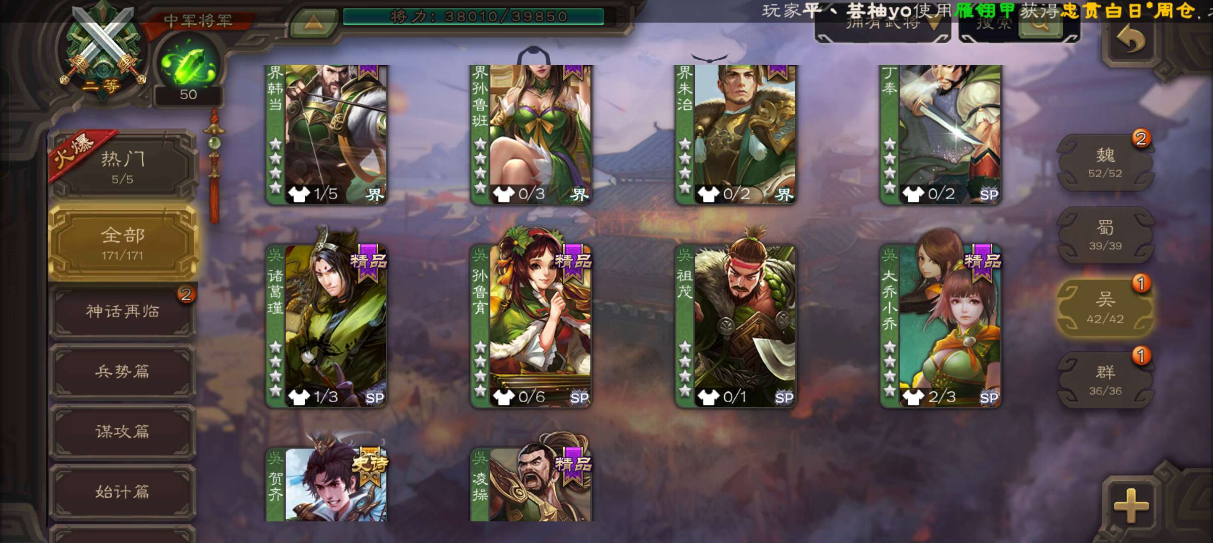 7史诗双神中军,玉龙天子令星周不疑玉龙动界钟会真动周处赵襄贺齐杨修程昱,神吕蒙神周瑜动曹冲171将