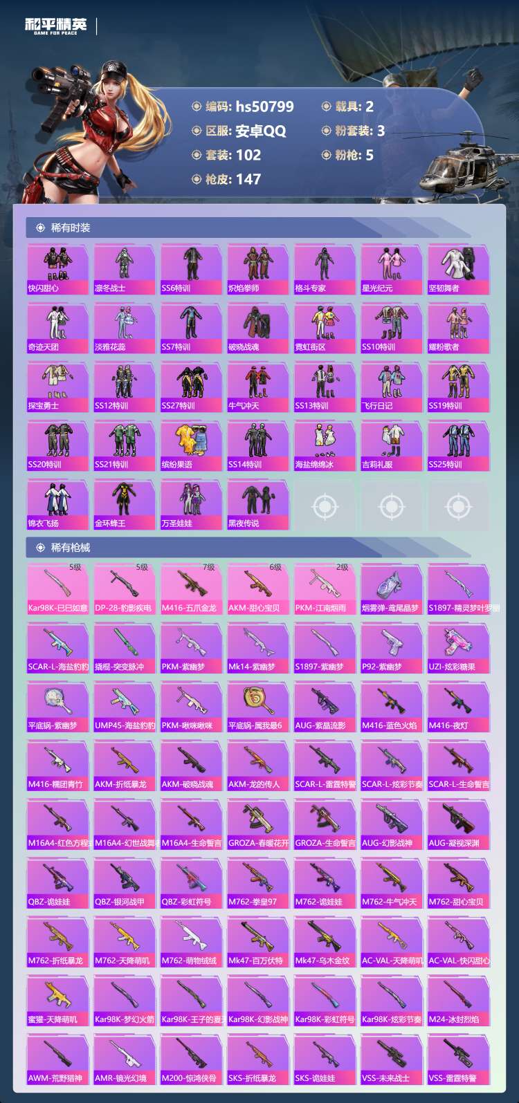 hs50799 安卓手Q-9王牌印记-3粉装-5特效枪-2载具-48123热力值-102套装-147