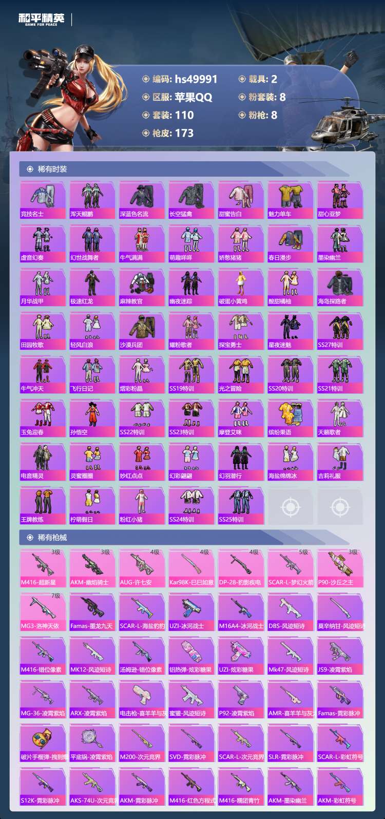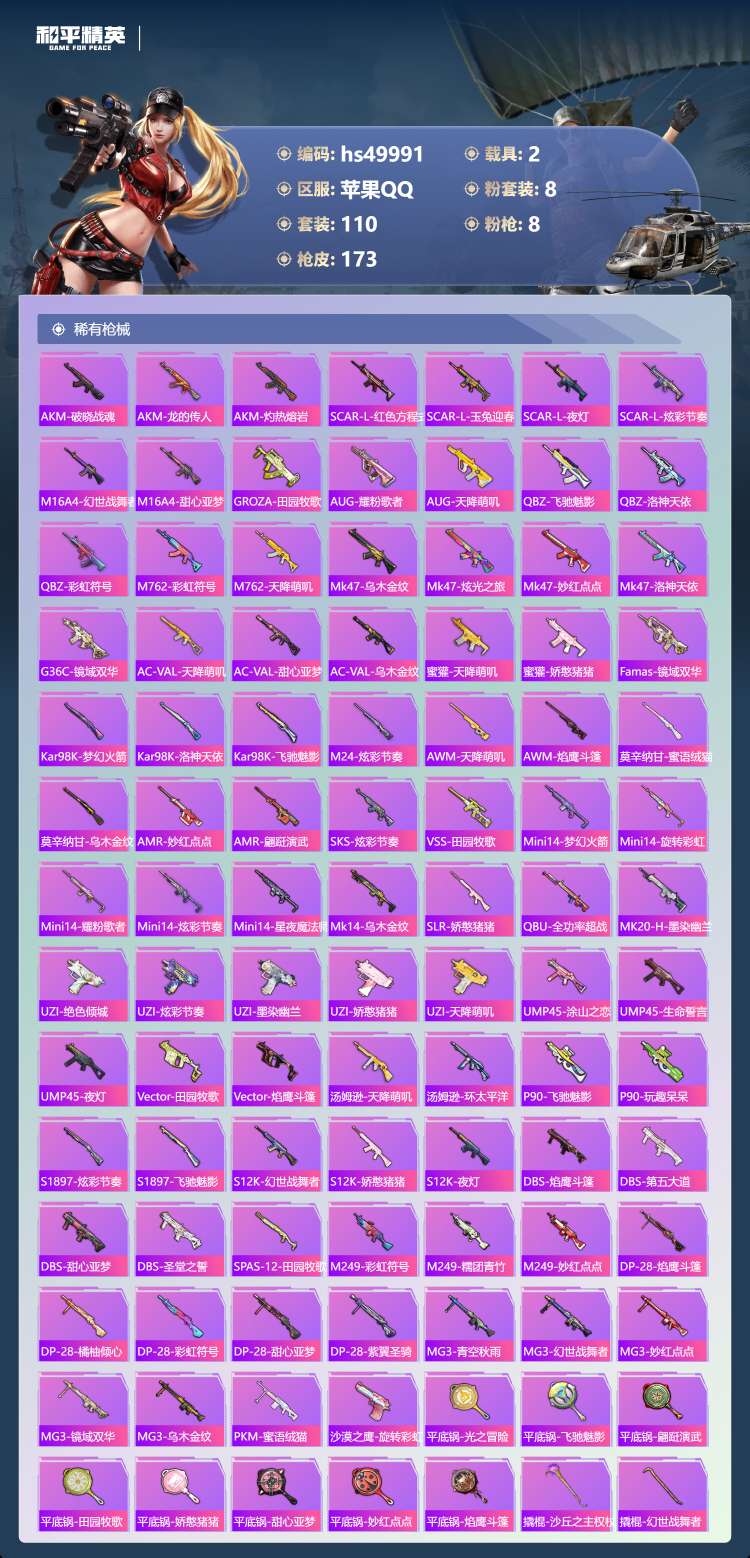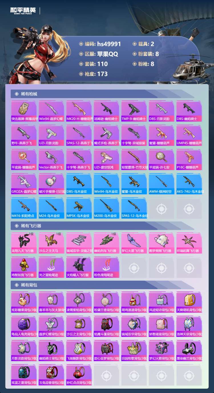hs49991 苹果手Q-10王牌印记-1红装-8粉装-8特效枪-2载具-65721热力值-110套