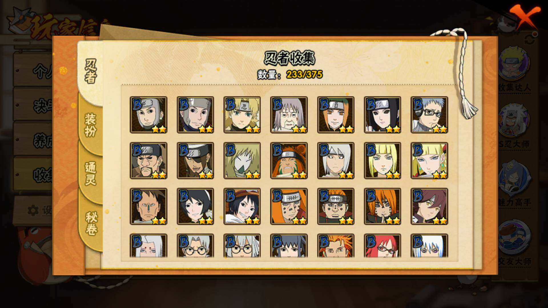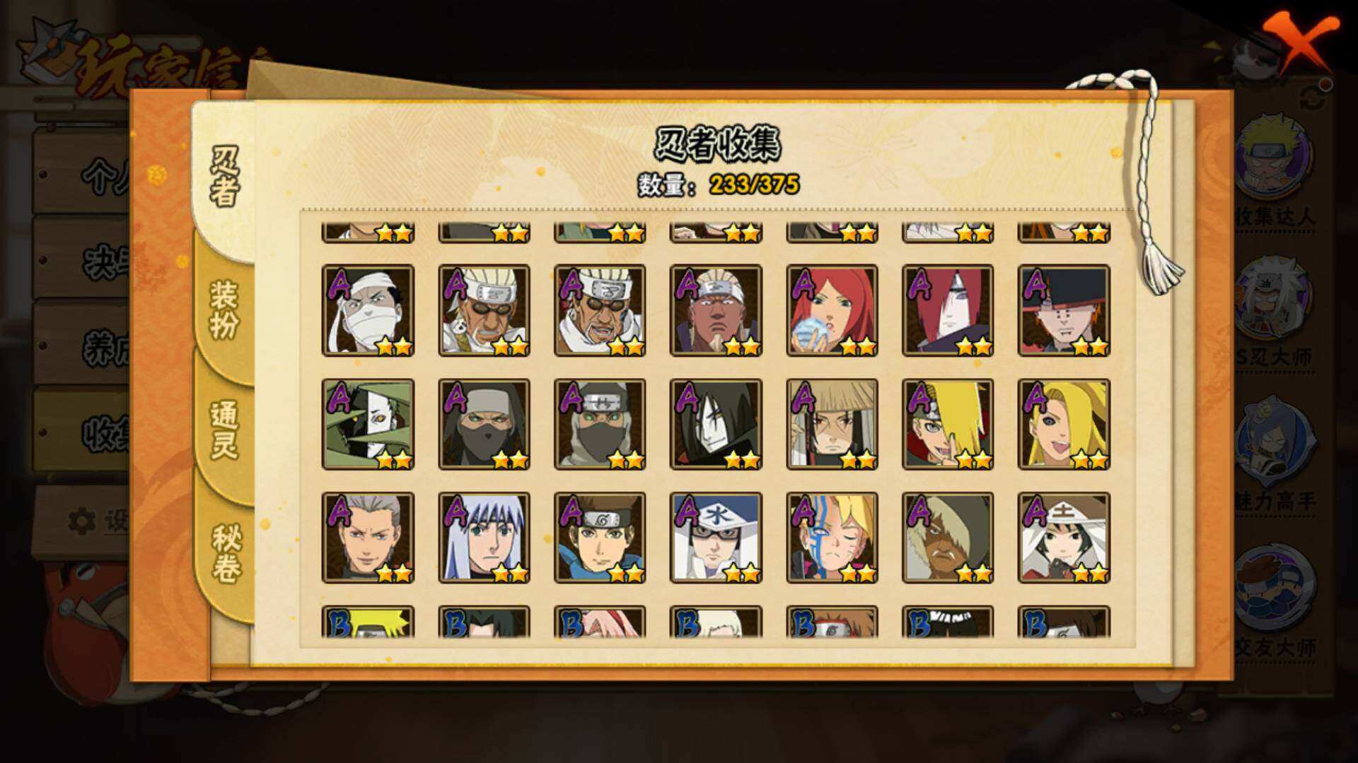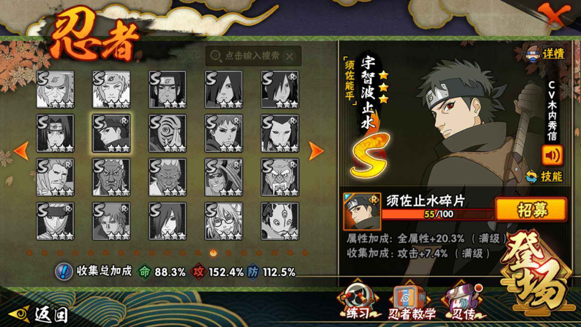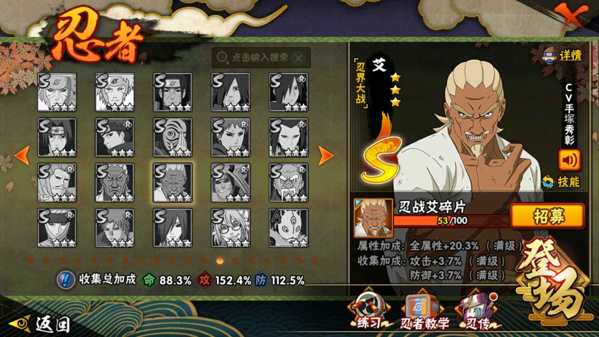 【S级忍者】:半藏「秽土转生」(3星),宇智波鼬「秽土转生」(3星),宇智波斑「秽土转生」(3星),宇智波斑「秽土转生·解」(3星),大野木「忍界大战」(3星),春野樱「忍界大战」(3星),宇智波带土「忍界大战」(3星),千手柱间「木叶创立」(3星),艾「三代目雷影」(3星),自来也「舞之豪