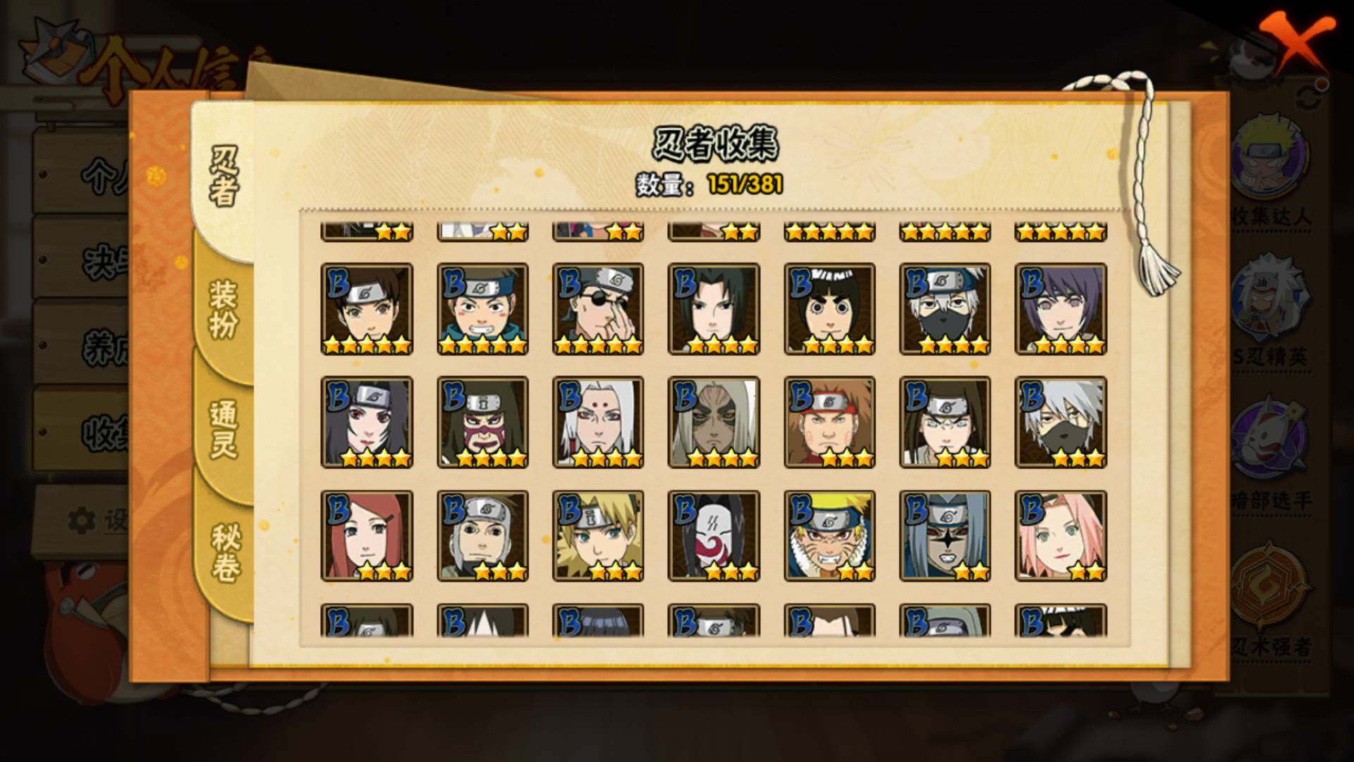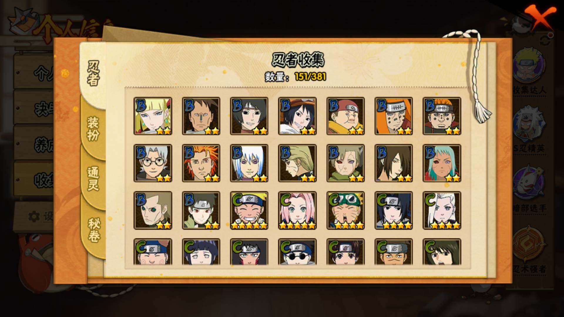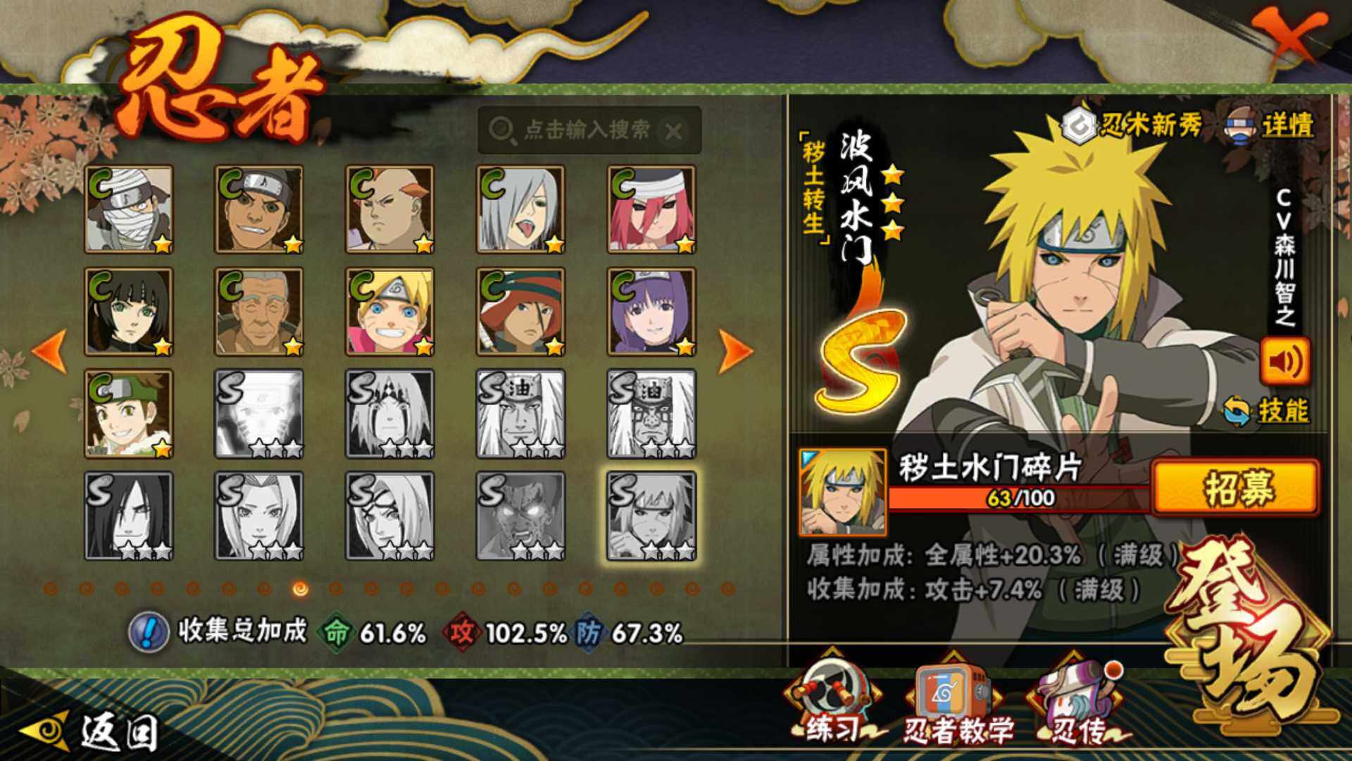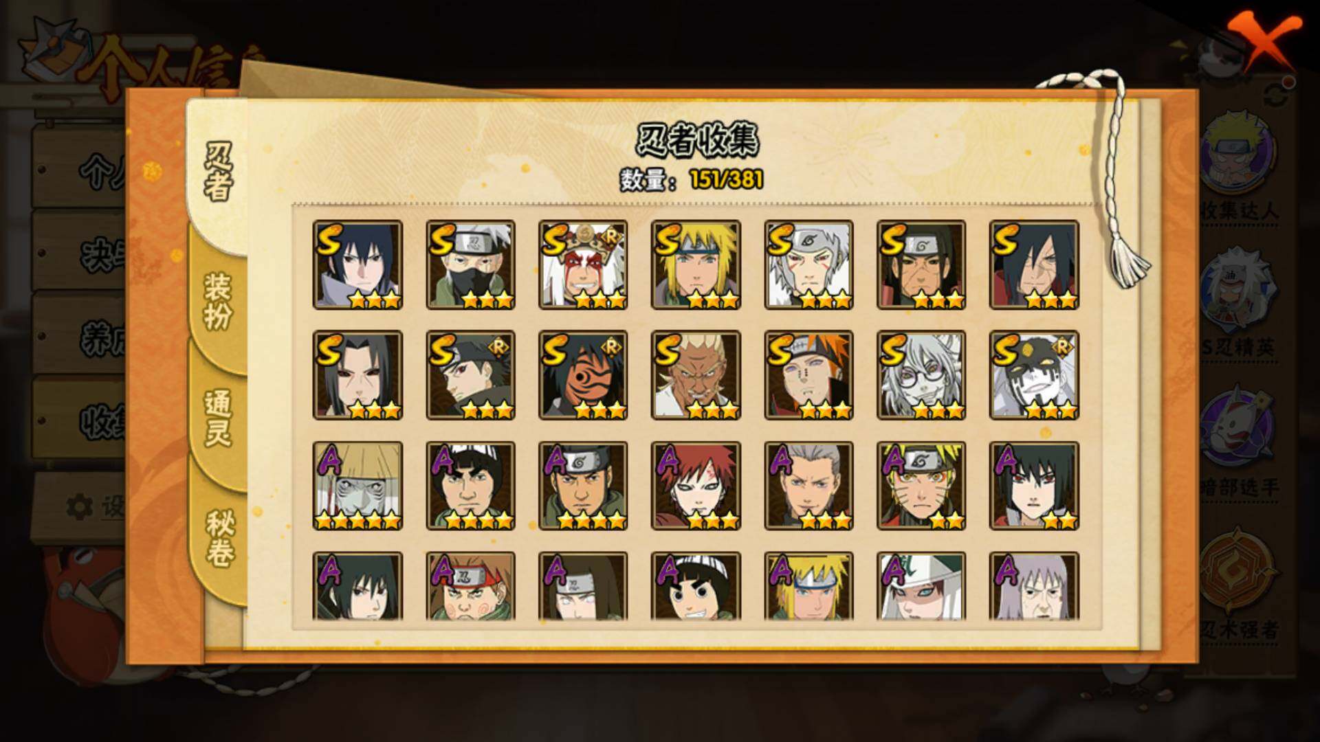 【S级忍者】:千手柱间「秽土转生」(3星),宇智波鼬「秽土转生」(3星),宇智波斑「秽土转生·解」(3星),艾「忍界大战」(3星),宇智波止水「须佐能乎」(3星),旗木卡卡西「须佐能乎」(3星),自来也「舞之豪杰」(3星),千手扉间(3星),波风水门(3星),药师兜「仙人模式」(3星),神秘面具男「红夜之刃」(3星),佩恩「天道