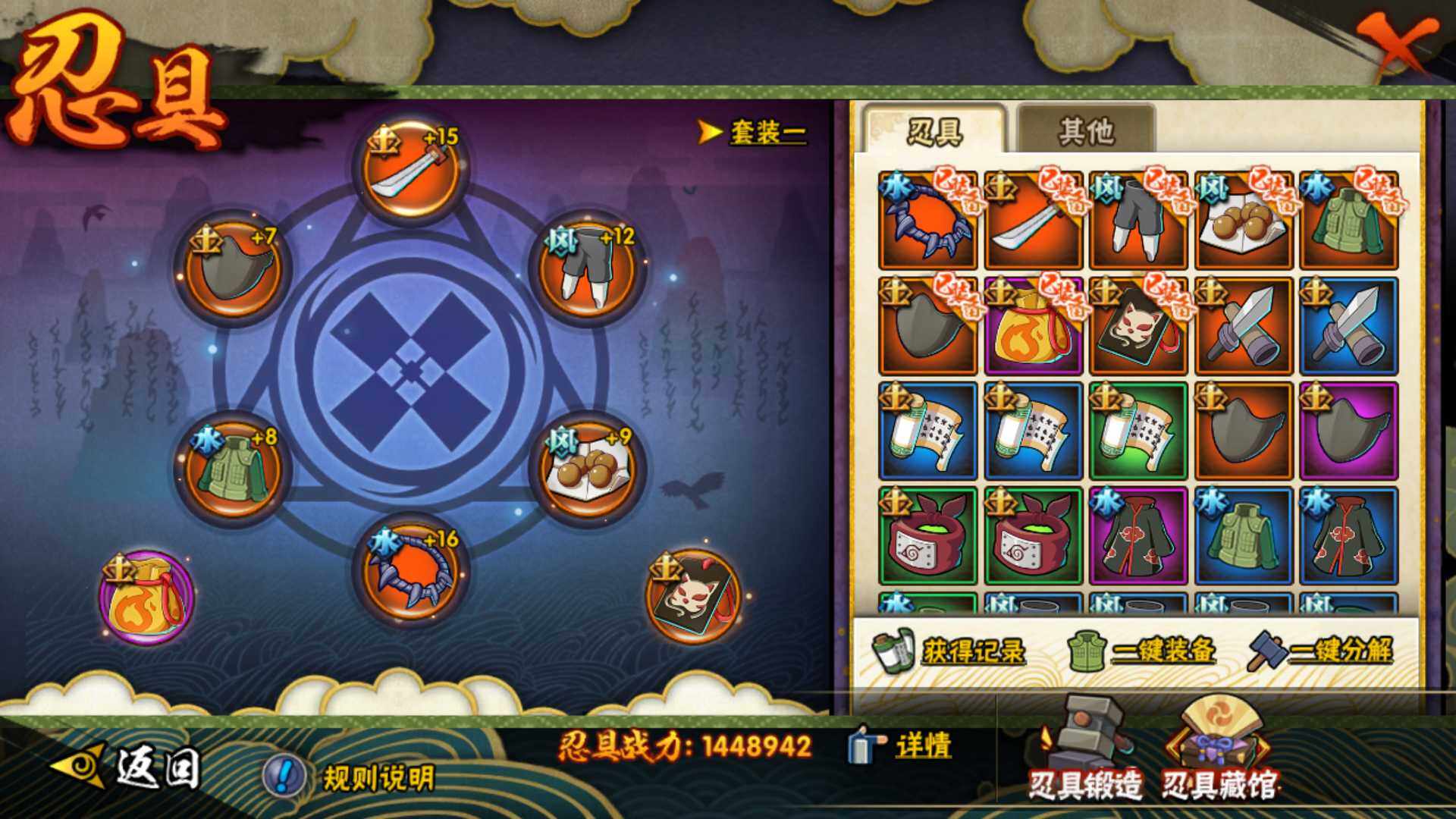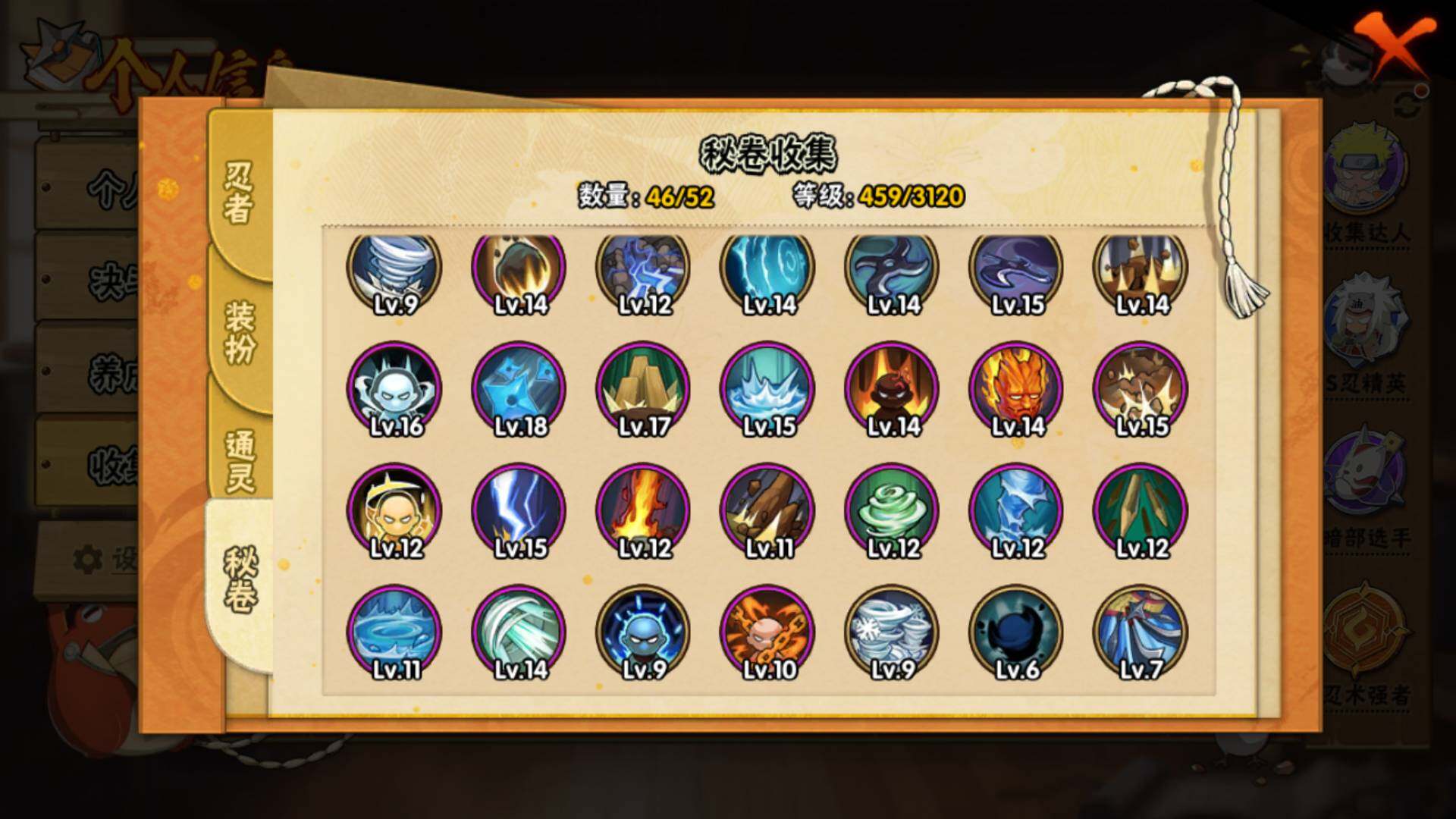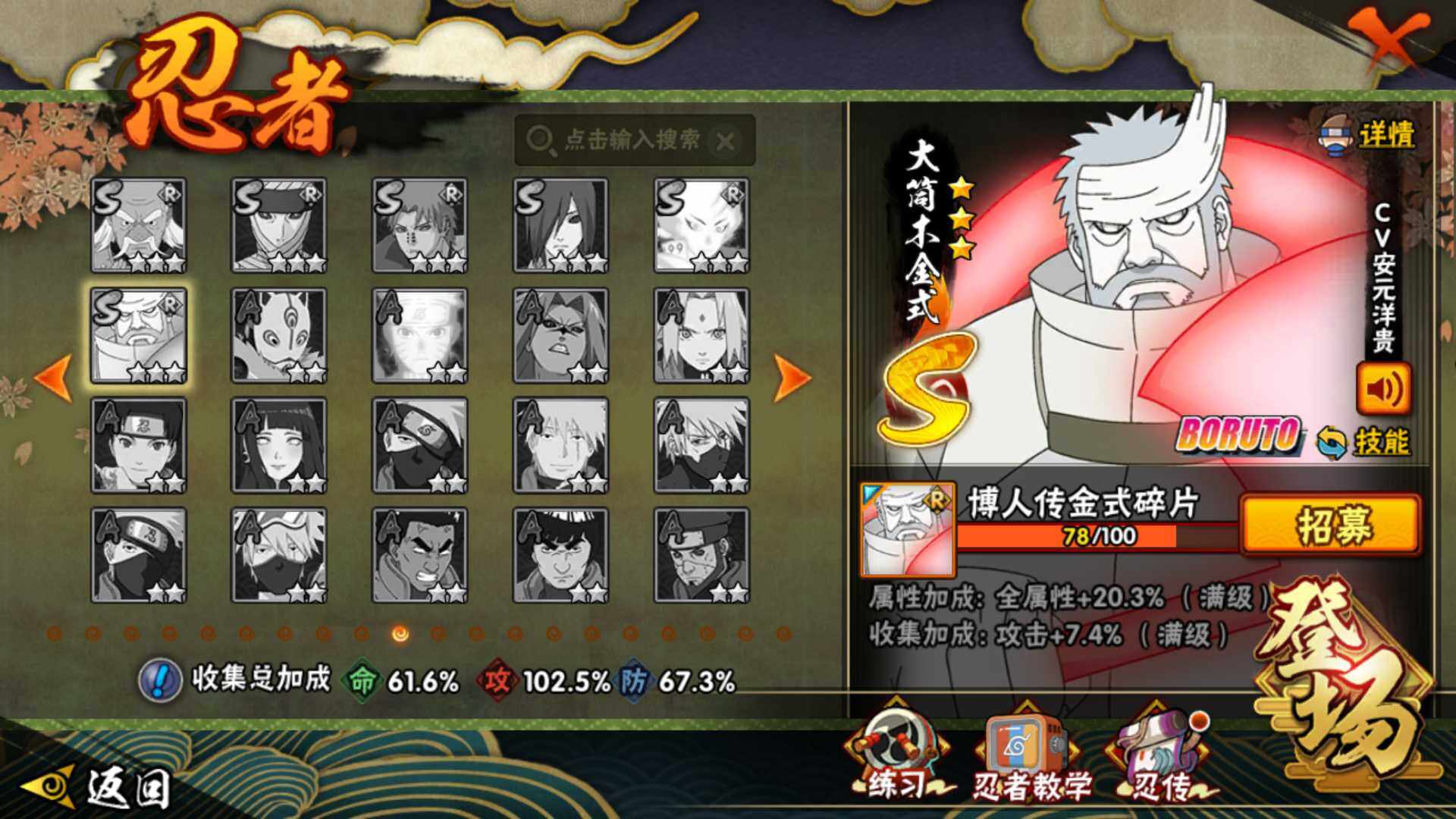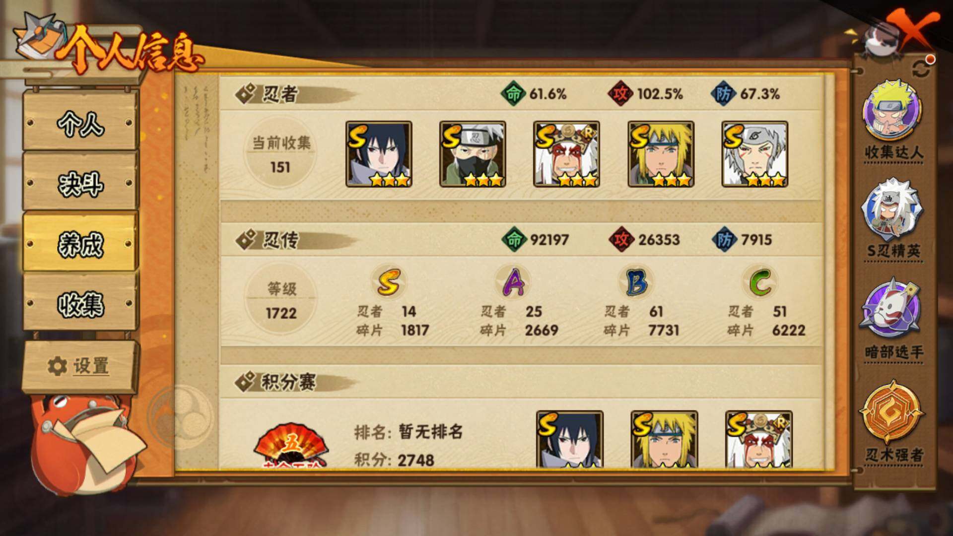 【S级忍者】:千手柱间「秽土转生」(3星),宇智波鼬「秽土转生」(3星),宇智波斑「秽土转生·解」(3星),艾「忍界大战」(3星),宇智波止水「须佐能乎」(3星),旗木卡卡西「须佐能乎」(3星),自来也「舞之豪杰」(3星),千手扉间(3星),波风水门(3星),药师兜「仙人模式」(3星),神秘面具男「红夜之刃」(3星),佩恩「天道