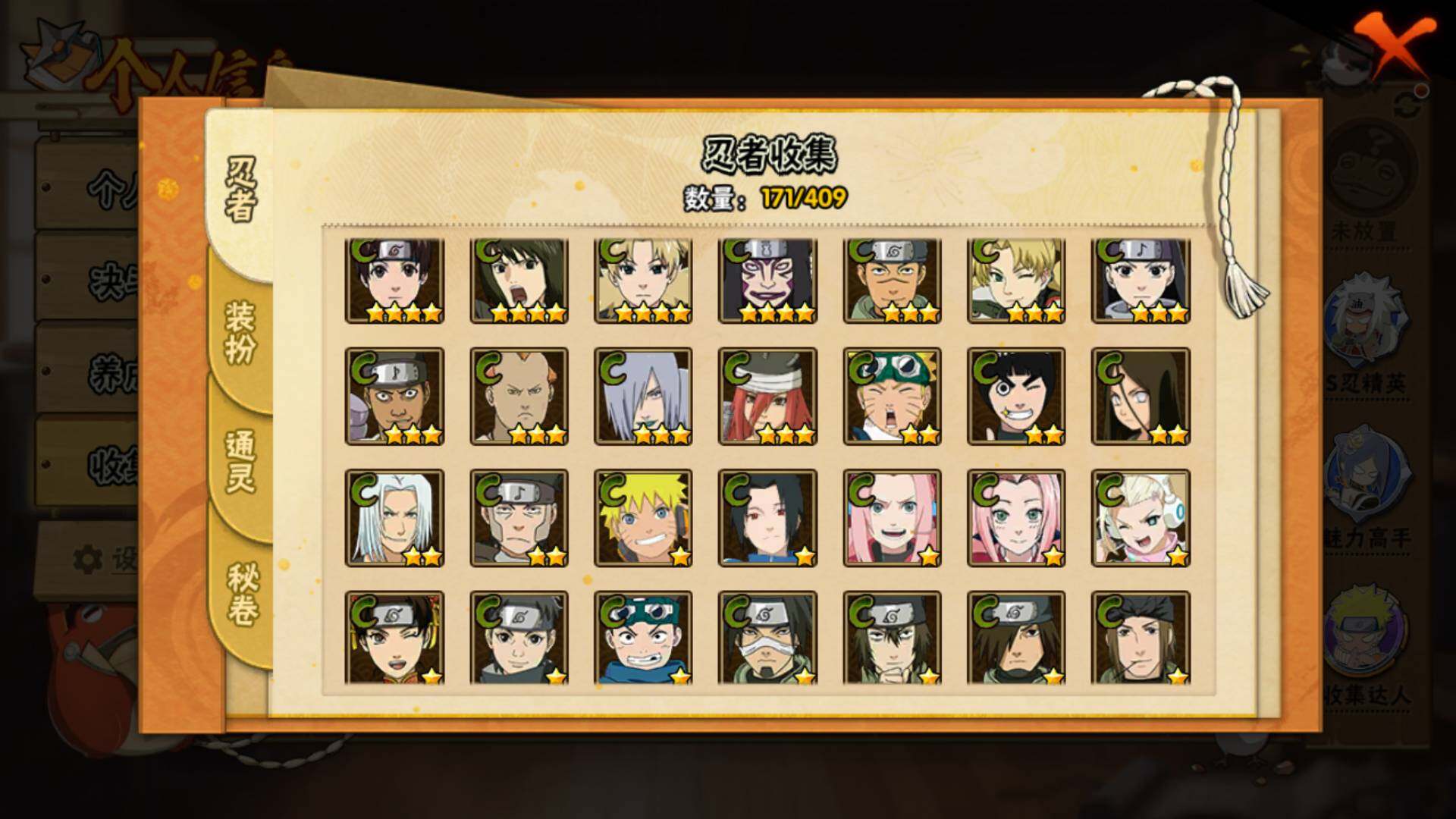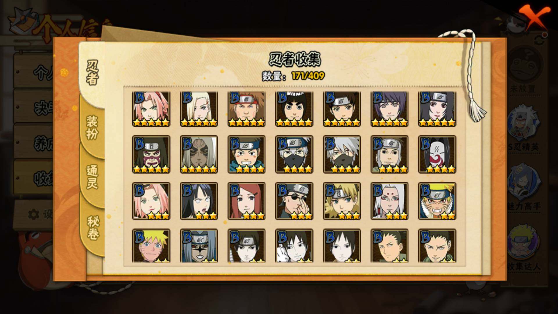 【S级忍者】:长门「秽土转生」(3星),猿飞日斩「秽土转生」(3星),波风水门「秽土转生」(3星),千手扉间「秽土转生」(3星),宇智波斑「秽土转生」(3星),宇智波鼬「须佐能乎」(3星),自来也「舞之豪杰」(3星),大蛇丸(3星),纲手「百豪」(3星),千手扉间(3星),宇智波斑(3星),波风水门(3星),迈特凯「死门」(3星)