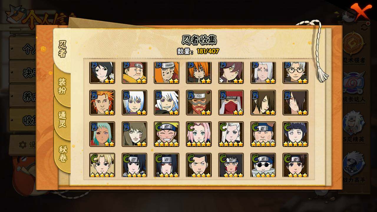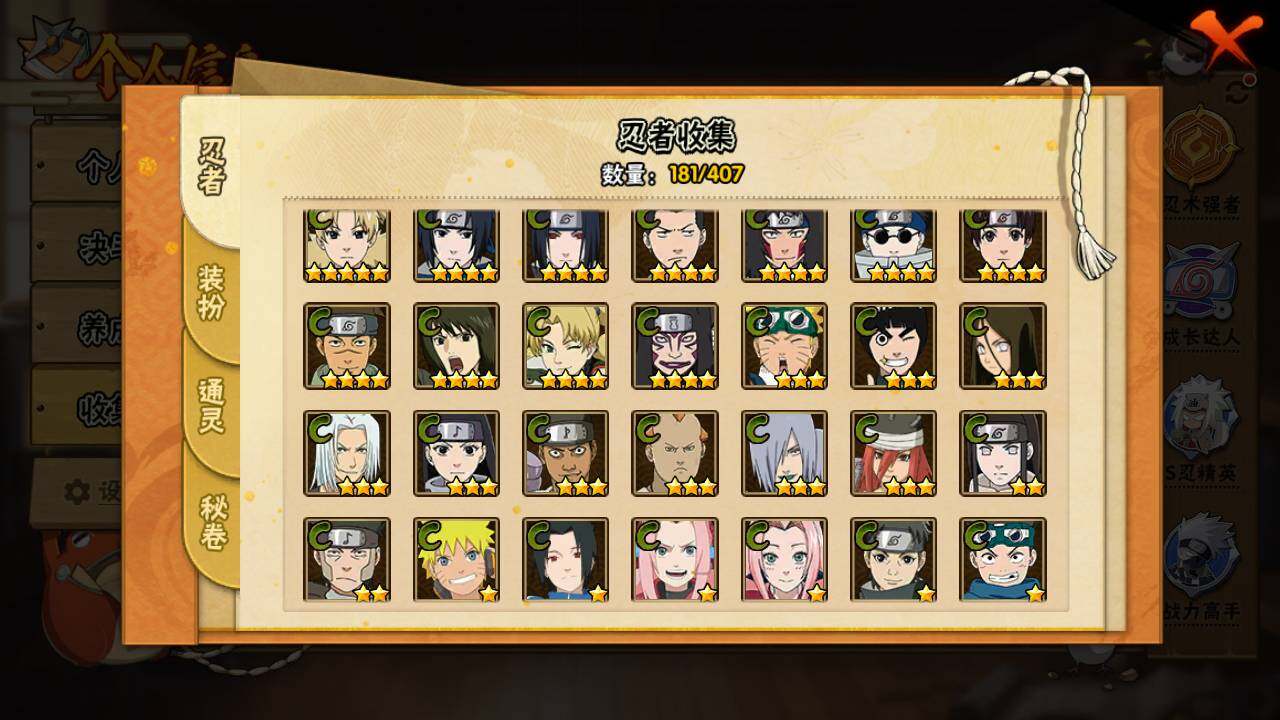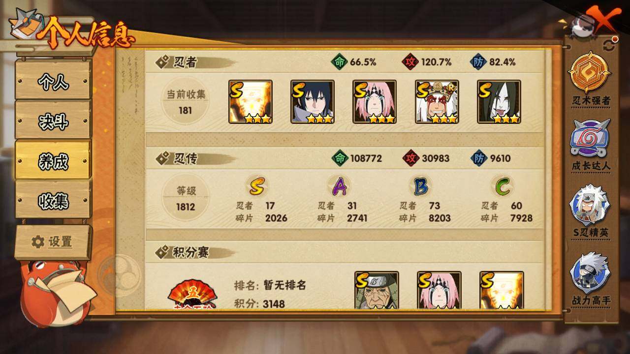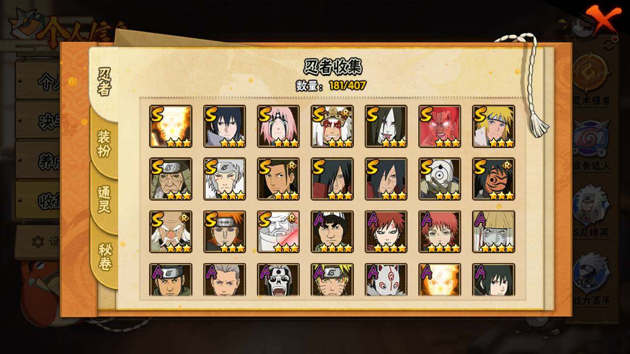 【S级忍者】:猿飞日斩「秽土转生」(3星),宇智波斑「秽土转生」(3星),宇智波斑「秽土转生·解」(3星),大野木「忍界大战」(3星),春野樱「忍界大战」(3星),千手柱间「木叶创立」(3星),自来也「舞之豪杰」(3星),大蛇丸(3星),千手扉间(3星),波风水门(3星),神秘面具男「红夜之刃」(3星),漩涡鸣人「