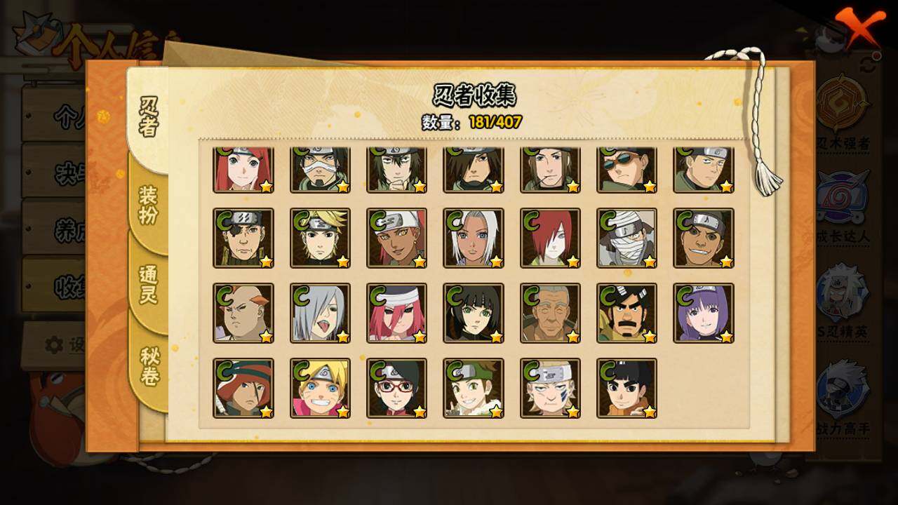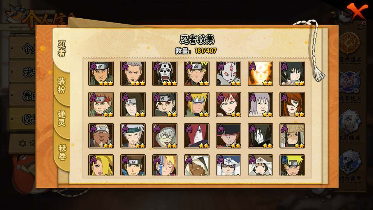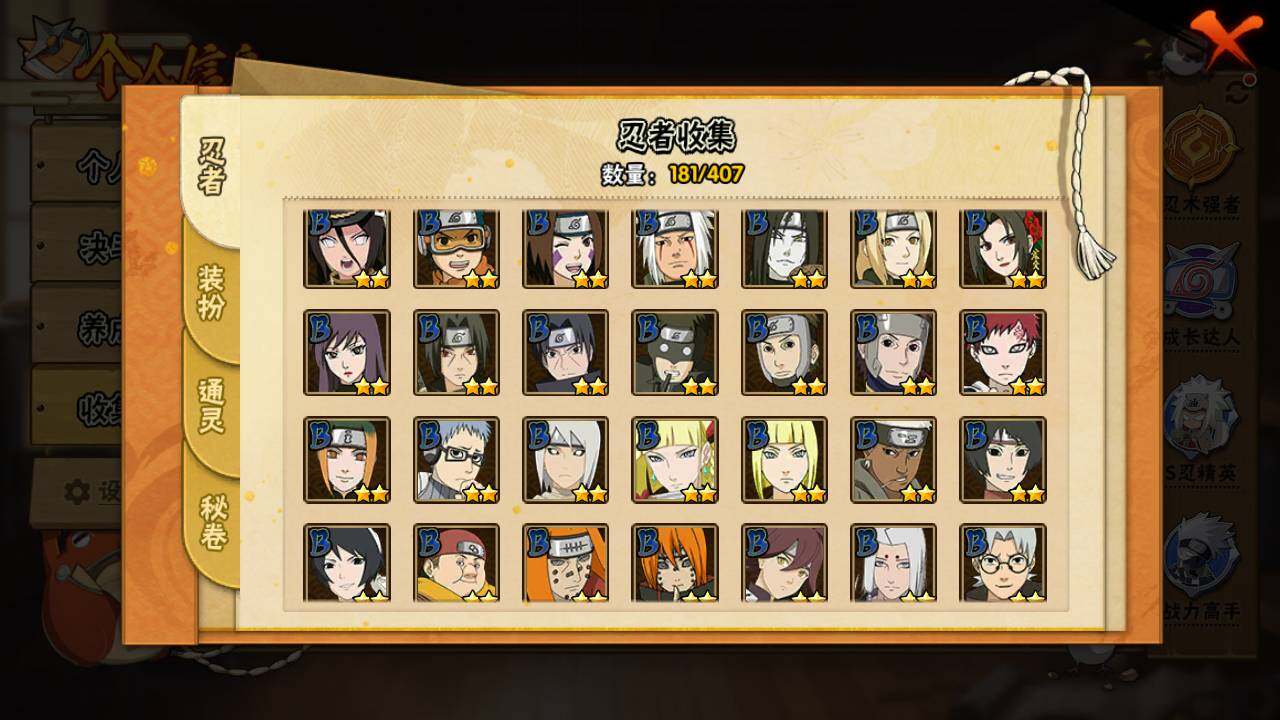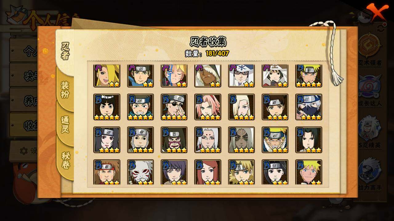 【S级忍者】:猿飞日斩「秽土转生」(3星),宇智波斑「秽土转生」(3星),宇智波斑「秽土转生·解」(3星),大野木「忍界大战」(3星),春野樱「忍界大战」(3星),千手柱间「木叶创立」(3星),自来也「舞之豪杰」(3星),大蛇丸(3星),千手扉间(3星),波风水门(3星),神秘面具男「红夜之刃」(3星),漩涡鸣人「