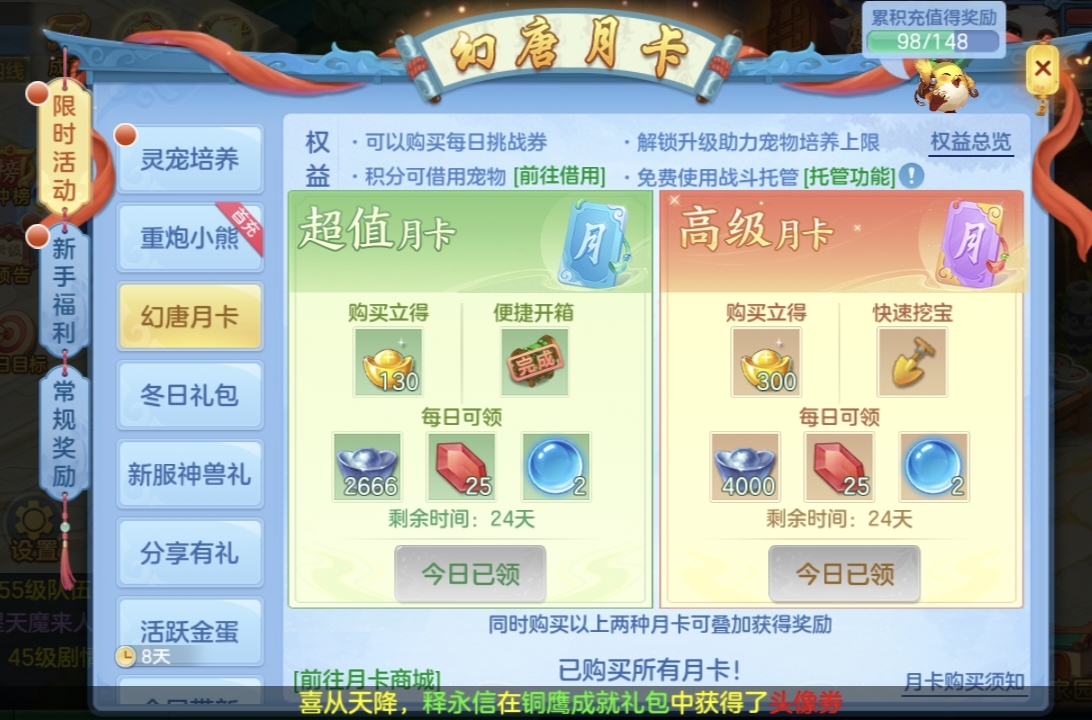 幻唐志:逍遥外传(神武4)【安卓官方】最新区少年英雄,男冥月,总价值85万银子,高级月卡