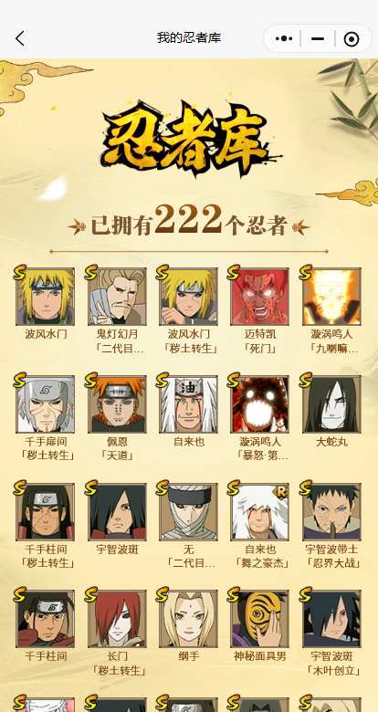 【S忍者】大筒木金式,漩涡鸣人「九喇嘛连结」,迈特凯「S门」,宇智波斑「木叶创立」,宇智波带土「忍界大战」,千手柱间「秽土转生」,自来也「舞之豪杰」,漩涡鸣人「暴怒·第六尾」,宇智波鼬「秽土转生」,宇智波斑「秽土转生」,千手扉间「秽土转生」,纲手「百豪」,波风水门「秽土转生」,无「二代目土影」,猿飞日斩「秽土转生」,长门「
