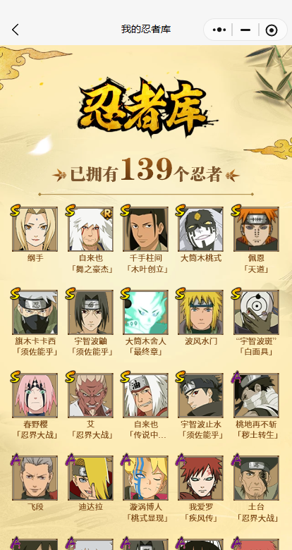 【S忍者】宇智波止水「须佐能乎」,艾「忍界大战」,大筒木桃式,千手柱间「木叶创立」,春野樱「忍界大战」,自来也「舞之豪杰」,旗木卡卡西「须佐能乎」,大筒木舍人「最终章」,自来也「传说中的三忍」,宇智波斑「白面具」,宇智波鼬「须佐能乎」,佩恩「天道」,波风水门,纲手,