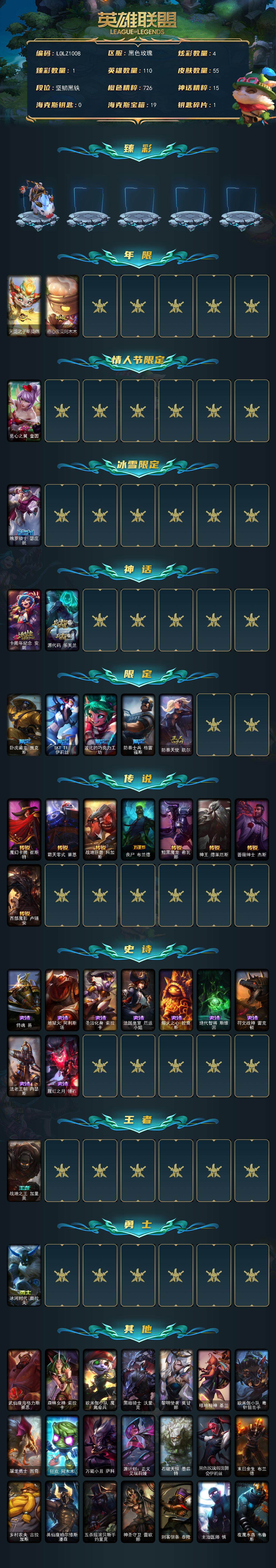 【LOLZ1008】110英雄/55皮肤/2神话/9限定/1臻彩/4炫彩/8传说/9史诗/未定级/无畏骑士瑟庄妮赤子初心/天龙之子斯莫德/点心宝贝阿木木/觅心之翼奎因/魄罗骑士瑟庄妮/十周年纪念安妮/源代码乐芙兰/卧虎藏龙贾克斯/SKTT1伊莉丝/波比的巧克力工坊/防暴士兵格雷福斯/防暴天使凯尔/魔幻卡牌崔斯特/霸天零式赛恩/战地巨兽科加斯/丧尸布兰德/黯黑魔龙希瓦娜/神王德莱厄斯/蔷薇绅士杰斯/西部魔影卢锡安/侍魂易/地狱火阿利斯塔/圣洁化身索拉卡/法国皇室厄运小姐/熔火之心拉莫斯/绝代智将斯