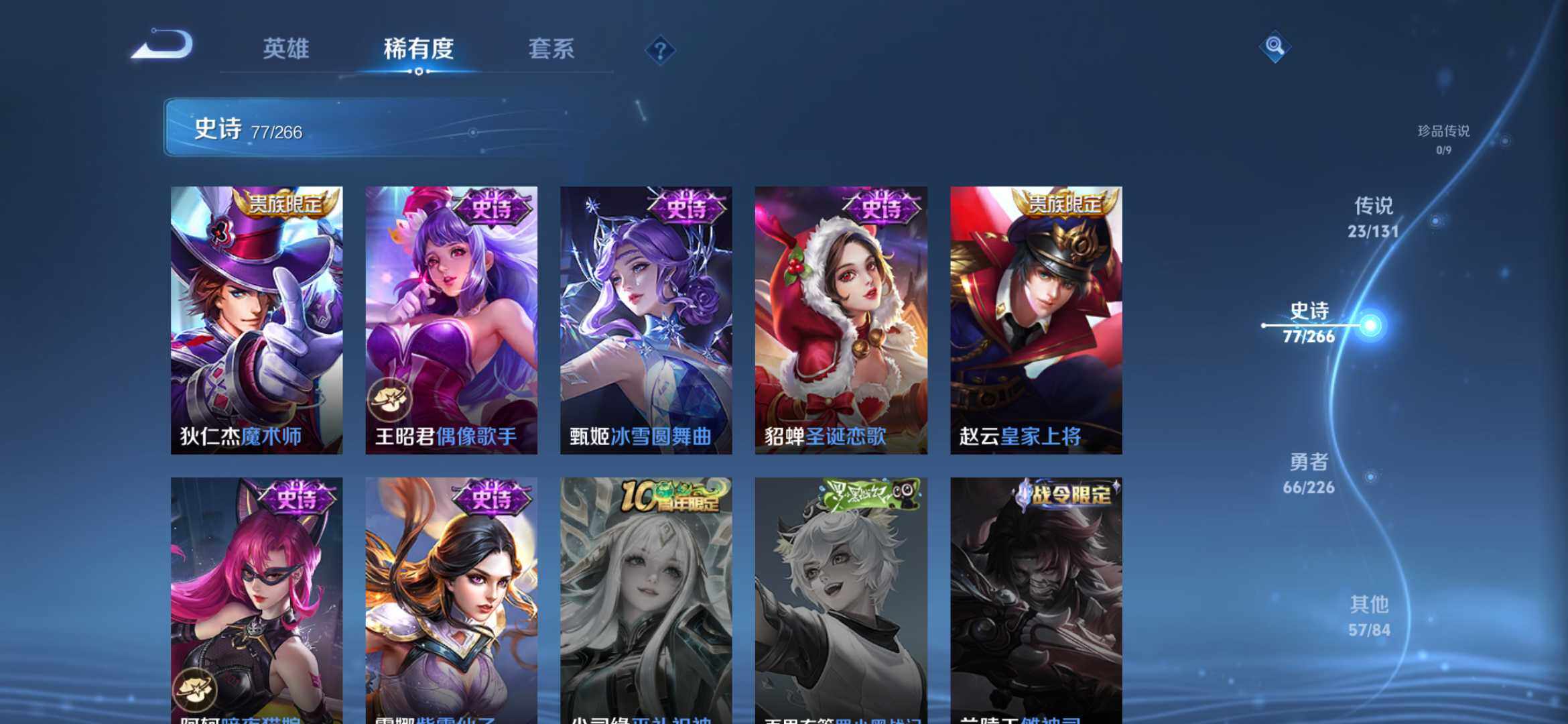 【传说皮肤】:后羿神树通天,曜李逍遥 ,兰陵王默契交锋,公孙离祈雪灵祝,诸葛亮时雨天司,铠绛天战甲,镜炽阳神光,虞姬启明星使,孙悟空零号赤焰,关羽武圣,