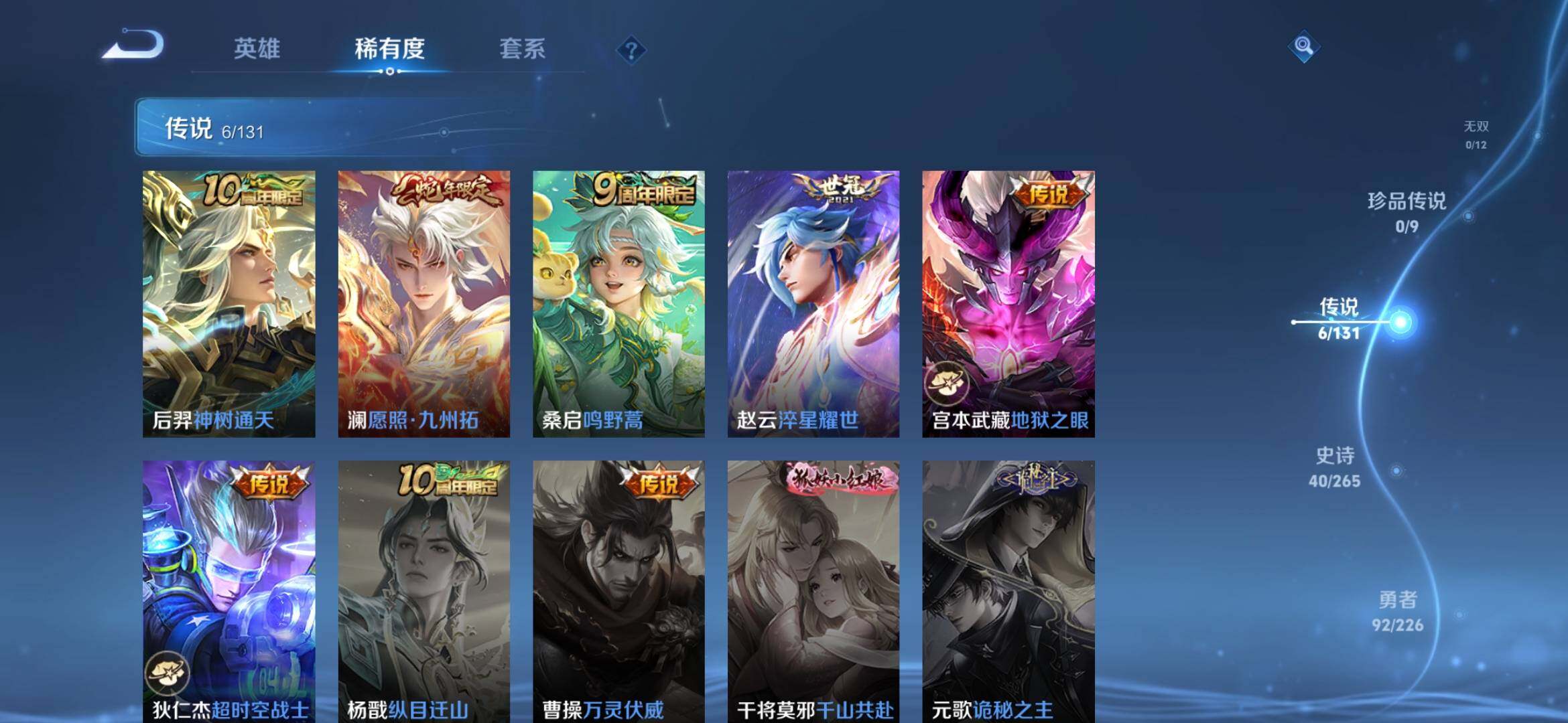 【传说皮肤】:后羿神树通天,澜愿照九州拓,桑启鸣野蒿,赵云淬星耀世,宫本武藏地狱之眼,狄仁杰超时空战士