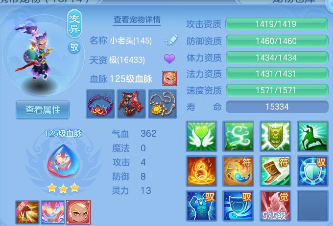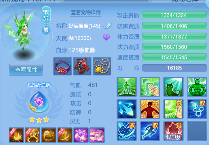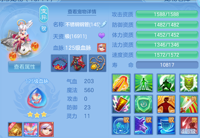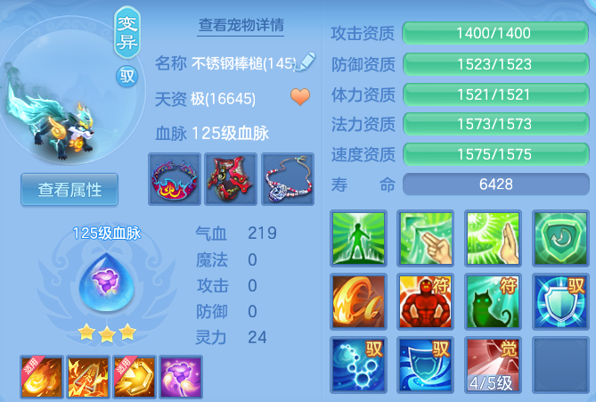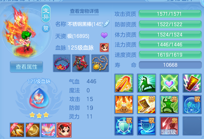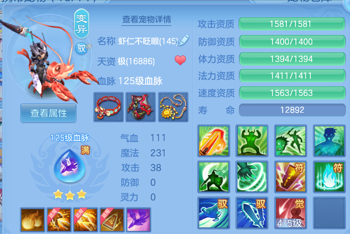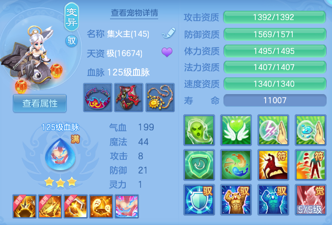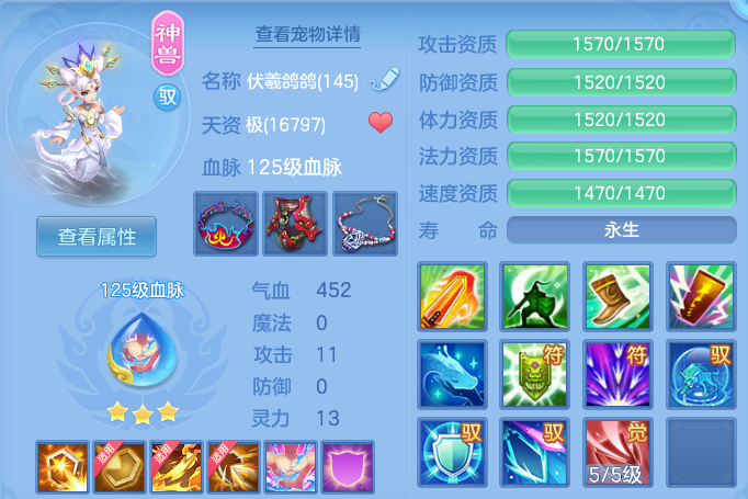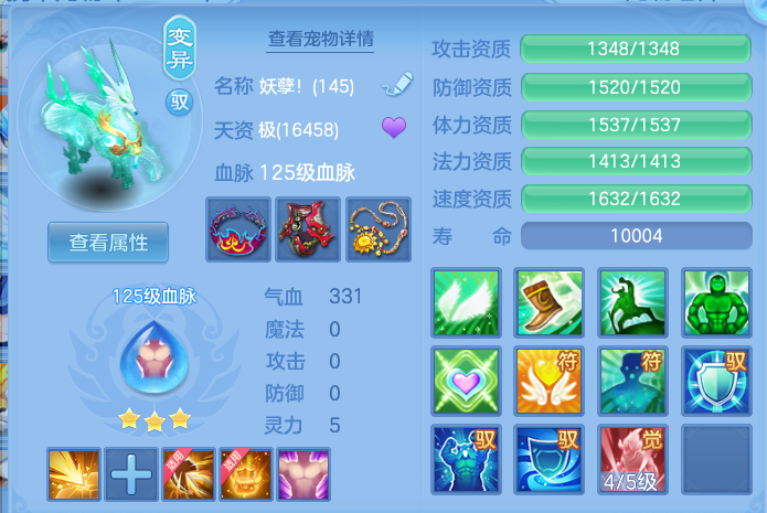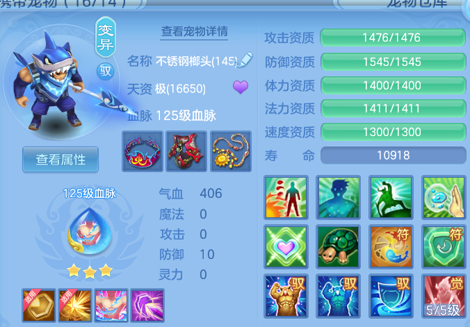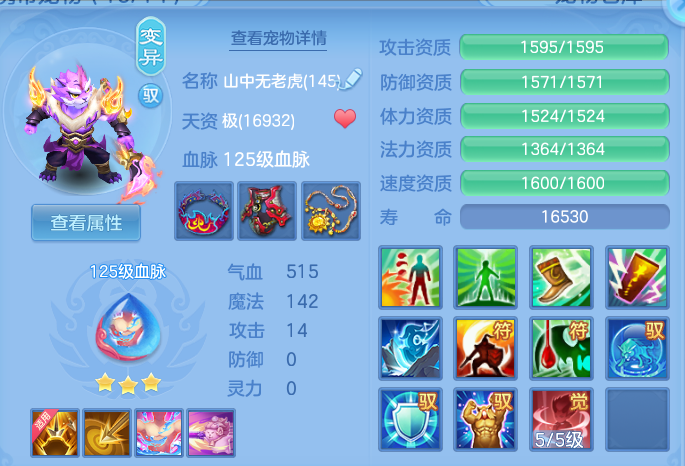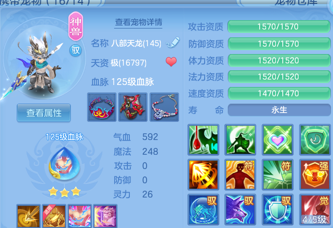 9个满兽魂,11个专属天赋,8个宝宝皮肤,玉龙和蛇都有,仓库里还有很多神兽灵,可以秒换神兽,宝宝很多