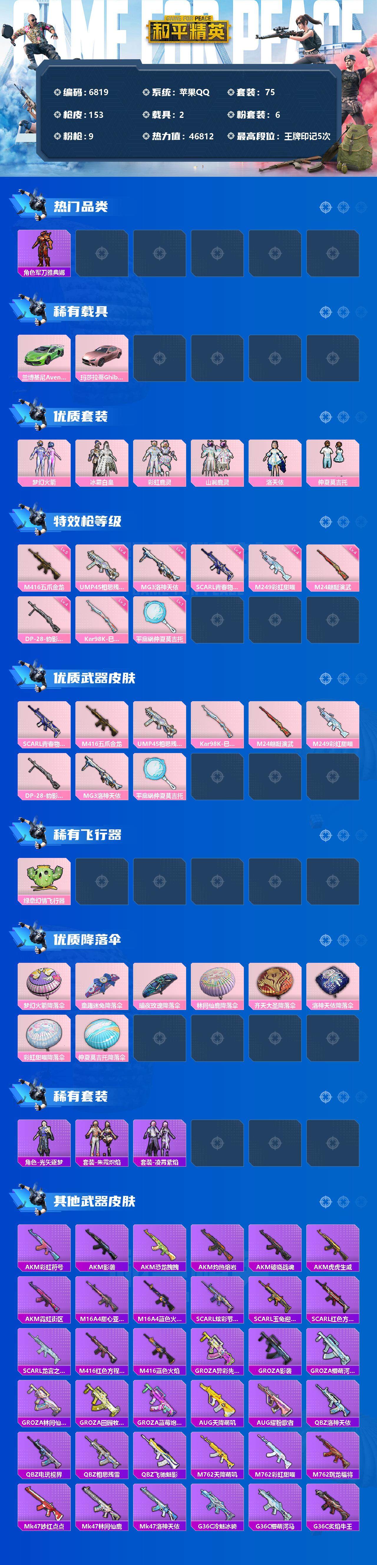 【6819】【商品标题】:苹果 手Q-6粉装-9特效枪-2载具-1粉色飞行器-46812热力值-5王牌印记-75套装-153枪皮