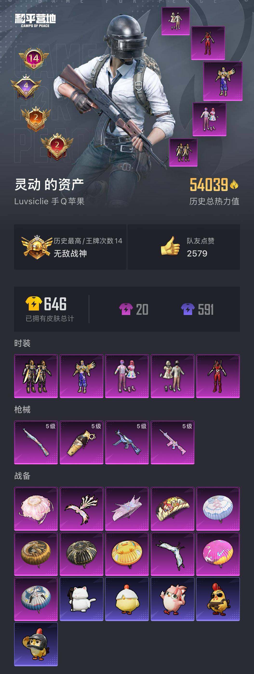 【AZH1576】苹果 手Q【14印记无敌战神框 红螳螂金靴子小丑鱼】-无敌战神框-5粉装-4特效枪-0载具-2粉色飞行器-54039热力值-14王牌印记-148套装-173枪皮