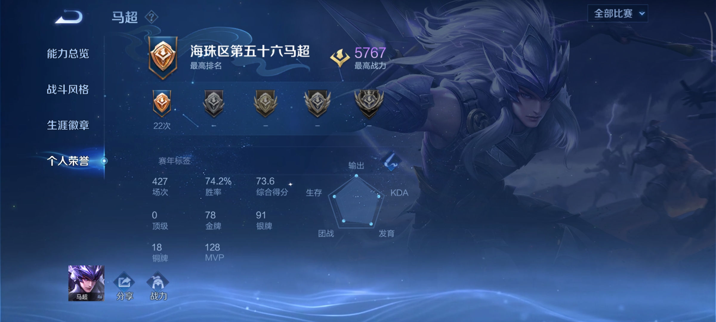 基本一个区一个英雄,都是战绩比较好的,号主主玩的355花木兰跟312区马超,炸鱼把妹首选
