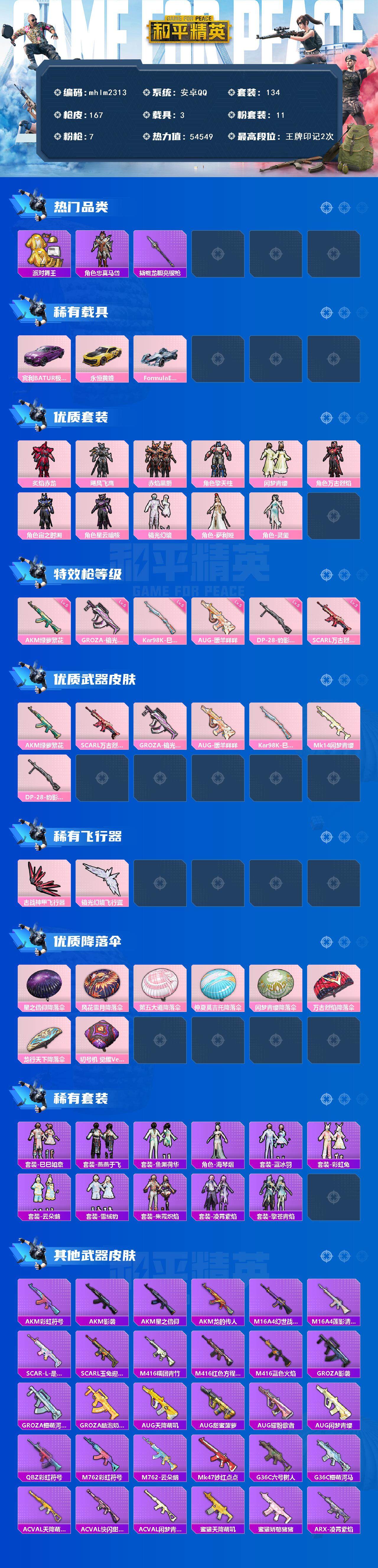 【mhlm2313】安卓 手Q-11粉装-7特效枪-3载具-3粉色飞行器-54549热力值-2王牌印记-134套装-167枪皮