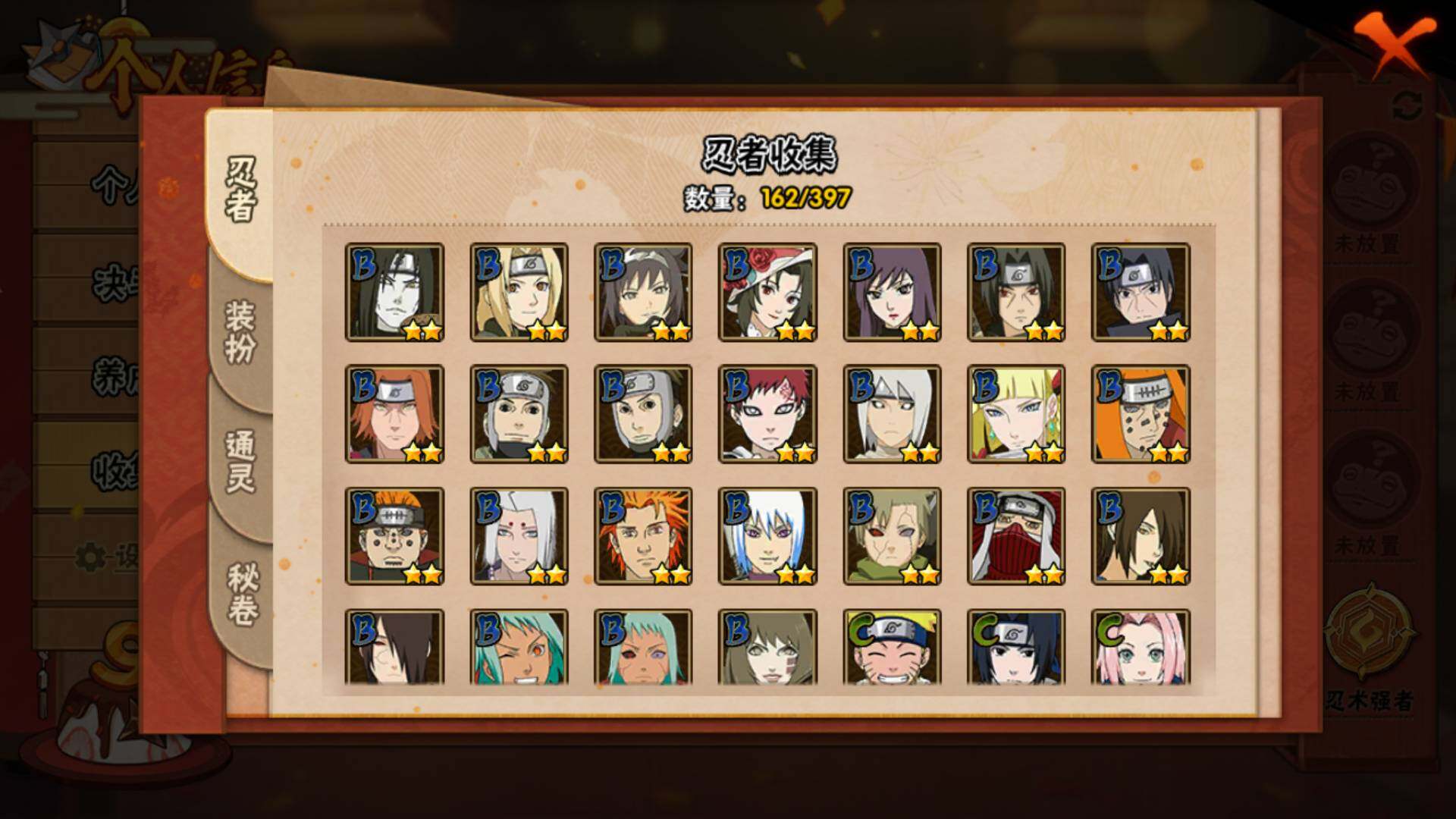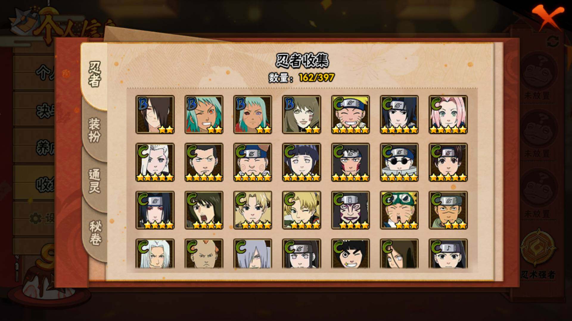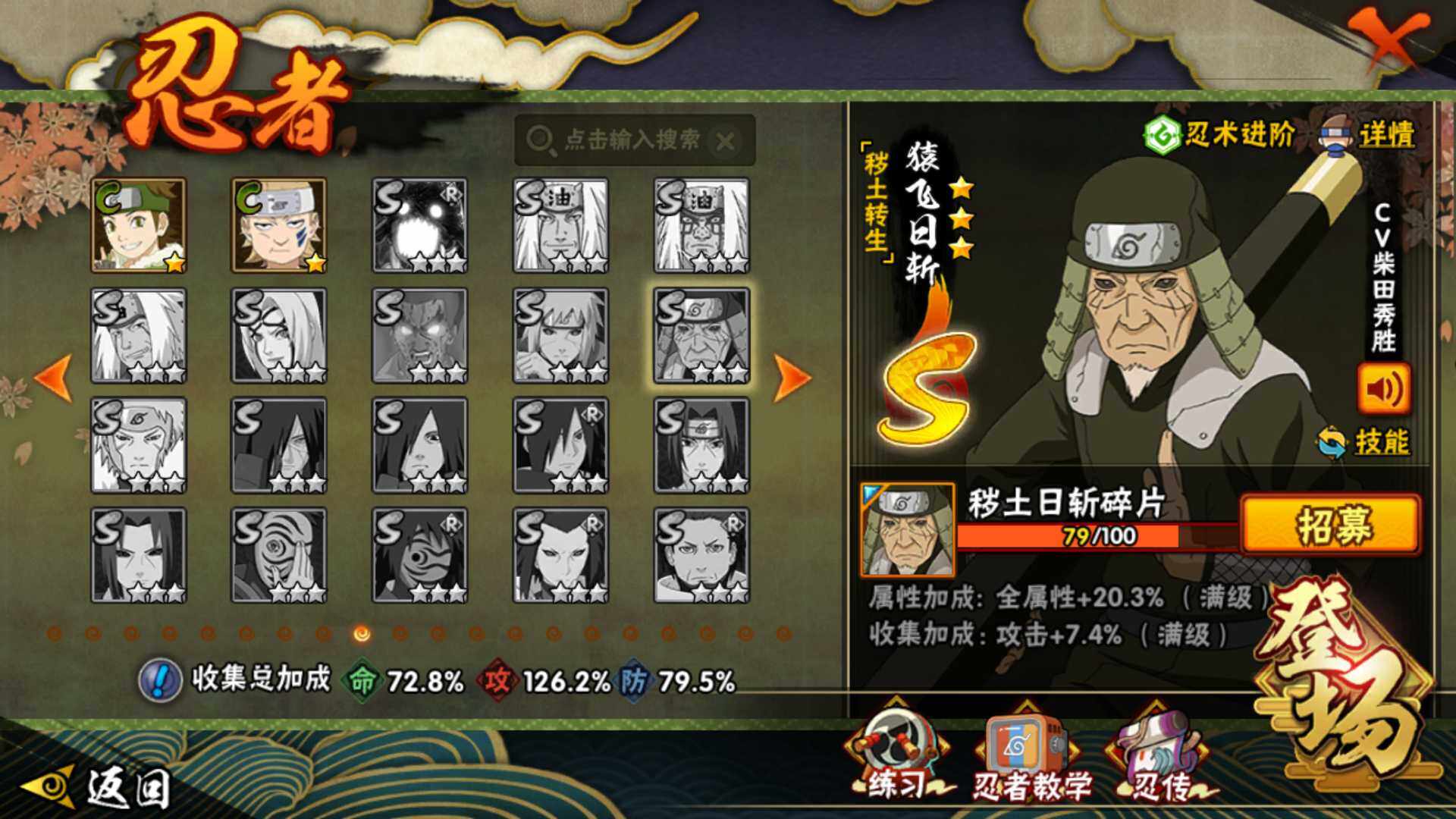 【S级忍者】:千手扉间「秽土转生」(3星),千手柱间「秽土转生」(3星),宇智波斑「秽土转生·解」(3星),春野樱「忍界大战」(3星),宇智波带土「忍界大战」(3星),艾「忍界大战」(3星),宇智波止水「须佐能乎」(3星),旗