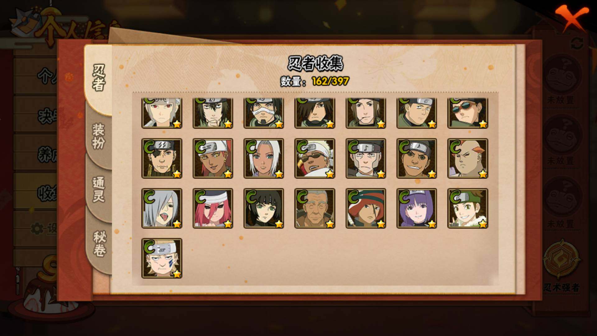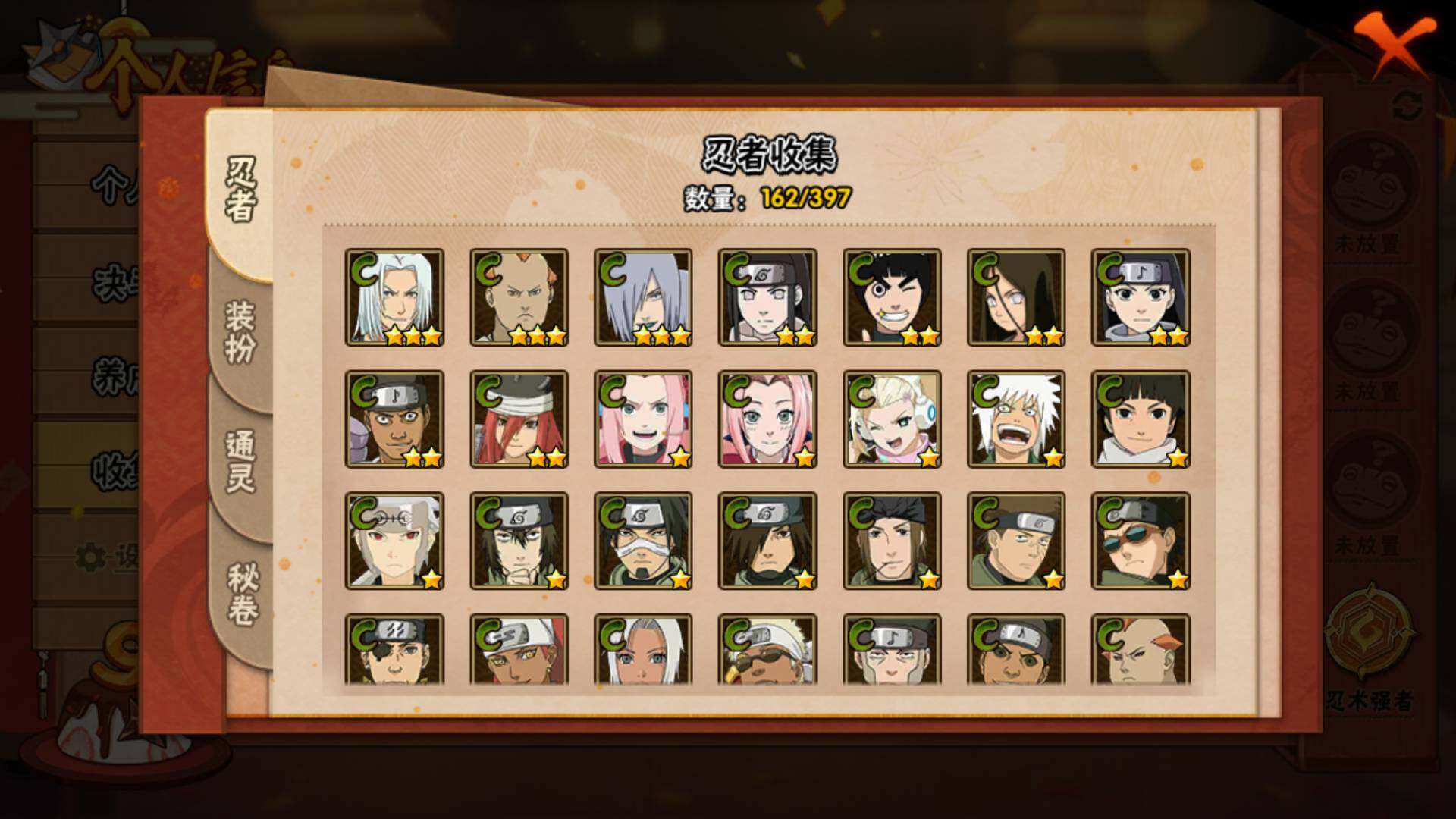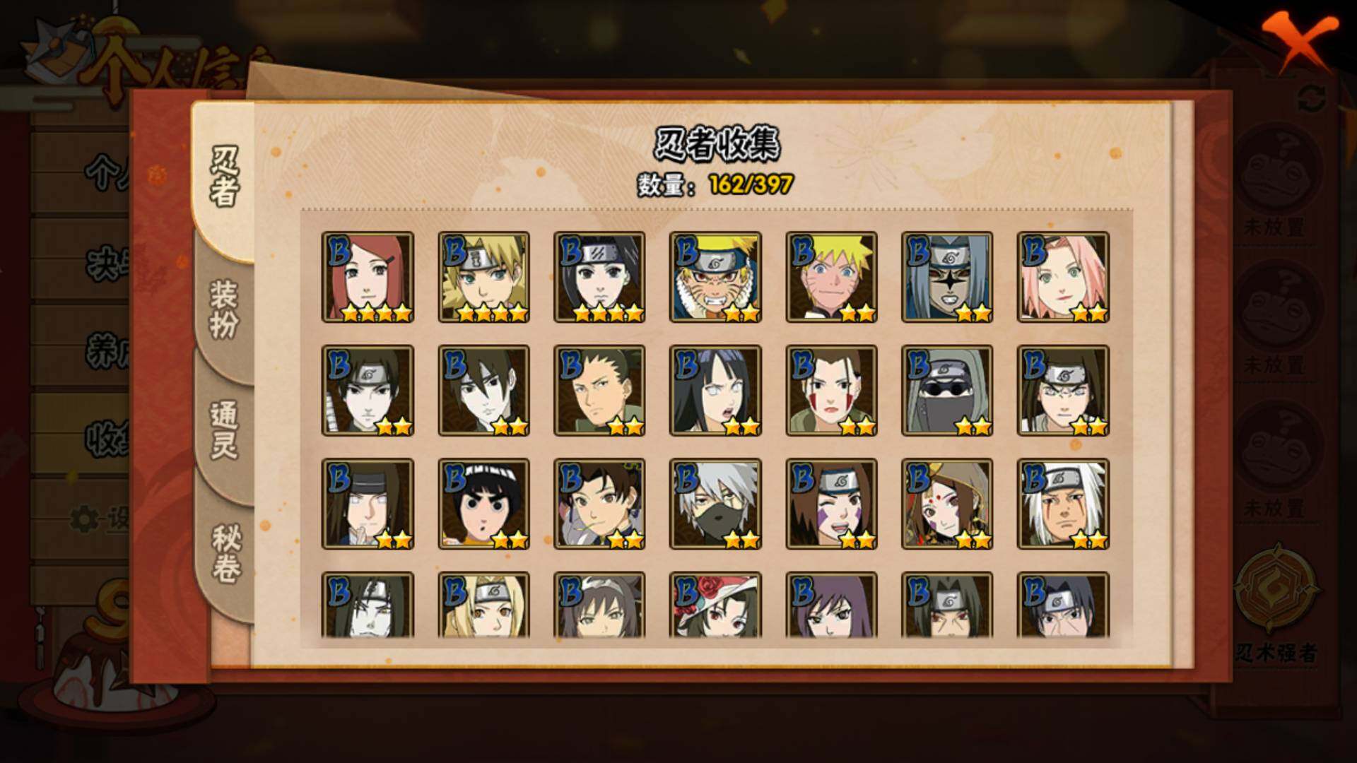 【S级忍者】:千手扉间「秽土转生」(3星),千手柱间「秽土转生」(3星),宇智波斑「秽土转生·解」(3星),春野樱「忍界大战」(3星),宇智波带土「忍界大战」(3星),艾「忍界大战」(3星),宇智波止水「须佐能乎」(3星),旗