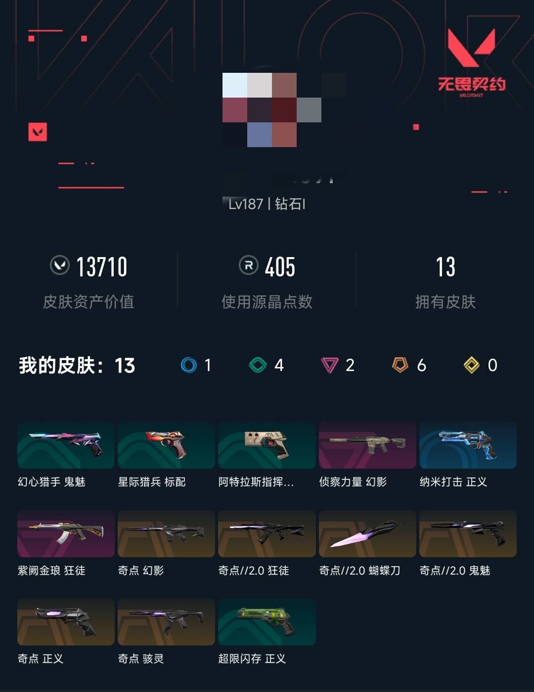 终极*6/卓越*2/皮肤*13/等级*187/段位:钻石/