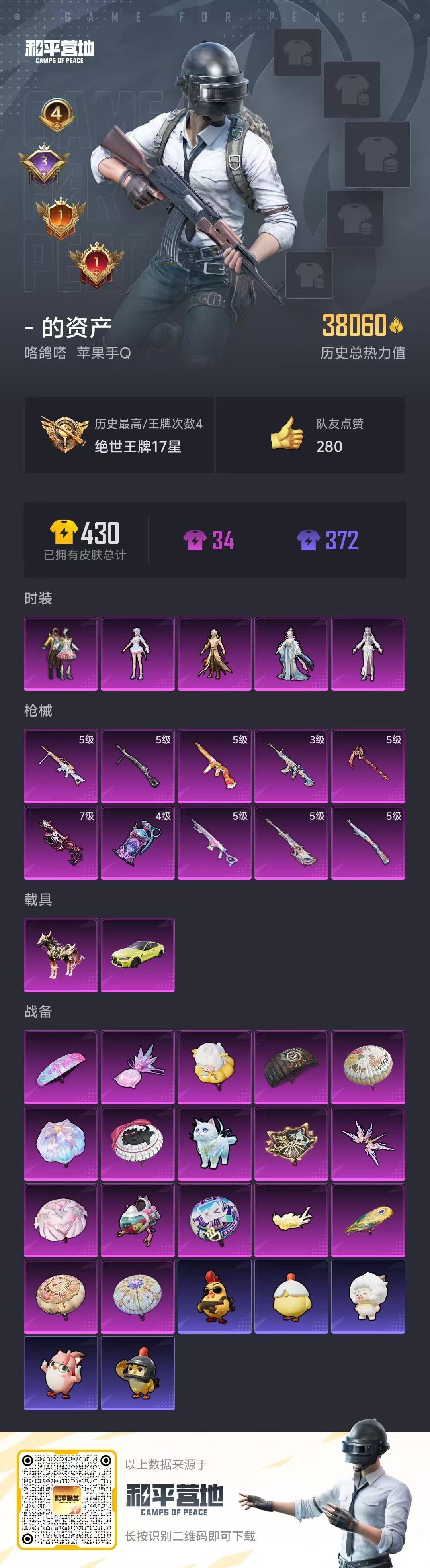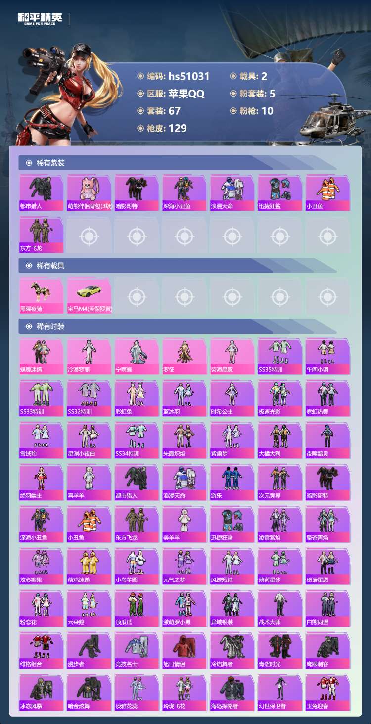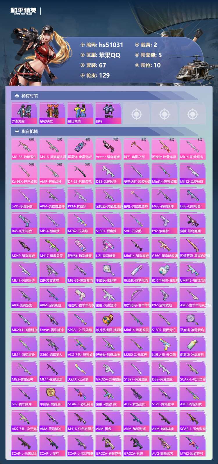 hs51031 苹果手Q-4王牌印记-5粉装-10特效枪-2载具-38060热力值-67套装-129