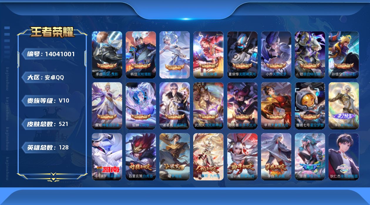 595-[14041001]皇冠号 贵族10 星耀2 贵族积分316977 有情人节限定天幕 安卓手Q154区521皮15典藏51传说1无双1珍品传说V10 营地ID347053121至尊星耀II【珍品传说皮肤】:怪盗基德【无双皮肤】:碎月剑心【荣耀典藏】:最初的交响,拾光映像,神鉴启示录,弑枪猎影,幻阙歌,银白咏叹调,星域神启,杀手不太冷,鸣剑·曳影,大秦宣太后,星空梦想,天鹅之梦,无限飓风号,倪克斯神谕,全息碎影【优质限定皮肤】:瑶时之祈愿,祈雪灵祝,白虎志,神威,天魔缭乱