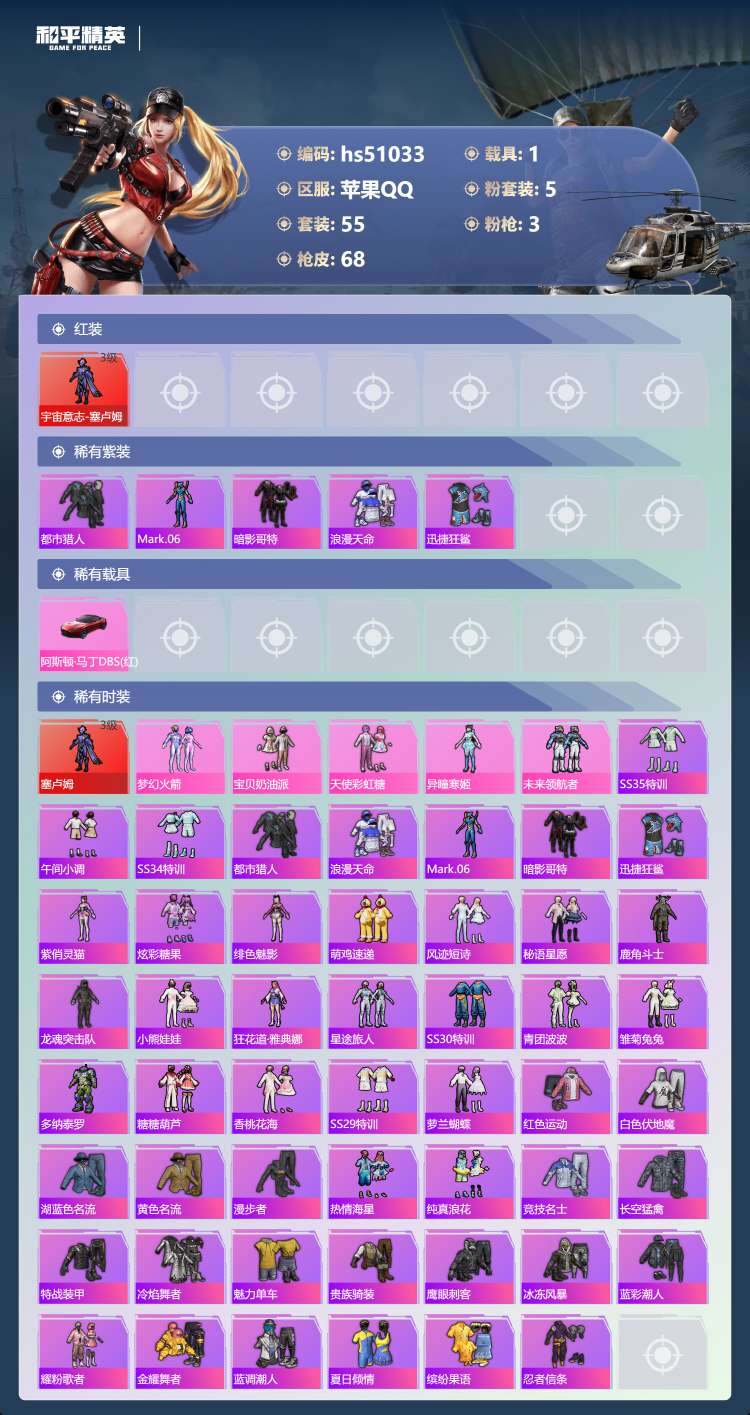 hs51033 苹果手Q-3王牌印记-有战神框-1红装-5粉装-3特效枪-1载具-26006热力值-