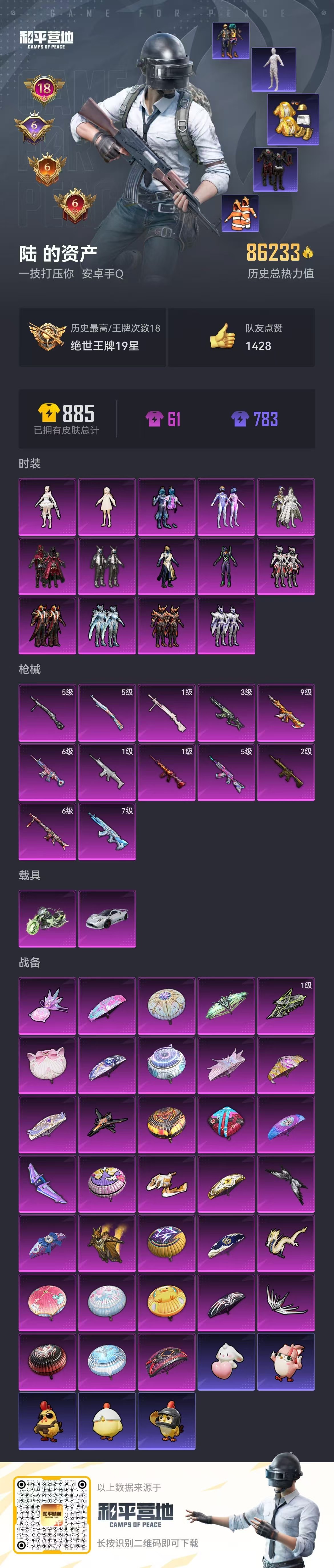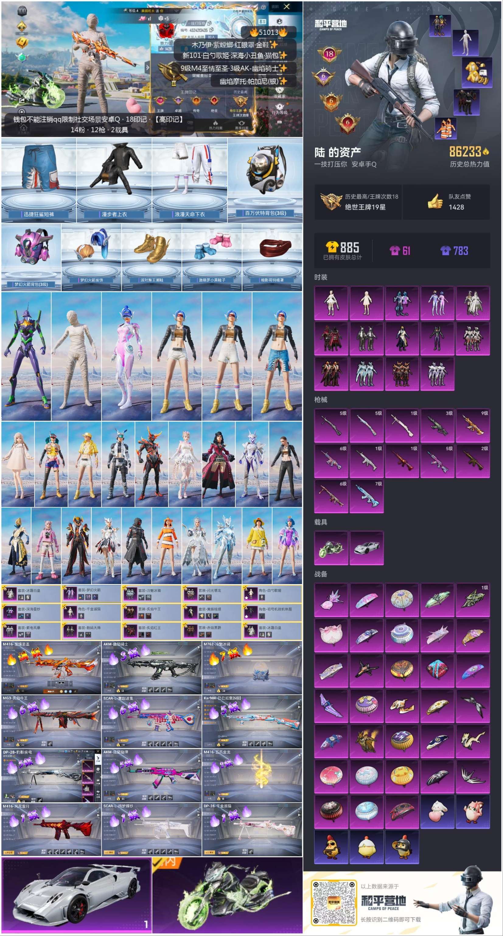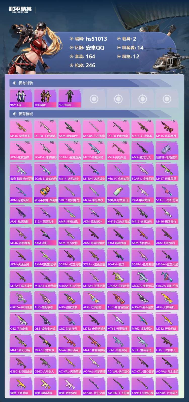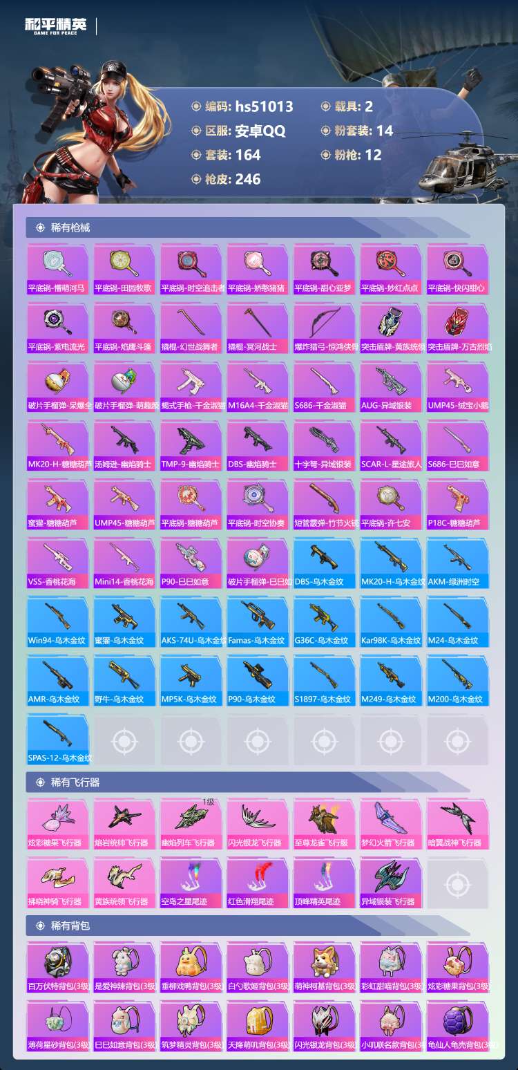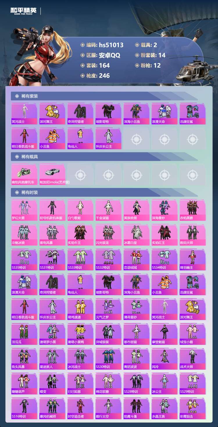 hs51013 安卓手Q-18王牌印记-14粉装-12特效枪-2载具-86233热力值-164套装-