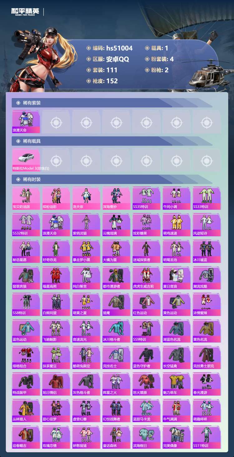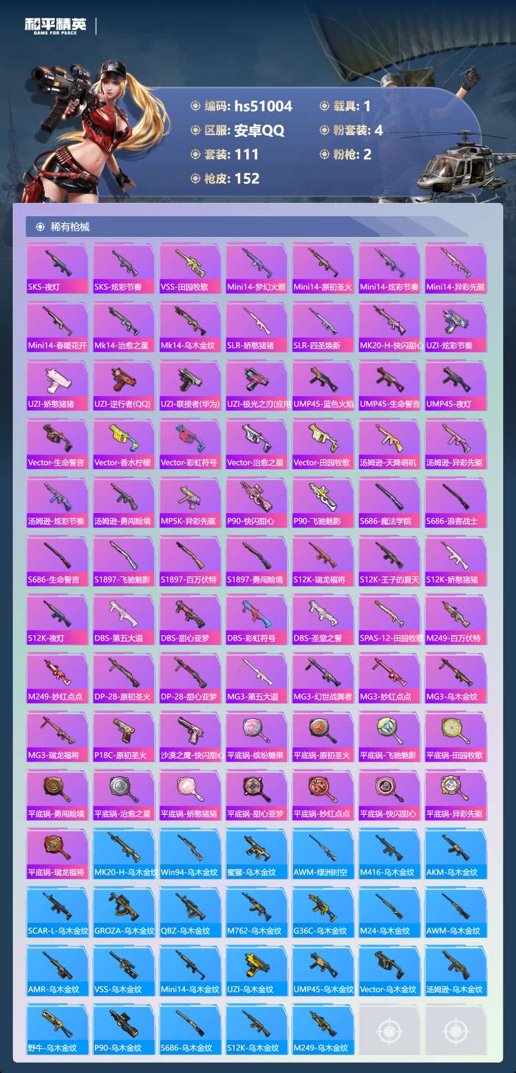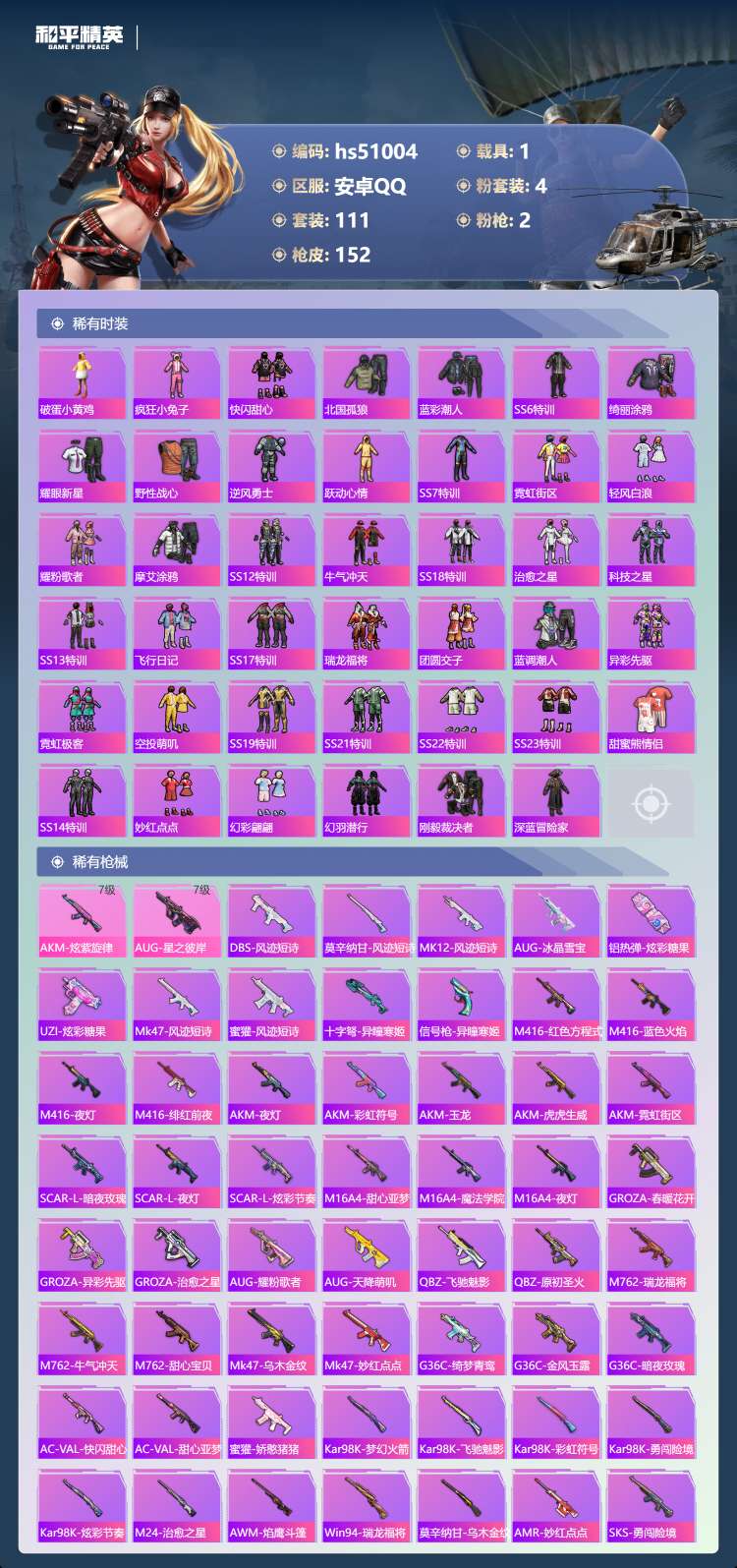 hs51004 安卓手Q-4王牌印记-4粉装-2特效枪-1载具-47745热力值-111套装-152